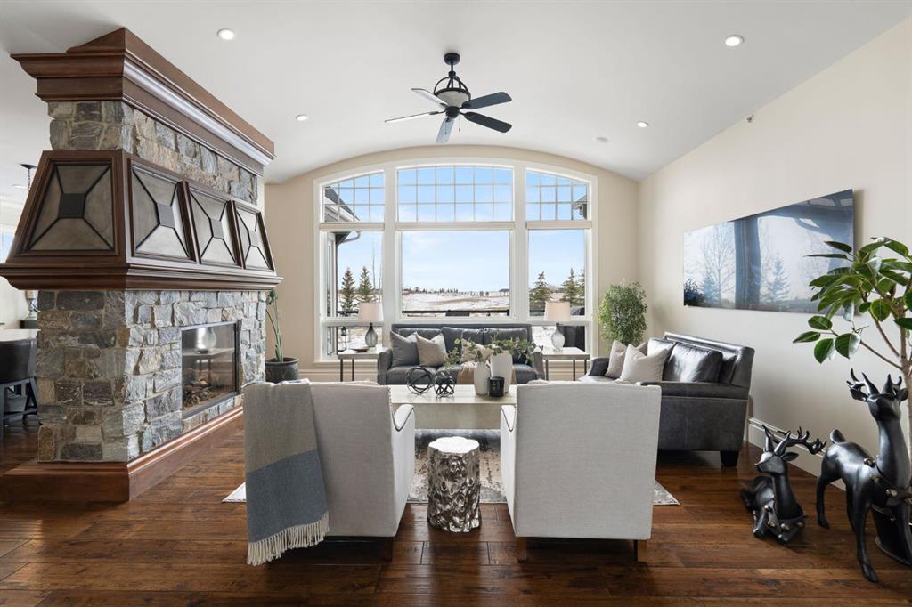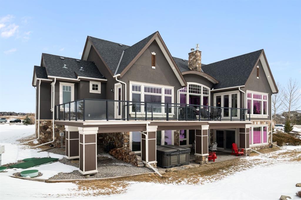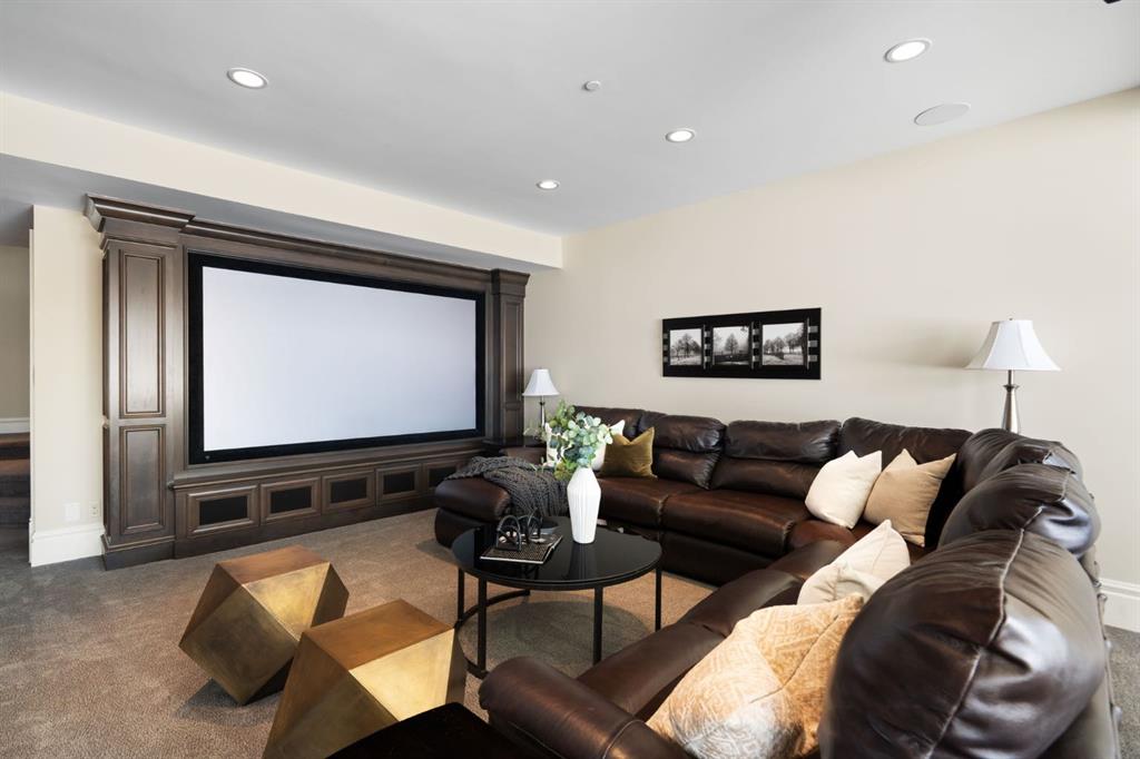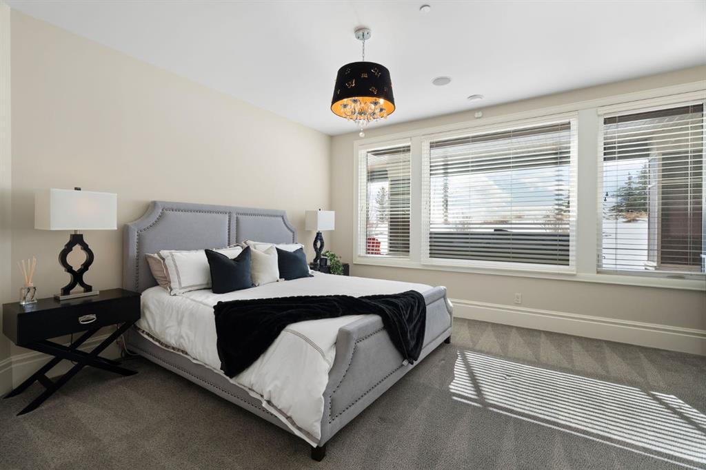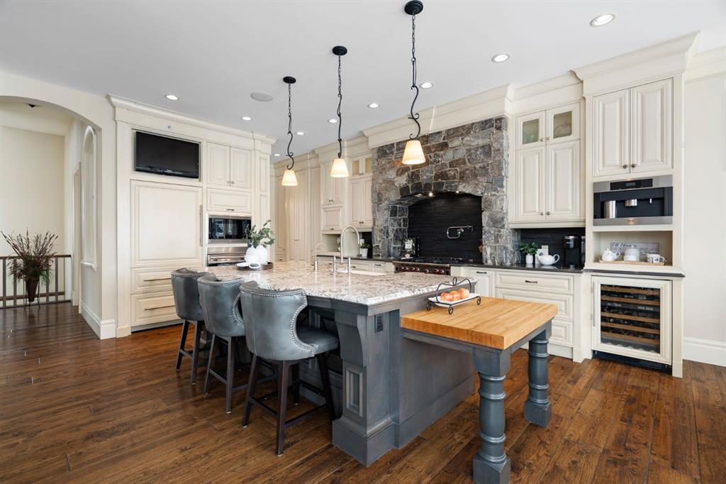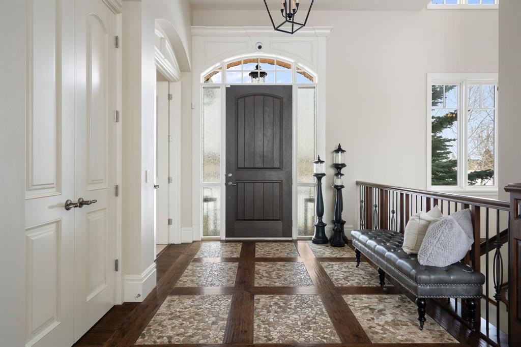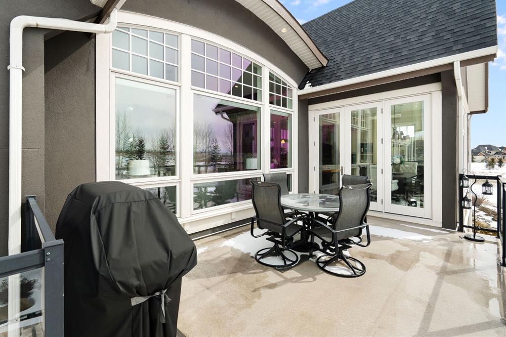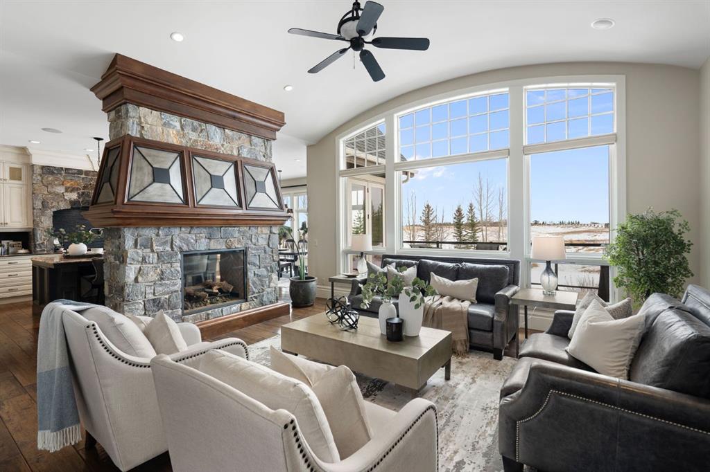 Set within the Willow Creek enclave of Bearspaw, just a 7-minute drive to Calgary city limits, this 4,700 sq. ft. BUNGALOW welcomes you with a gated stone entry surrounded by mature, professionally landscaped grounds. Built in 2010 by Astoria Homes this previous showhome’s exterior architecture blends stone and brick with sculpted rooflines, while the interior features 12-foot ceilings, detailed millwork, and principal rooms oriented toward stunning MOUNTAIN VIEWS. The foyer showcases stone inlay set into hickory hardwood flooring, immediately reflecting the CRAFTSMANSHIP found throughout the home. A private office with bespoke built-ins and a leather-paneled coffered ceiling creates a refined, executive atmosphere. A fully integrated smart home Control4 system ensures seamless functionality. The main living area is anchored by a striking double-sided stone fireplace and soaring windows. Designed for entertaining, the kitchen centres around an oversized GRANITE island and features a full professional appliance package: Sub-Zero, Wolf, Miele brands including a built-in espresso machine. The kitchen boasts a dedicated wine service area offering seamless hosting to the bright dining space that opens onto a southwest-facing terrace, extending the living area outdoors. The laundry room is a retreat, including a statement island. The spacious primary suite offers private outdoor access and a luxurious ensuite with heated surfaces, a sculptural tub, and a multi-jet shower accented with marble tile detailing. A custom dressing room with pull-down rods adds both convenience and elegance, while marble tile and in-mirror televisions elevate the space. The walk-out lower level is designed for leisure and entertainment, featuring a theatre with a 4K PROJECTOR and full sound system, a billiards area, a fireplace lounge, a custom wet bar complete with microwave, dishwasher, and dedicated wine and beer refrigeration, a fitness room, and two additional bedrooms with a full bathroom. Thoughtfully positioned behind the bar is a WINE ROOM, ideal for the avid collector. Unique features such as inlaid countertop televisions and a steam bath further enhance the home’s luxury. Stepping out onto the back patio, you are welcomed by several spaces for relaxing either in the HOT TUB, down the hill to a fire pit area or up on the upper decks that overlook the landscaped yard. For maximum enjoyment of the beautiful native plants and trees the property has lawn and flower bed irrigation. The oversized 3-car garage with lots of overhead storage capacity also has a “man cave” with custom built-in cabinetry and TV and a private urinal. Recent upgrades include a newly redone driveway, fresh exterior paint, a Culligan WATER SYSTEM, full attic insulation, updated basement carpeting, and both electric and hydronic in-floor heating. This residence represents a rare combination of thoughtful design, high-end finishes, and advanced infrastructure in one of Bearspaw’s most established acreage communities.