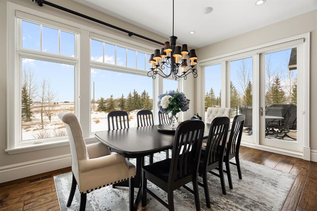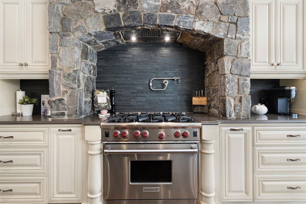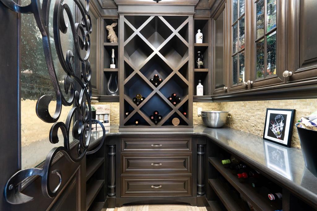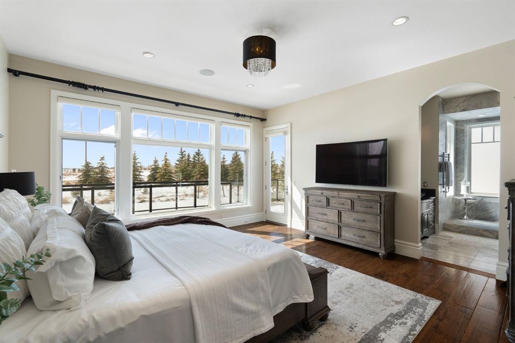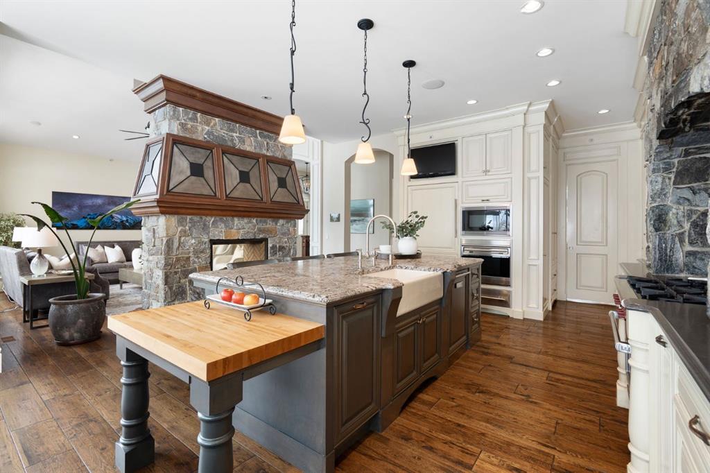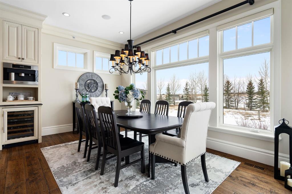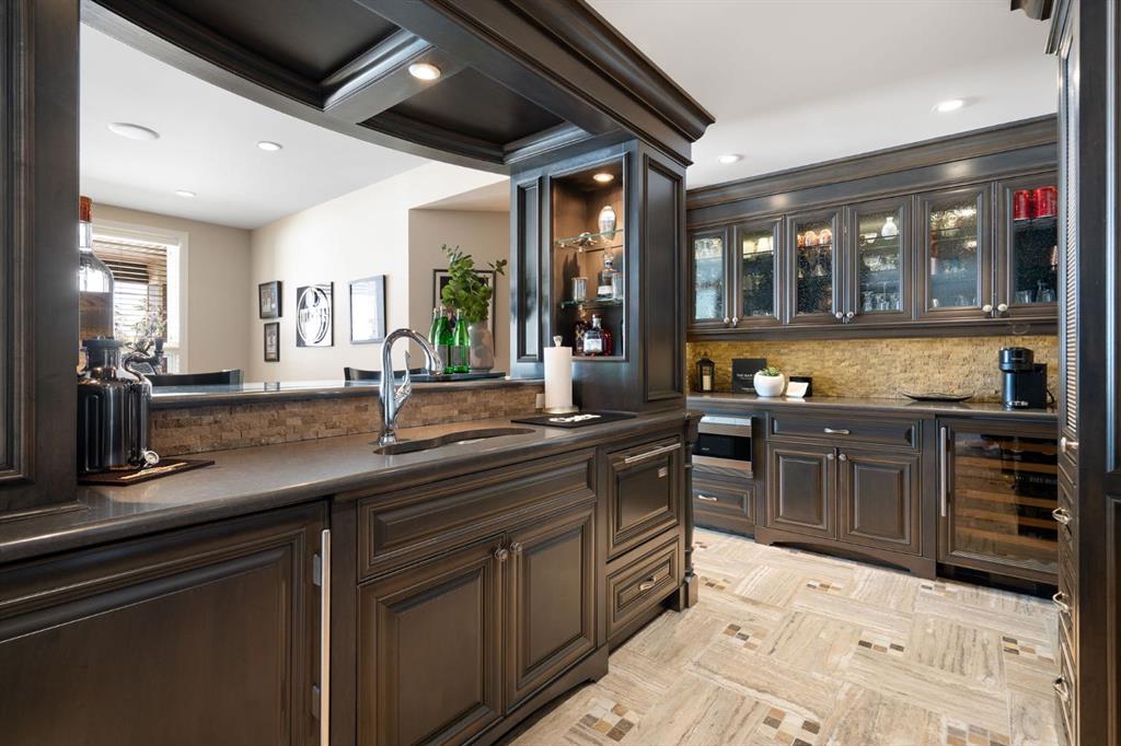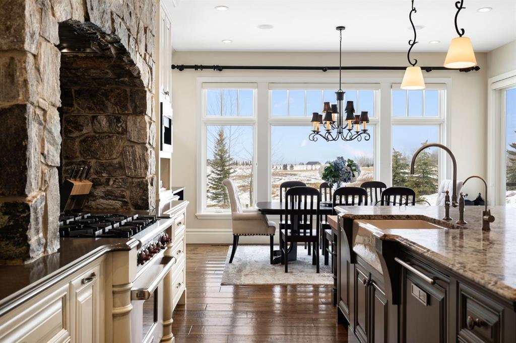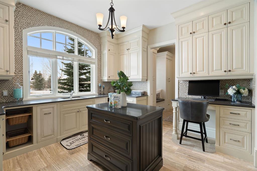 Set within the Willow Creek enclave of Bearspaw, just a 7-minute drive to Calgary city limits, this 4,700 sq. ft. BUNGALOW welcomes you with a gated stone entry surrounded by mature, professionally landscaped grounds. Built in 2010 by Astoria Homes this previous showhome’s exterior architecture blends stone and brick with sculpted rooflines, while the interior features 12-foot ceilings, detailed millwork, and principal rooms oriented toward stunning MOUNTAIN VIEWS. The foyer showcases stone inlay set into hickory hardwood flooring, immediately reflecting the CRAFTSMANSHIP found throughout the home. A private office with bespoke built-ins and a leather-paneled coffered ceiling creates a refined, executive atmosphere. A fully integrated smart home Control4 system ensures seamless functionality. The main living area is anchored by a striking double-sided stone fireplace and soaring windows. Designed for entertaining, the kitchen centres around an oversized GRANITE island and features a full professional appliance package: Sub-Zero, Wolf, Miele brands including a built-in espresso machine. The kitchen boasts a dedicated wine service area offering seamless hosting to the bright dining space that opens onto a southwest-facing terrace, extending the living area outdoors. The laundry room is a retreat, including a statement island. The spacious primary suite offers private outdoor access and a luxurious ensuite with heated surfaces, a sculptural tub, and a multi-jet shower accented with marble tile detailing. A custom dressing room with pull-down rods adds both convenience and elegance, while marble tile and in-mirror televisions elevate the space. The walk-out lower level is designed for leisure and entertainment, featuring a theatre with a 4K PROJECTOR and full sound system, a billiards area, a fireplace lounge, a custom wet bar complete with microwave, dishwasher, and dedicated wine and beer refrigeration, a fitness room, and two additional bedrooms with a full bathroom. Thoughtfully positioned behind the bar is a WINE ROOM, ideal for the avid collector. Unique features such as inlaid countertop televisions and a steam bath further enhance the home’s luxury. Stepping out onto the back patio, you are welcomed by several spaces for relaxing either in the HOT TUB, down the hill to a fire pit area or up on the upper decks that overlook the landscaped yard. For maximum enjoyment of the beautiful native plants and trees the property has lawn and flower bed irrigation. The oversized 3-car garage with lots of overhead storage capacity also has a “man cave” with custom built-in cabinetry and TV and a private urinal. Recent upgrades include a newly redone driveway, fresh exterior paint, a Culligan WATER SYSTEM, full attic insulation, updated basement carpeting, and both electric and hydronic in-floor heating. This residence represents a rare combination of thoughtful design, high-end finishes, and advanced infrastructure in one of Bearspaw’s most established acreage communities.