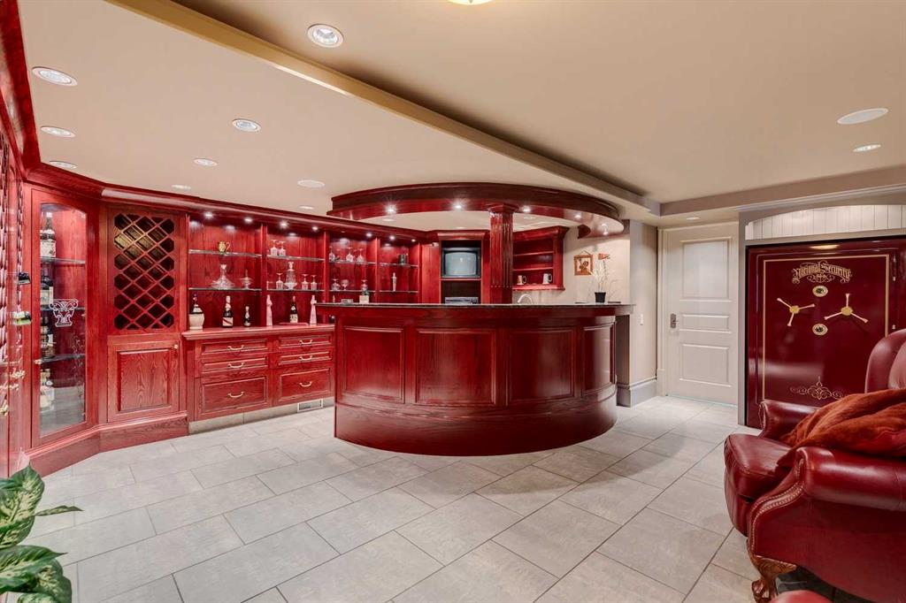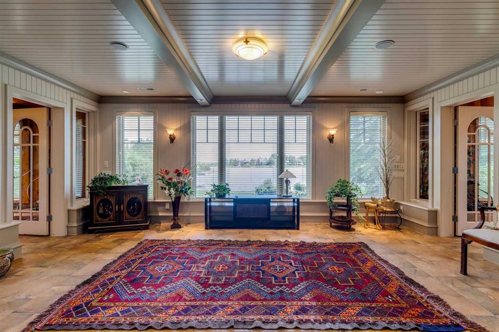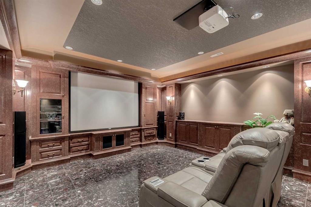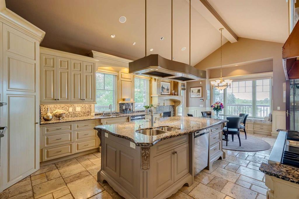 Discover one of the most iconic estate homes offered in prestigious Elbow Valley Estates—an extraordinary custom residence that combines European grandeur, architectural artistry, and exceptional craftsmanship. Perfectly positioned on a private lakefront lot, this executive walkout bungalow offers over 8000 square feet of exquisitely developed living space, designed with precision over years of thoughtful planning and executed by master artisans. From the moment you enter the grand foyer with its coffered and barrel-vaulted ceilings, it’s clear this is a home unlike any other. The main level features a sun-drenched great room with a double-sided fireplace and expansive windows framing unobstructed lake views. The heart of the home is the richly appointed ‘French Manor’ inspired kitchen—equipped for grand-scale entertaining with granite countertops, top-tier appliances including a Sub-Zero refrigerator, gas range with pot filler, two dishwashers, and a walk-in pantry. A cozy breakfast nook with fireplace and access to the expansive upper deck provides the perfect spot for morning coffee overlooking the water (with handi-cap access). An elegant formal dining room with custom glass cabinetry, a fully paneled library/office with fireplace, and a large laundry/sewing/hobby room complete the main level. A reverse osmosis water system is conveniently located in the craft room. The luxurious primary suite is a private sanctuary, featuring a vaulted sleeping area, two-way fireplace, and a spa-inspired circular ensuite with bubbling soaker tub, walk-in shower, dual vanities, and a generous dressing room with built-ins. The suite also offers deck access to enjoy tranquil lake views. A versatile loft functions as a full office or creative workspace, complete with multiple workstations—ideal for today's remote professional or growing family. The lower level is designed for recreation and relaxation, boasting an authentic English-style pub with a full wet bar, games room, media/theatre room, and three additional spacious bedrooms—each with their own private ensuite and walk-in closet. Three solariums enhance the lower level, offering a fully enclosed hot tub retreat, home gym, and peaceful sitting room, all flooded with natural light. This remarkable residence is equipped with countless thoughtful upgrades, including two newer air conditioning units, newer hot water tank and sump pump, new sinks and hardware in the craft room and kitchen . The property also features a recently serviced irrigation system. Designed for effortless living, this home includes hydronic in-floor heating on all levels, a dramatic central staircase, private elevator, and a heated triple garage. Every detail reflects unparalleled quality and meticulous attention throughout. Outdoor living is equally exceptional, with sweeping views of the lake and beautifully landscaped grounds—an entertainer’s dream and a private oasis.