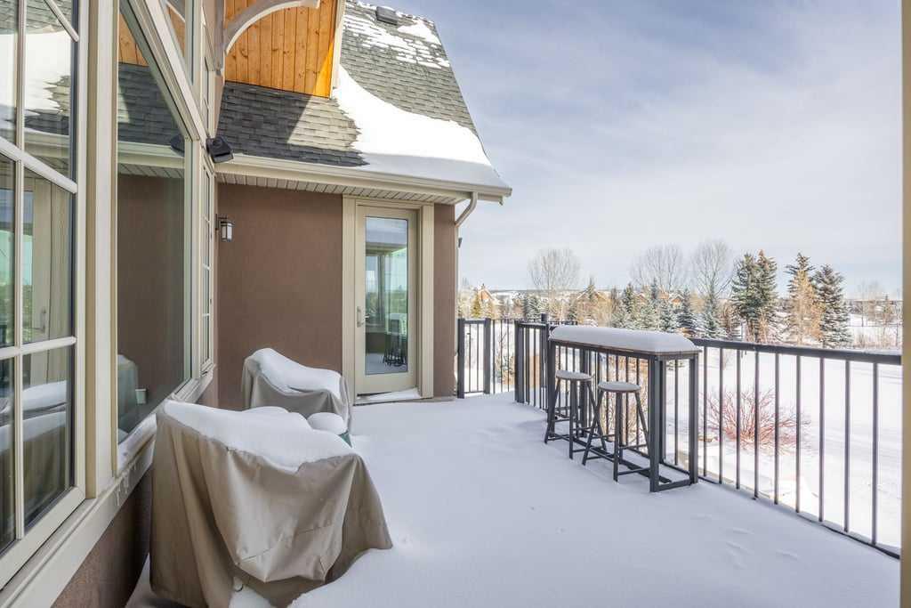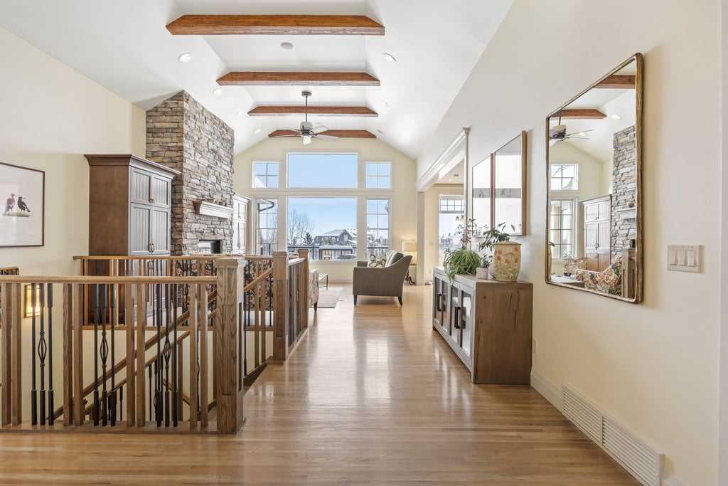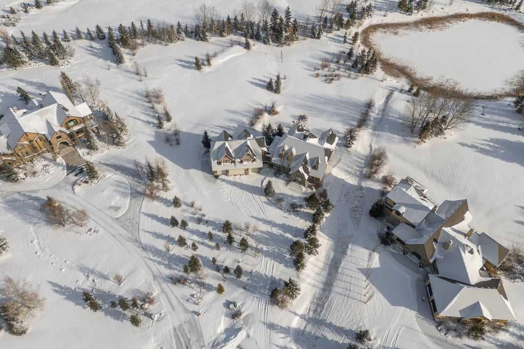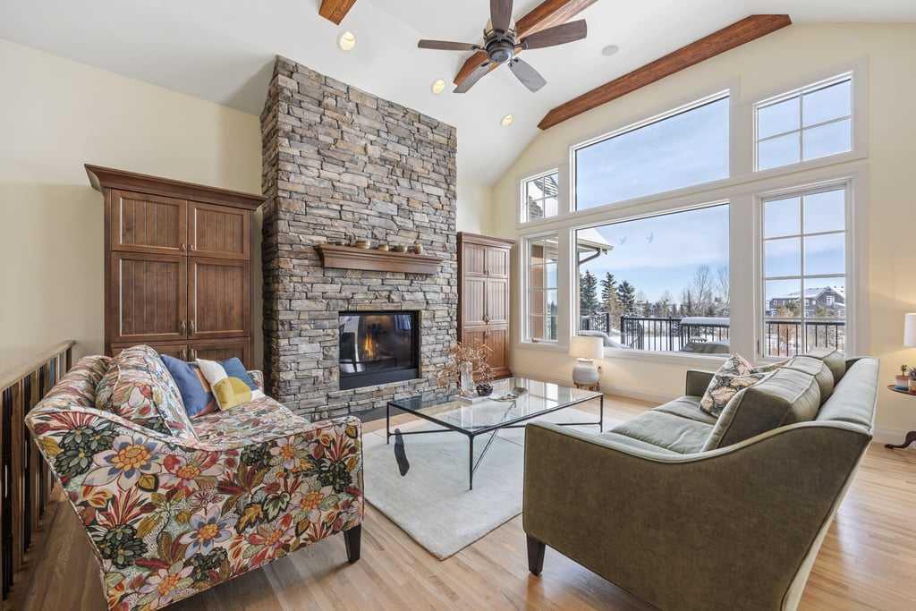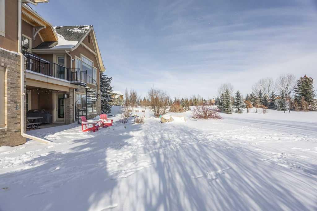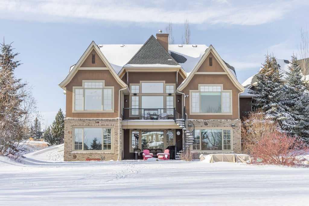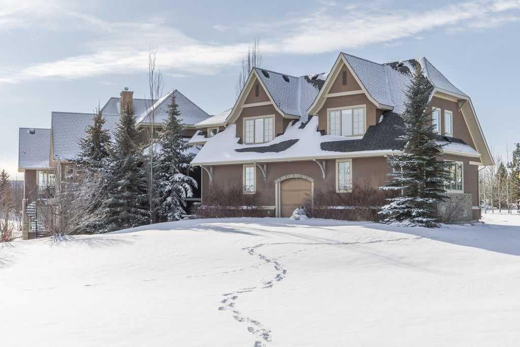 Set on over 2 acres of beautifully treed land, this exceptional Springbank home offers a rare blend of privacy, space, and refined comfort, all just minutes from west Calgary amenities and top schools. A curved driveway winds through mature landscaping, creating a strong sense of arrival as the home comes into view. Inside, soaring vaulted ceilings with exposed beams and rich hardwood floors set the tone in the main living area, where a striking stone fireplace anchors the space and invites both quiet evenings and larger gatherings. The kitchen is designed for both everyday living and entertaining, featuring integrated Thermador appliances, a walk-in pantry, a generous island with seating, and thoughtful details like a built-in wine rack. The adjacent dining area is surrounded by views of the natural landscape and opens onto a private balcony, extending your living space outdoors. The main floor primary suite is positioned to take full advantage of the peaceful setting, with views toward the pond and a well-appointed ensuite complete with dual vanities, a soaker tub, steam shower, heated floors, and separate walk-in closets. An office, along with a functional mudroom and laundry space with built-ins, completes the main level. Upstairs, a dedicated family zone offers two spacious bedrooms, a full bathroom, and a flexible recreation or study area, ideal for growing families. The walkout lower level is bright and expansive, designed for both relaxation and entertainment. Heated floors run throughout, with spaces that include a wet bar, wine cellar, theatre area, gym, and multiple recreation areas, along with two additional bedrooms and a full bathroom for guests. Outdoors, the property feels like a private retreat. Mature trees, two patio areas, a tranquil water feature with a flowing stream, and a firepit setting near the pond create multiple spaces to unwind or host throughout the seasons. Additional features include an oversized four-car garage with access to both the front and rear of the property, air conditioning, and whole-home audio. Residents also enjoy community features such as pond maintenance and seasonal stocking through the HOA. Located within the Springbank school system and close to Calgary’s leading private schools, with convenient access west to the mountains, this is a rare opportunity to own a truly special property in a sought-after setting.