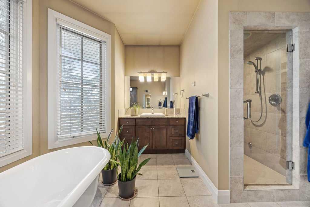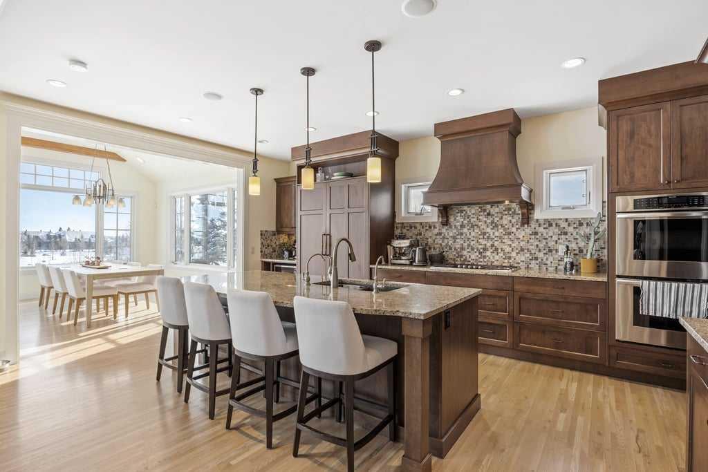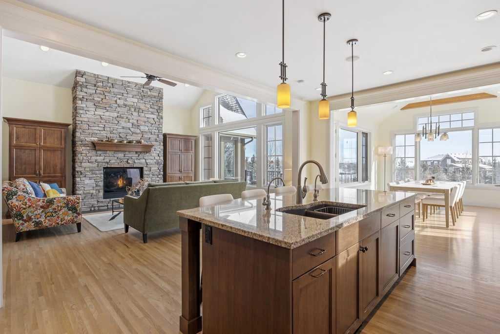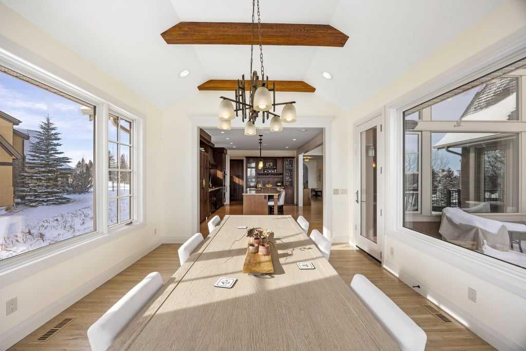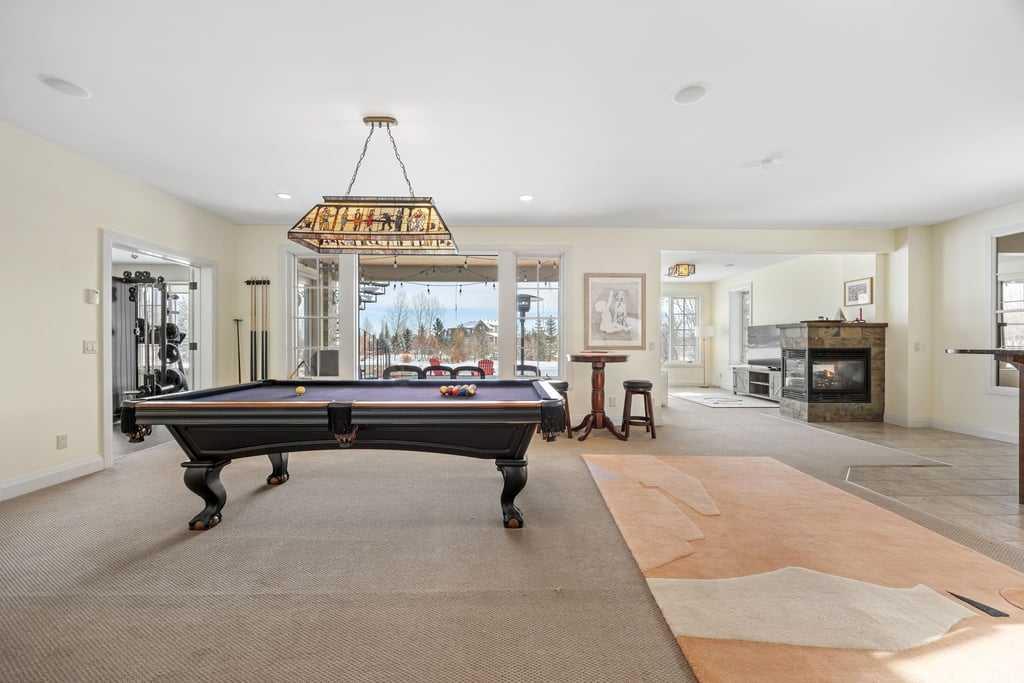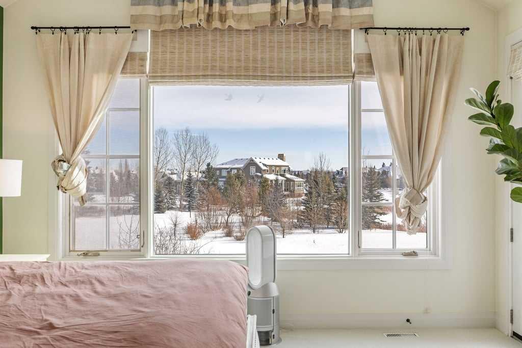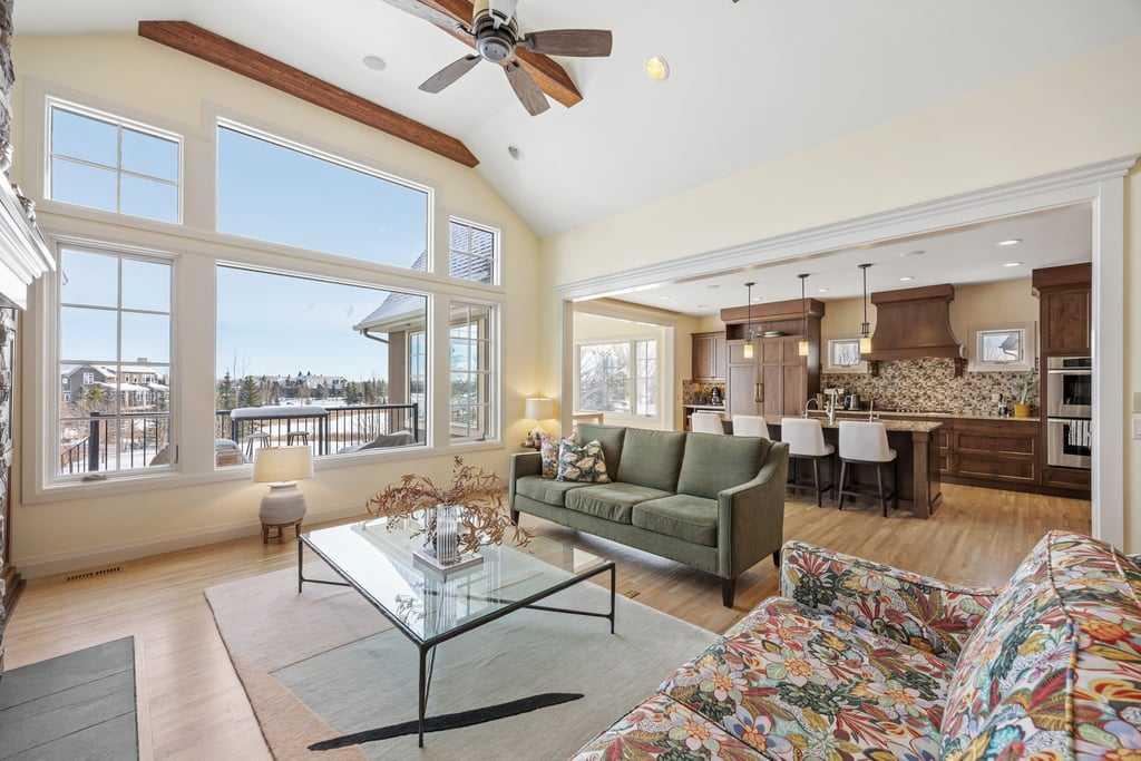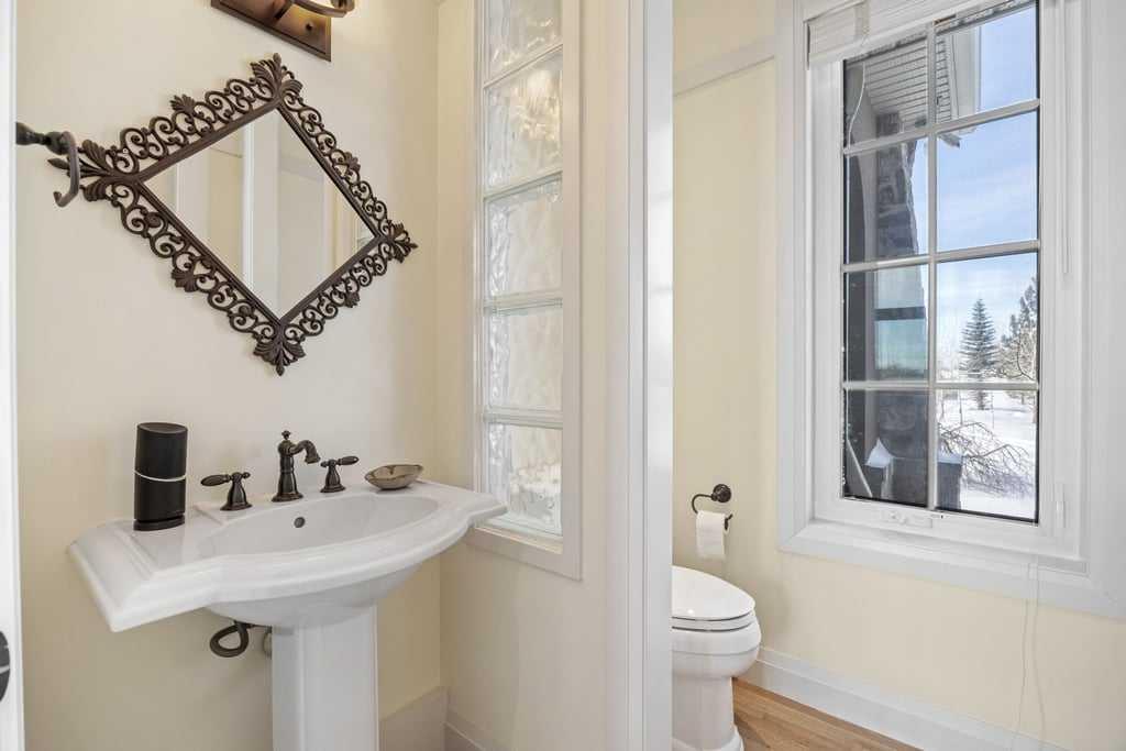 Set on over 2 acres of beautifully treed land, this exceptional Springbank home offers a rare blend of privacy, space, and refined comfort, all just minutes from west Calgary amenities and top schools. A curved driveway winds through mature landscaping, creating a strong sense of arrival as the home comes into view. Inside, soaring vaulted ceilings with exposed beams and rich hardwood floors set the tone in the main living area, where a striking stone fireplace anchors the space and invites both quiet evenings and larger gatherings. The kitchen is designed for both everyday living and entertaining, featuring integrated Thermador appliances, a walk-in pantry, a generous island with seating, and thoughtful details like a built-in wine rack. The adjacent dining area is surrounded by views of the natural landscape and opens onto a private balcony, extending your living space outdoors. The main floor primary suite is positioned to take full advantage of the peaceful setting, with views toward the pond and a well-appointed ensuite complete with dual vanities, a soaker tub, steam shower, heated floors, and separate walk-in closets. An office, along with a functional mudroom and laundry space with built-ins, completes the main level. Upstairs, a dedicated family zone offers two spacious bedrooms, a full bathroom, and a flexible recreation or study area, ideal for growing families. The walkout lower level is bright and expansive, designed for both relaxation and entertainment. Heated floors run throughout, with spaces that include a wet bar, wine cellar, theatre area, gym, and multiple recreation areas, along with two additional bedrooms and a full bathroom for guests. Outdoors, the property feels like a private retreat. Mature trees, two patio areas, a tranquil water feature with a flowing stream, and a firepit setting near the pond create multiple spaces to unwind or host throughout the seasons. Additional features include an oversized four-car garage with access to both the front and rear of the property, air conditioning, and whole-home audio. Residents also enjoy community features such as pond maintenance and seasonal stocking through the HOA. Located within the Springbank school system and close to Calgary’s leading private schools, with convenient access west to the mountains, this is a rare opportunity to own a truly special property in a sought-after setting.