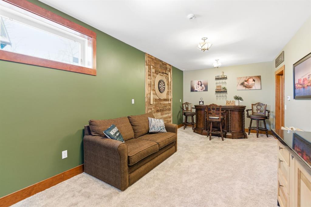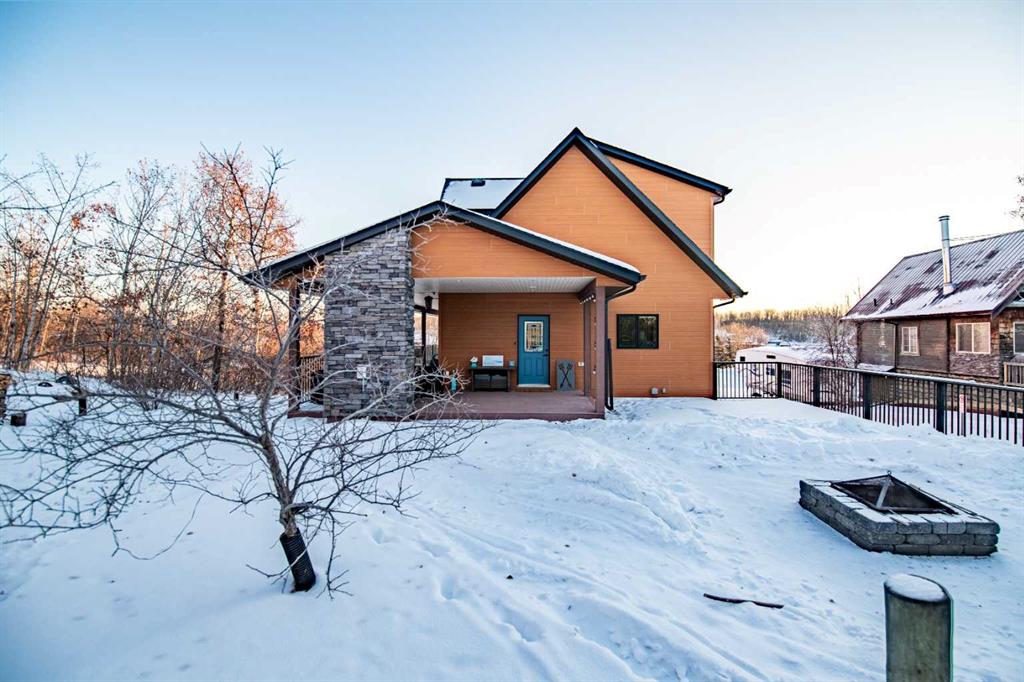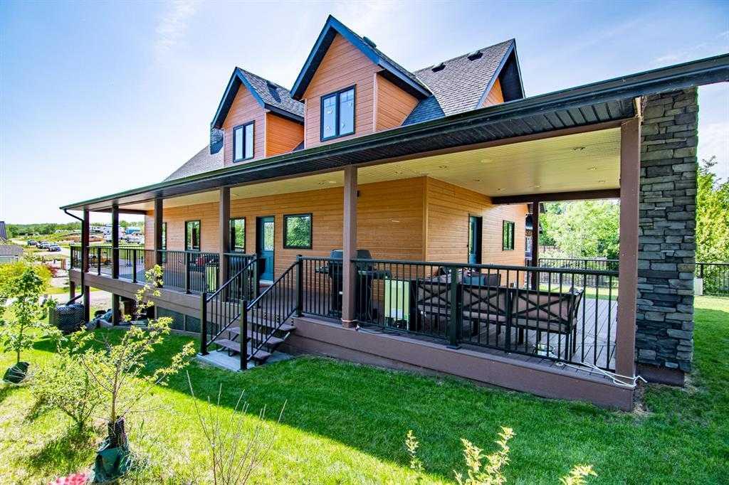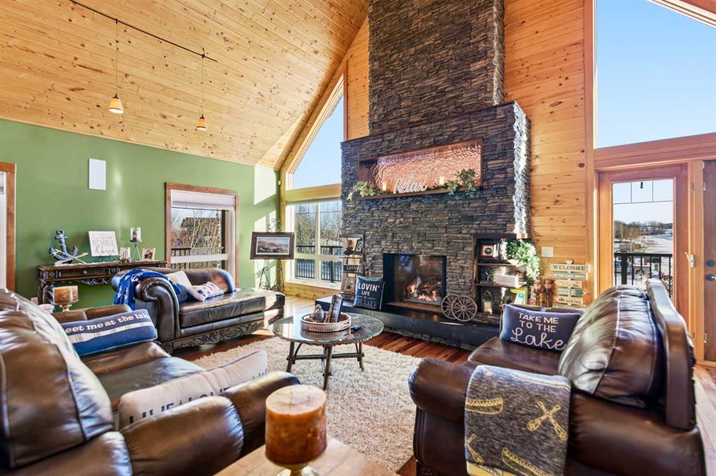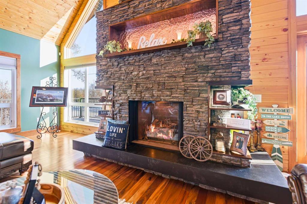 Located at one of Alberta’s largest lakes, Buffalo Lake is truly one of the area’s best-kept secrets. Welcome to Buffalo Sands, a close-knit lake community offering a four-season lifestyle ideal for weekend escapes, unwinding after work or full-time living. This exceptional lakehouse-inspired chalet is not an A-frame cabin, but a thoughtfully designed home with architectural character, warmth and timeless appeal. This beautifully maintained 1½-storey, fully finished home features a front walkout entry-level with 9’ ceilings and in-floor heating, offering comfort and practicality year-round. The attached double heated garage (12’6” x 33’6”) is fully finished, painted, wired and includes a floor drain, upgraded lighting, new electrical panel, and generator hook-up panel. Step inside to a welcoming tiled foyer with generous storage and a stylish 2-piece bathroom. A few steps up, the great room impresses with soaring 19’ vaulted ceilings, polished hardwood floors and a stunning floor-to-ceiling stone fireplace with copper insert, framed by stone pillars inside and out. Large windows flood the space with natural light and showcase tranquil views. The kitchen is designed for both everyday living and entertaining, featuring polished concrete countertops, a premium WOLF gas stove, stainless steel appliance package, corner sink, pantry, breakfast bar and a custom coffee station. Three doors provide seamless access to the massive three-sided wrap-around covered deck, perfect for hosting or relaxing outdoors. The primary bedroom offers a walk-in closet with built-in organizers and a spa-inspired ensuite with an upgraded steam walk-in tiled shower and glass doors. The upper-level loft overlooks the main living space and includes two additional bedrooms and a 4-piece bathroom—ideal for guests, family a library or office nook and direct access to a covered outdoor courtyard complete with a gas fireplace. The entry-level walkout features in-floor heat, a newly created recreation room/could be additional bedroom with plush carpeting, cabinetry and feature dart wall, a large utility/laundry room with epoxy flooring and extensive storage, workshop/boiler room. Outdoor features include multiple conversation areas a fire pit and maintenance-free decking with storage underneath. Recent upgrades include new WOLF stove, stainless refrigerator, Samsung washer/dryer, boiler, furnace and A/C unit, hot water tank, sound system (inside and out), lighting upgrades, paint, cabinetry refinishing, garage improvements, widened driveway, additional parking pad, landscaping/ new sod and stone enhancements. A unique highlight is the walking trail behind the home providing direct access to the lake, beach, docks, playgrounds, pond - skate, canoe or country ski on trails. The property includes the right to boat slip in the community marina (on separate title). Full time residence or your new income / rental escape! This is lake living at its finest-be prepared for love at first sight.