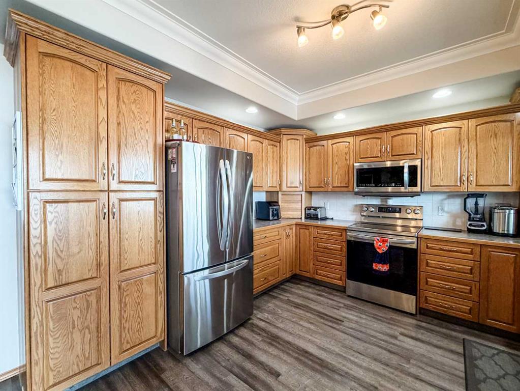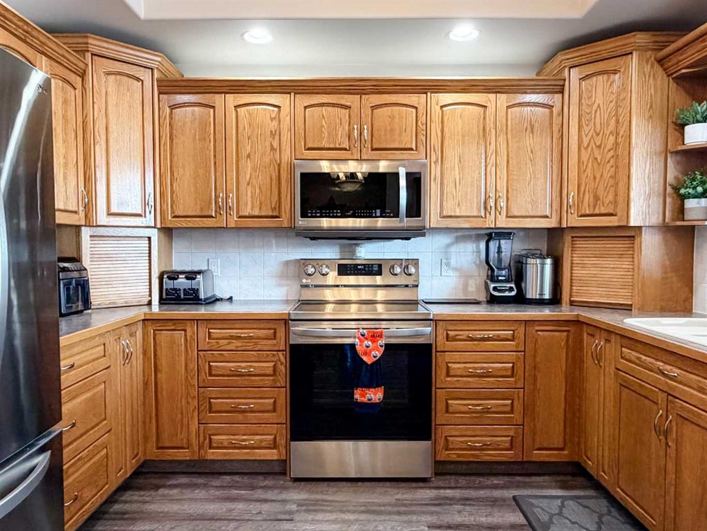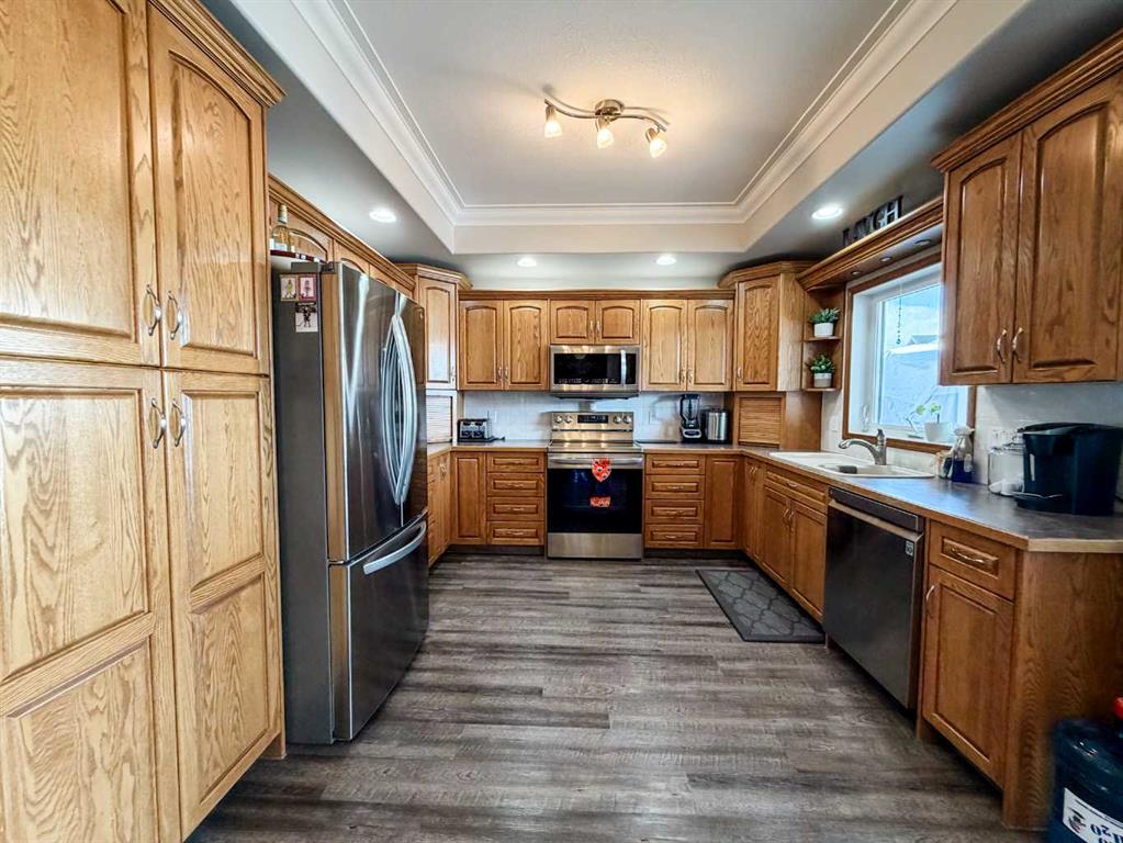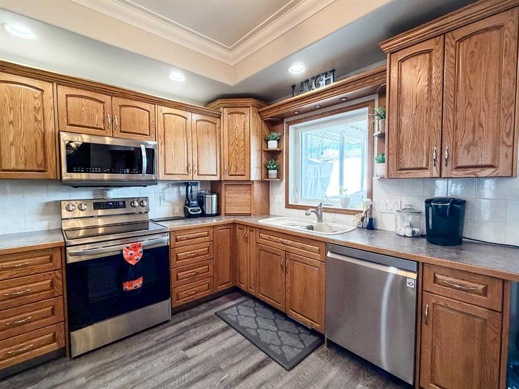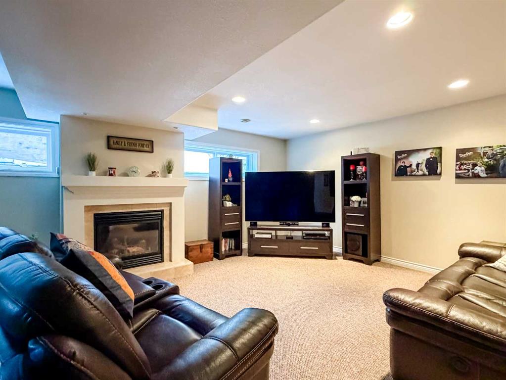 Welcome Home to Your Dream Family Retreat! Nestled in Meadowlands in our fabulous town of Stettler, this remarkable four bedroom bungalow is the epitome of family living. Step inside to discover a spacious and inviting main floor featuring two generous bedrooms, a sunlit living room and a cozy gas fireplace that sets the perfect ambience for gatherings. The functional U-shaped kitchen boasts plenty of cabinet and counter-space . Just off the kitchen a door leads to a charming covered patio, ideal for enjoying morning coffees or evening barbecues. Venture downstairs to find a large family room complete with a beautiful fireplace, creating a perfect space for relaxation and fun. Two additional bedrooms in the basement offer privacy and versatility, catering to your family's needs. With in-floor heating in the basement and garage, comfort is guaranteed year-round. The beautifully fenced and landscaped backyard ensures a secure and inviting outdoor space for children to play. Bonus: RV parking pad, central air, newer flooring and appliances! This home is a true treasure, situated in an excellent neighbourhood and in fantastic condition, offering exceptional value and ready to welcome its new owners.