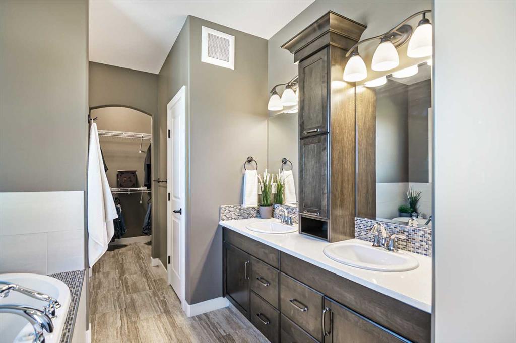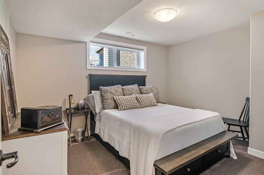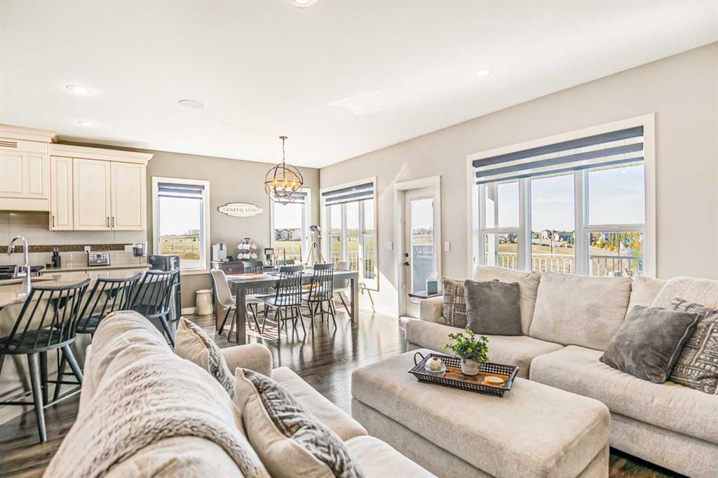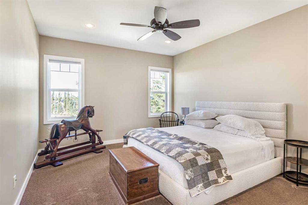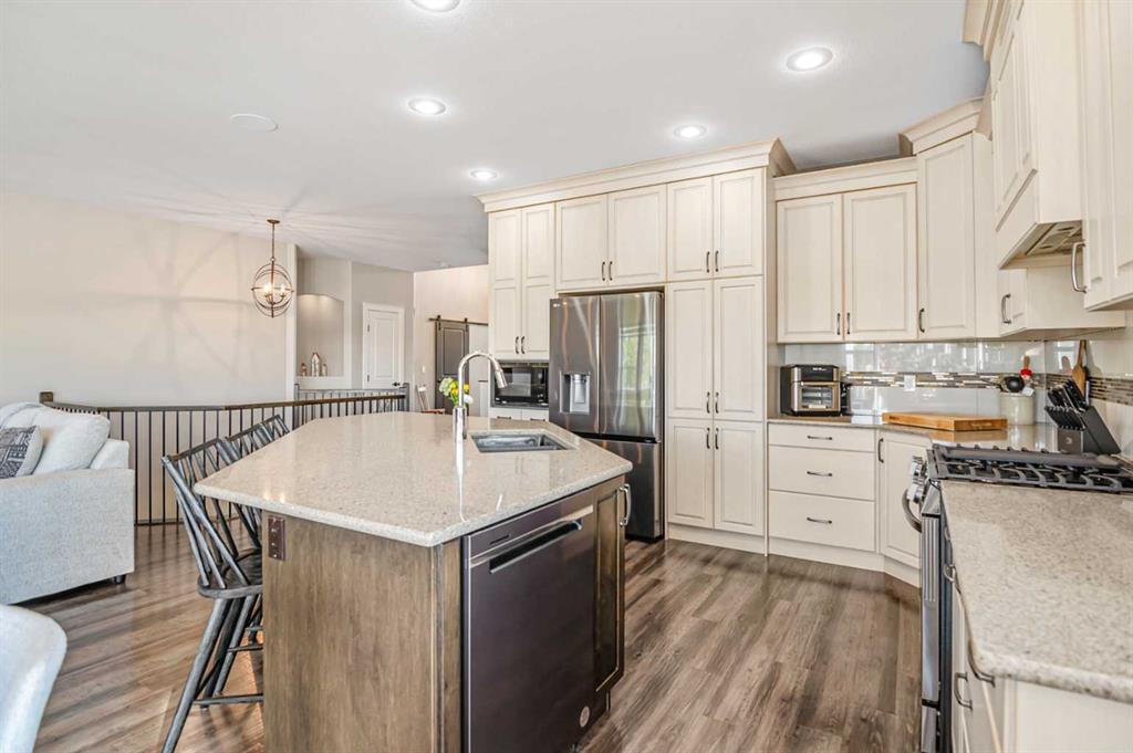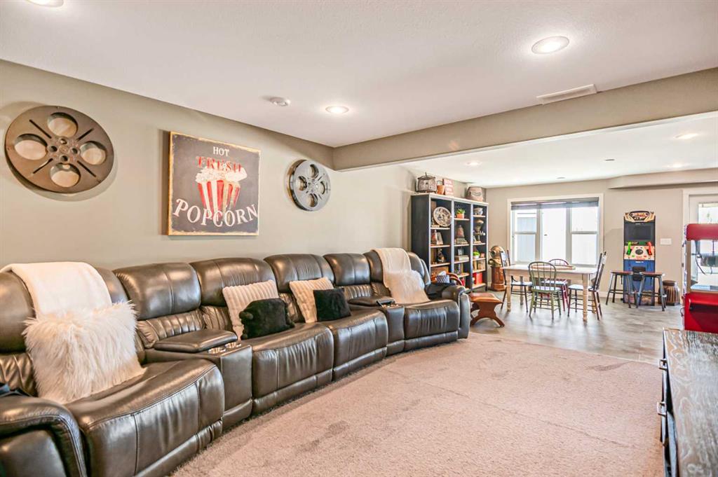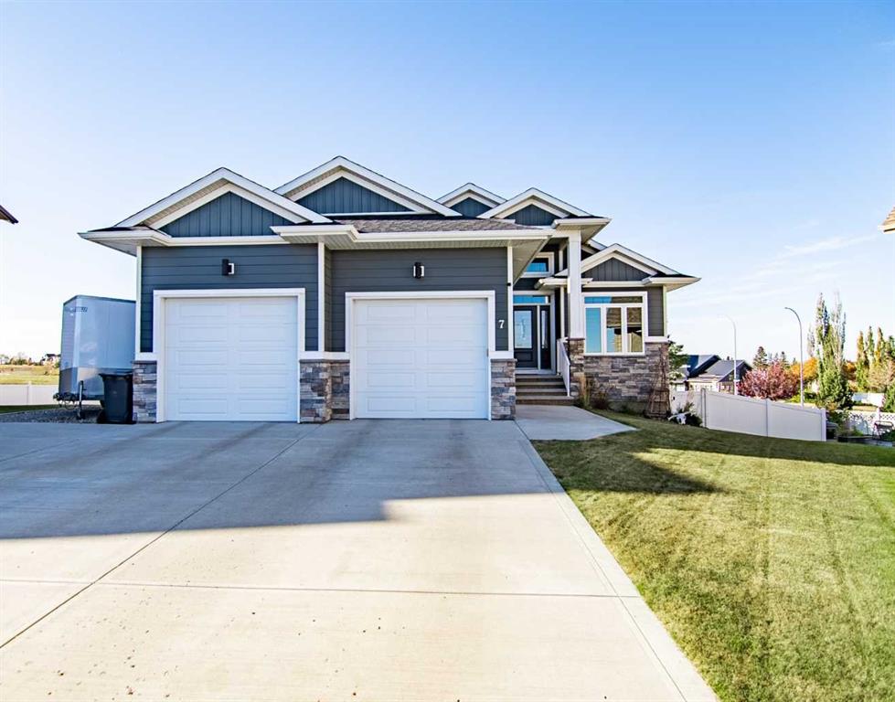 Exceptionally designed five bedroom, three bathroom walkout bungalow on a sprawling pie-shaped lot with RV parking, rear yard access, and located in one of the most admired closes in Sylvan Lake! The exterior showcases beautiful stonework and durable Hardie Board siding, while the grand entry welcomes you with elevated ceilings and decorative lighting. The open concept main floor features a gourmet kitchen with updated appliances, granite countertops, soft-close custom cabinetry with crown moulding, a large island, and tile backsplash, adjoining the bright dining and living area. The primary suite offers a private retreat with a luxurious ensuite including dual sinks, soaker tub, separate shower, and a walk-in closet. Two additional bedrooms, a laundry room with cabinetry, mudroom, and another full bathroom complete the main level. The fully finished walkout basement is an entertainer’s dream with a large family room, wet bar with wine fridge, theatre space, and two additional bedrooms with walk-in closets and no-touch switches. The full bath features dual vanities and a sliding privacy door. The lower level is complete with additional storage and fair sized utility space that offers updated furnace equipment with UV light filtration, water softener, in-floor heat to keep toasty. Enjoy lake views and fireworks from the west facing deck with Duradeck finish and built-in speakers. The backyard oasis includes a partially covered patio with screens, two custom sheds, black aluminum greenhouses with planters, raised garden beds with solar lights, and drive-through yard access. The heated double garage has a floor drain, and the extended driveway offers ample parking including a 31ft RV pad with hookups and sanitary dump. Pride of ownership shows inside and out, in a welcoming close known for its block parties and caring demeanour. The location is ideal being so close to parks, schools, shopping, and lake itself.