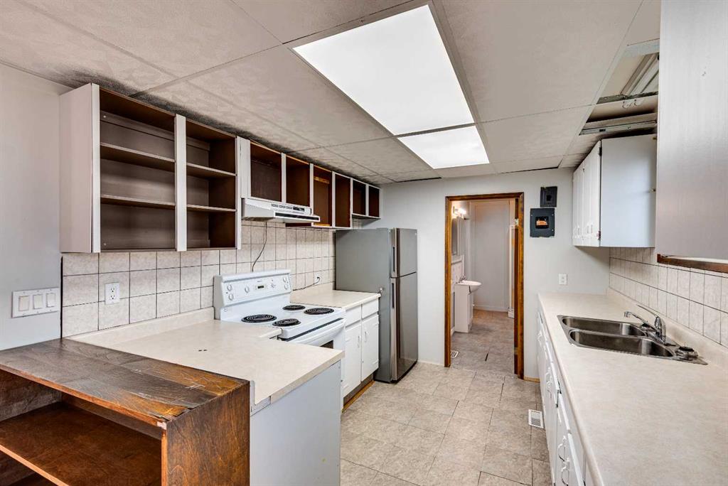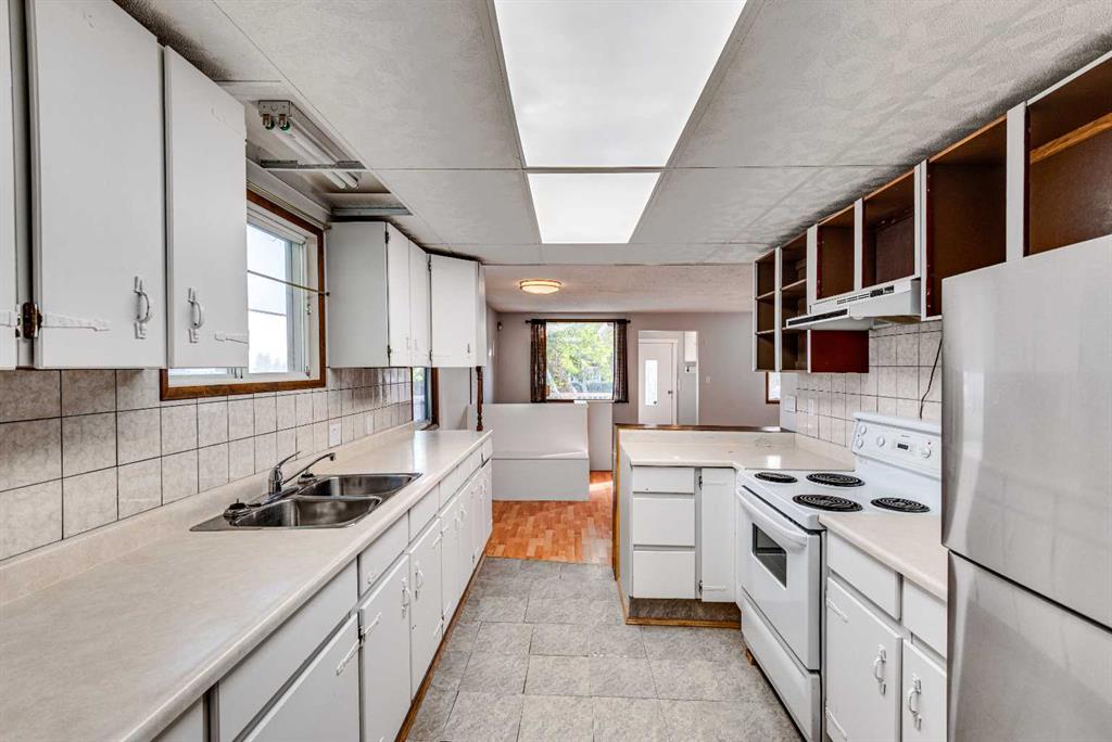 Take a little history lesson with this home... The unique construction and floor plan make sense once you learn that this house was once MD of Ghost Pine office and was also Trochu Valley School house, for K-3. before the school expanded in the 1950s. The main floor boasts a bedroom with attached office, a cozy open concept kitchen living room and dining room, main floor laundry and 3 piece bath. The dining room has a built in breakfast nook bench. Stepping to the basement, with 2 bedrooms and a space plumbed for a bath, as well as large utility room this basement has front and rear access. The garage has an over tall door and a regular door and is 27X27 ft. An amazing space for your projects and cool cars. The yard is simple, large and waiting for all your dreams. =