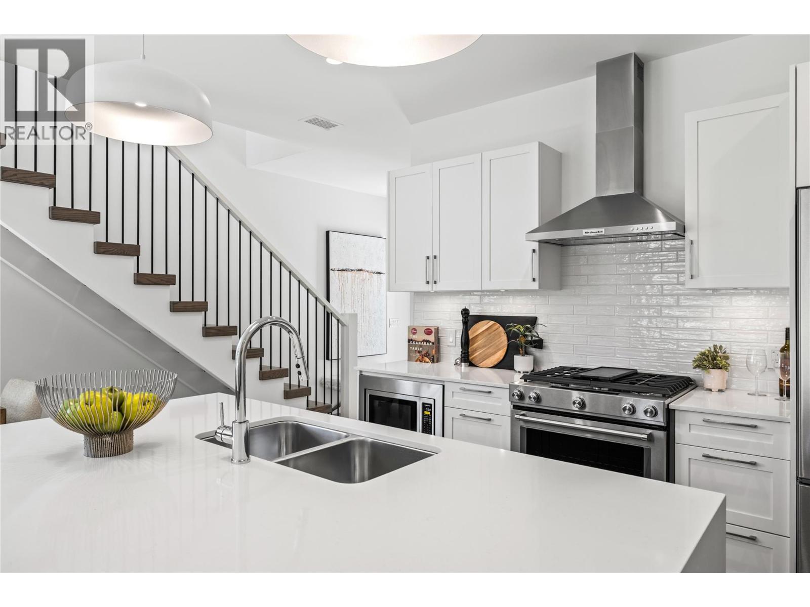 Priced to Sell. Move In Now. Last remaining homes starting from $799,900. This is your best opportunity to Live Where You Play. Located along the 18th hole at the Quail Golf Course, these award-winning townhomes ensure you can live the Kelowna lifestyle, with golf at your doorstep. Quiet but convenient location near YLW, UBC-Okanagan and the growing University/Airport district shopping/dining area. Approx.1,950 sq ft, featuring your primary bedroom on the main floor, with two additional bedrooms and a den/flex area upstairs. Designer details including the open tread wood staircase, German-made laminate flooring on the main floor, LED lights and an open floorplan. The kitchen includes KitchenAid appliances, 5-burner gas stove, quartz countertops, waterfall island with storage on both sides, and shaker cabinetry with under cabinet lighting. Your living extends outside to your covered patio with natural gas bbq hook up and Lake Views. Plus, take advantage of BUYING NEW with PTT Exemption of approx $13,998 (conditions apply). Virtual tour may be of a similar home in the community. Showings by appointment. Move In Now.