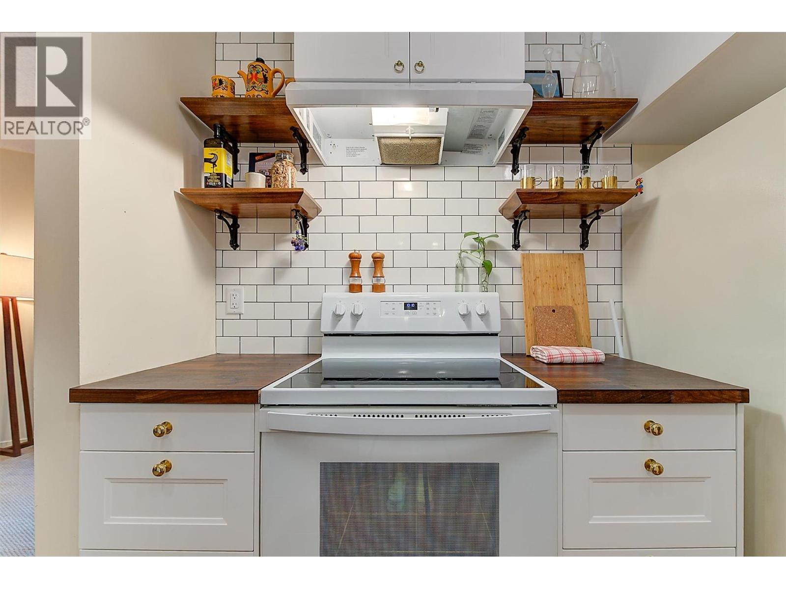 Renovated 2-Bedroom Condo on Prestigious Bernard Avenue. Discover modern living in this beautifully updated 1216 sq ft condo at 205-983 Bernard Ave. This bright, well-appointed unit combines tasteful upgrades with thoughtful design throughout. The completely renovated kitchen is a showstopper featuring crisp white shaker cabinets, rich butcher block countertops, subway tile backsplash, farmhouse sink, and brass fixtures. New Appliances were also installed during the renovation. The adjacent living room centers around a striking brick fireplace and flows seamlessly to your private covered balcony. Two generous bedrooms including a primary suite with balcony access and 4-piece ensuite. The main bathroom features a soaking tub with decorative tile surround. Multiple outdoor spaces include a covered balcony perfect for dining and entertaining, complete with overhead lighting and mature birch tree views. In-suite laundry room, abundant storage throughout, new terra cotta tile flooring in kitchen, hallways and bathrooms, with recently steam cleaned carpet in the bedrooms. Prime Bernard Avenue address puts you in the heart of Kelowna with easy access to downtown amenities, shopping, and services. This move-in ready unit offers the perfect blend of urban convenience and comfortable living. 2 dogs (20 inch height restriction at the shoulder) and 2 cats allowed. 1 Large Storage Locker included. Call 250-575-4138 for more information or to book a private tour.