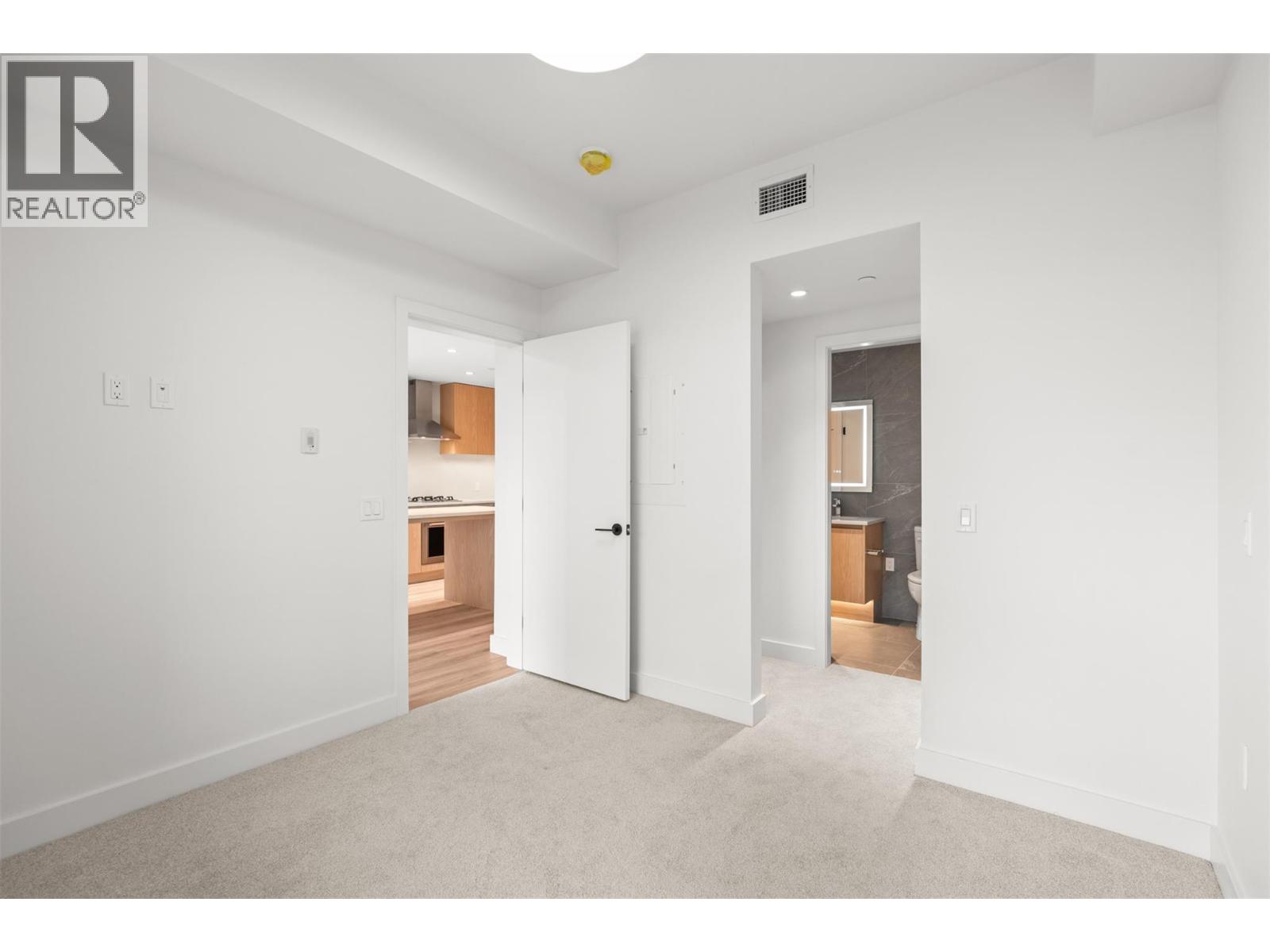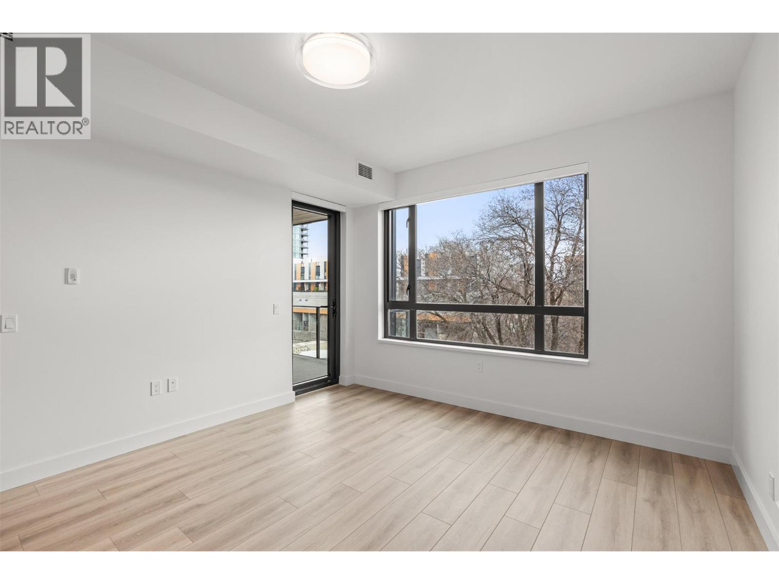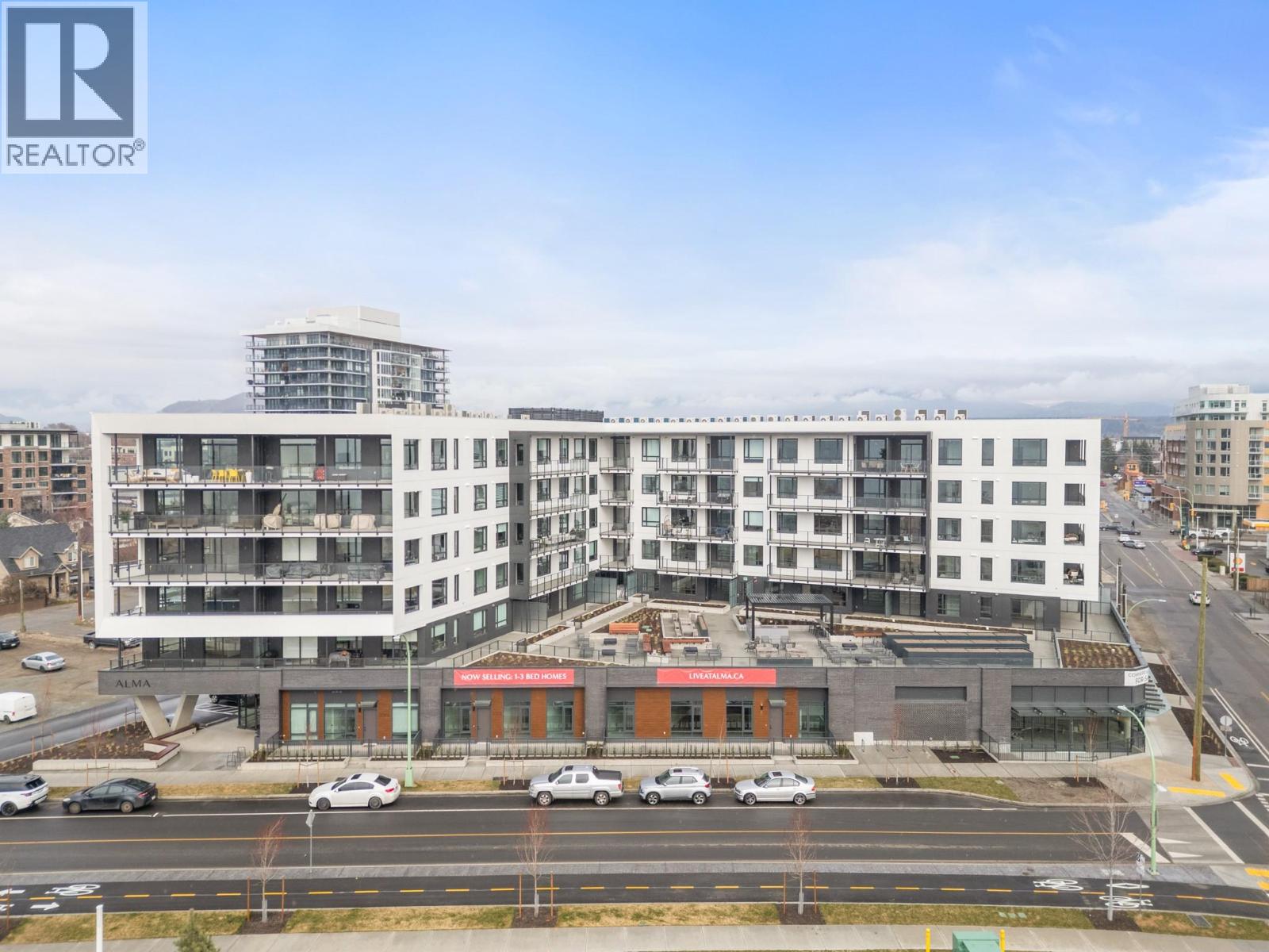 Presenting ALMA, built by Mission Group. This luminous, 3rd floor east-facing 1-bed, 1-bath residence welcomes gorgeous morning sun, offering 540 sqft of interior space plus a 100 sqft terrace, effortlessly blending purposeful design with upscale finishes in the heart of the Lower Mission. The impressive kitchen showcases streamlined flat-panel wood-grain cabinetry, a bold quartz waterfall dining island, and premium stainless-steel appliances. The open-concept plan is ideal for daily living and seamless entertaining, elevated by oversized windows that bathe the home in natural light, durable laminate flooring throughout the main living areas, and soft woven broadloom carpeting in the bedroom. The primary suite features a walk-through closet, while the ensuite is appointed with large-format tile, a rainfall shower, custom-tiled niche, and gentle ambient lighting that creates a spa-like retreat. Added features include roller shades on every window, individually controlled heating and cooling, and one secure underground parking stall. Residents enjoy access to amenities including an 8,000 sqft lakeview terrace with firepits, BBQs, and community gardens, along with a fully equipped fitness centre, dog wash, and bike maintenance station. With a walk score of 93, you’re moments from transit, KGH, the shops and dining of vibrant Pandosy Village, and the shoreline of Okanagan Lake. Sqft and room sizes are approximate and may vary. This newly constructed home is move-in ready.