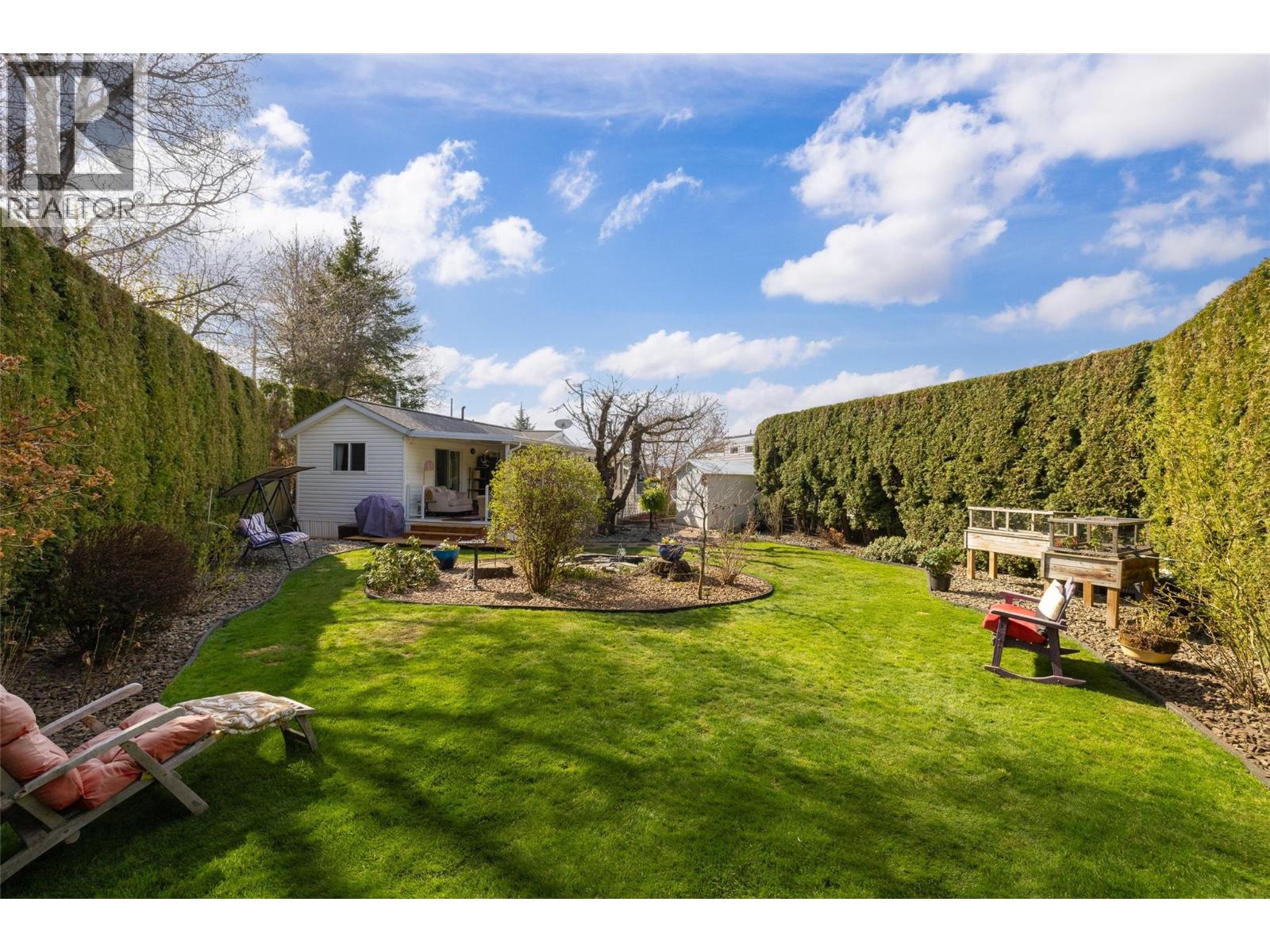 Okanagan living at its best with a RARE double sized lot at the popular Holiday Park Resort! Surrounded by lush lawns, vibrant gardens, a tranquil goldfish pond, and complete privacy, this fully irrigated property also includes a beautifully maintained park model home offering over 850sqft of living space PLUS a large covered deck overlooking the stunning backyard. Designed for year round living, the propane fireplace is another fantastic upgrade you don't see often in these homes and offers additional, cost effective heating for those cozy winter days. As part of this welcoming community, you'll enjoy access to four pools, three hot tubs, pickleball & tennis courts, a 6 hole golf course, two dog parks, a private beach, a fully equipped gym, hair salon, recreation center with pool tables, darts, card tables, library and full commercial kitchen. Plus there's an outdoor BBQ and picnic area, shuffleboard court, a general store with groceries and a cafe, and even an on-site restaurant!! With low maintenance fees, No PTT or SPEC TAX, and a pre-paid lease until 2046, this rental friendly property offers the ultimate in easy, resort-style living - all that's missing is you!