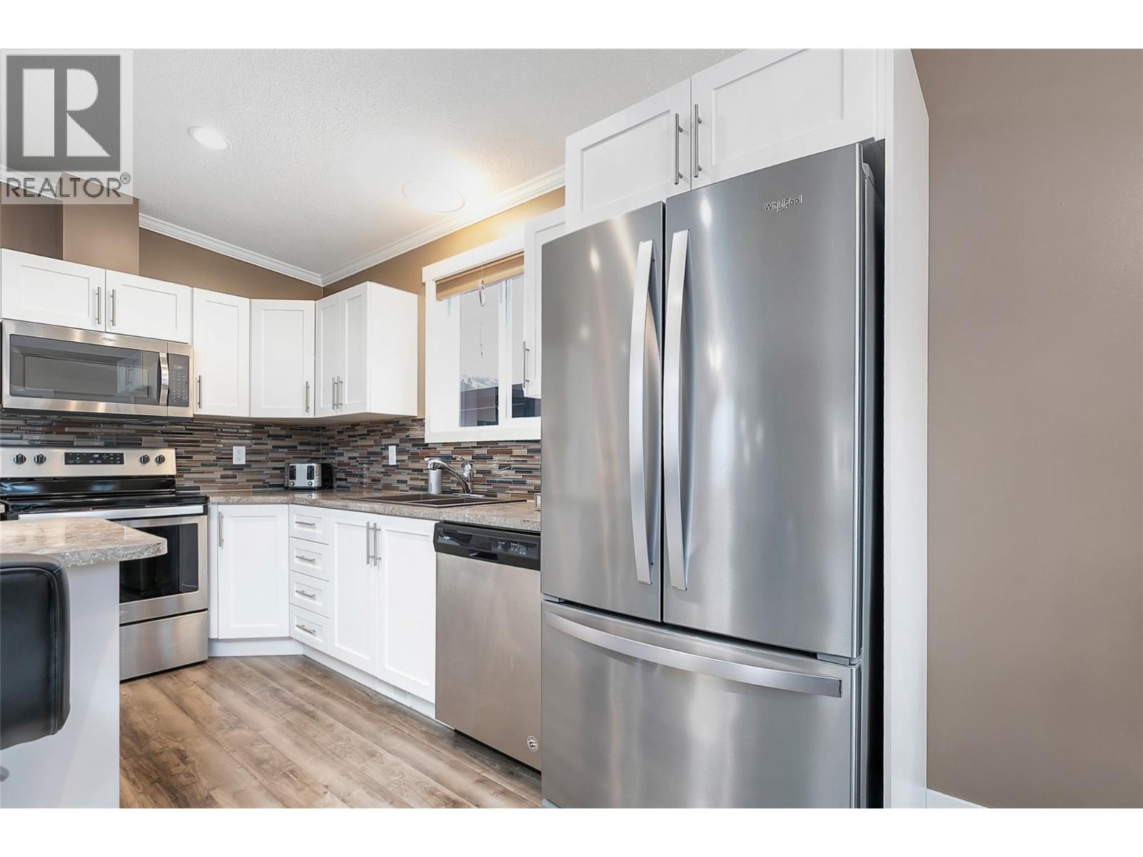 Welcome to this beautifully maintained home offering comfort, privacy, and an unbeatable location. Ideally situated with easy access to nearby walking paths and backing onto a tranquil pathway and creek, this home provides a peaceful outdoor setting with added privacy. Inside, the bright and inviting living area showcases vaulted ceilings and popped out windows that enhance natural light and create an airy feel while the fireplace adds warmth and charm. Daytime privacy film on the kitchen and living room windows offers added convenience without sacrificing brightness. The low-maintenance yard features water-smart landscaping, perennials, and evergreen shrubs, creating a lovely space to enjoy year-round. A composite deck offers a comfortable outdoor sitting area, with an adjoining patio section that provides additional space ideal for entertaining. A small storage shed adds convenient space for tools and seasonal items. Practical features include two parking spaces with a small carport for covered parking. Located within walking distance (or a short drive) to a convenient shopping plaza offering a drugstore, theatre, restaurants, gas station, and medical services. Just a short drive to DT Kelowna and the area’s beautiful beaches like Hot Sands Beach, this home combines peaceful surroundings with everyday convenience. An excellent opportunity for those seeking affordable, low maintenance living in a well connected and desirable community.