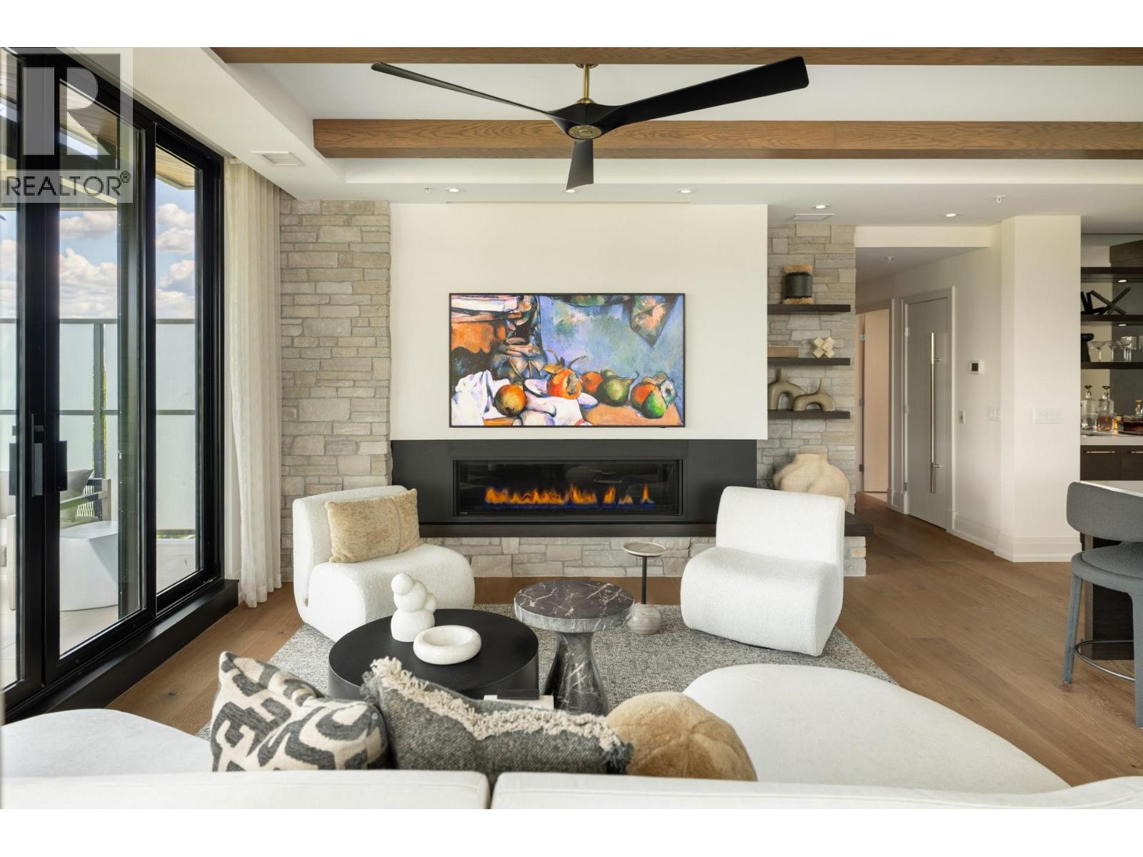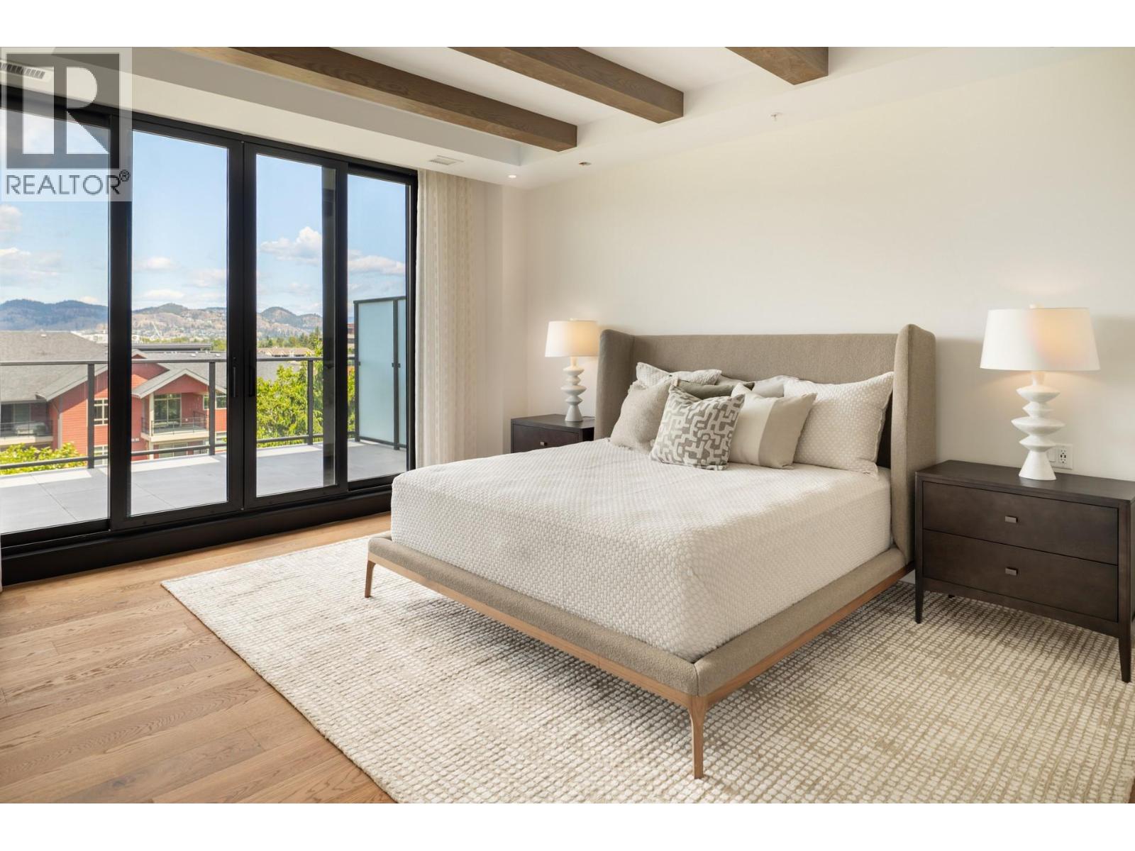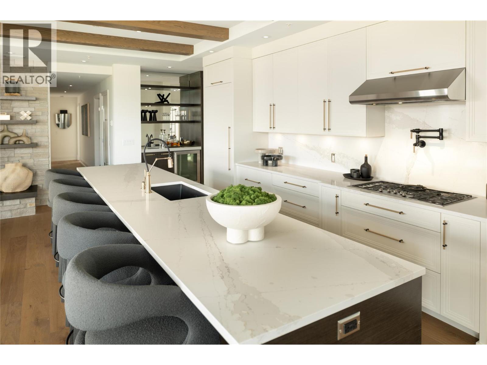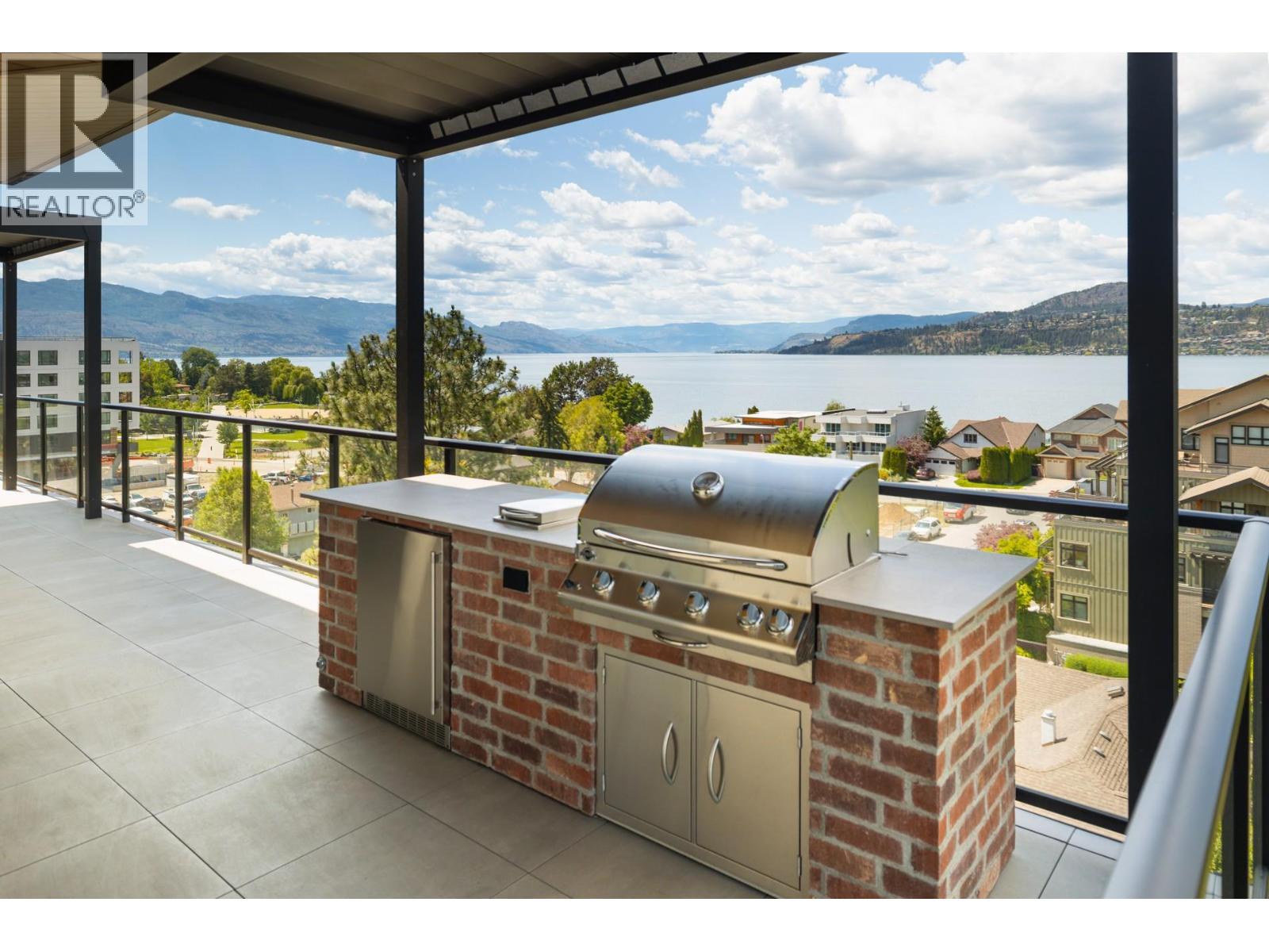 Unit 601 - 450 Parc: Award-Winning Penthouse Living in South Pandosy. Crowning the vibrant Pandosy neighbourhood, this one-of-a-kind penthouse offers over 2,260 sq ft. of interior space & 1,000 plus sq ft. of outdoor living. Designed for those who value elegance & ease, the 3-bedroom, 4-bath residence blends contemporary luxury w/panoramic views of Okanagan Lake, the city, & surrounding mountains. Part of an award-winning development recognized with 4 Gold Awards, including Best Condominium Community in B.C., 450 Parc is celebrated for exceptional design, craftsmanship, & livability. Soaring 10-foot ceilings, wide-plank oak floors, & exposed beams create a upscale ambiance. The chef’s kitchen features a Miele fridge, four Sub-Zero freezer drawers, double Miele wall ovens, quartz counters, & a generous island—perfect for entertaining. A glass-enclosed wine room is ready for customization & a wet bar complete the space. The primary suite is a true retreat with dual walk-in closets, a spa-like ensuite, & access to the terrace, where a saltwater hot tub is coming soon. Two additional bedrooms with private ensuites, a powder room, & full laundry round out the layout. Enjoy outdoor living with a built-in kitchen, Jackson Grills BBQ, fire table, & automated louvred pergolas. Smart tech includes Control4 automation, motorized blinds, designer lighting & EV-ready parking. Private and set in one of Kelowna’s most walkable areas, this penthouse elevates luxury living.