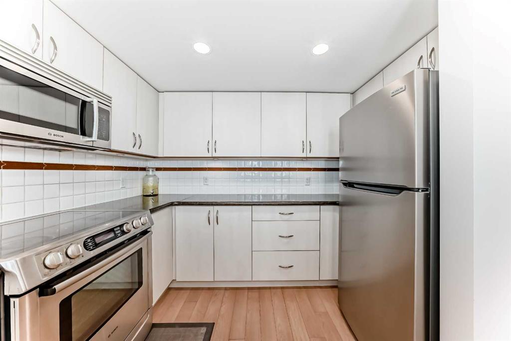 Live the Luxe Urban Dream in Downtown Calgary. Welcome to The Marquis – where sophisticated downtown living meets comfort, convenience, and style. This is the home you’ve been waiting for! Affordable 2-bedroom, 2-bathroom sanctuary nestled along the Bow River in one of Calgary’s most vibrant, sought-after neighborhoods. Step into this moderately updated suite. The welcoming entryway features a two full-size coat closet, opening into a bright and vibrant living space anchored by a stunning marble-tiled gas fireplace – the perfect cozy touch for chilly Calgary nights. Rich maple hardwood floors flow throughout the living area and both bedrooms, complemented by expansive windows that flood the home with natural sunlight and includes a portable room air conditioning for those hot summer days. Love to cook? You’ll fall in love with the chef-inspired kitchen featuring gleaming granite countertops, generous cabinetry boasting under cabinet lighting, ample cupboard space with pull-out pot and pan drawers. Premium Bosch stainless-steel appliances – including a sleek induction cooktop, built- in dishwasher, built-in microwave, and oversized double sink with garburator and upgraded faucet. Whether you’re whipping up dinner for friends or preparing a quiet brunch at home, this kitchen is designed for space. The primary suite is a luxurious retreat, complete with private balcony access, walk-through closets, a 4-piece ensuite, heated tiled floor, granite vanity top and a bonus storage closet for all your essentials. Enjoy the privacy of a smart split-bedroom layout, ideal for roommates, guests, or a home office setup. The second bedroom is perfectly positioned near a stylish 3-piece bathroom, granite vanity top, heated tiled floor and beside a spacious laundry room with extra storage and shelving. Your titled underground parking stall is just steps from convenient bike racks and comes with a separate assigned storage unit. And that’s just the beginning. The Marquis is a solid concrete building (including between suites for peace and quiet), with updated common areas that are both elegant and impeccably maintained. The upscale lobby creates a grand welcome for you and your guests. Amenities include 24 indoor visitor parking stalls, a fully equipped fitness center with change rooms, a tranquil yoga studio, and a stylish party room for entertaining. With a walk score of 95, you’re just steps from the riverfront paths, Prince’s Island Park, charming cafés, unique boutiques, acclaimed restaurants, and only one block to the LRT (in the free fare zone!). The energy of Kensington is just across the bridge, and yes – pets are welcome with Board approval. Downtown elegance. Riverfront tranquility. Urban excitement. It’s all here – and it’s waiting for you!