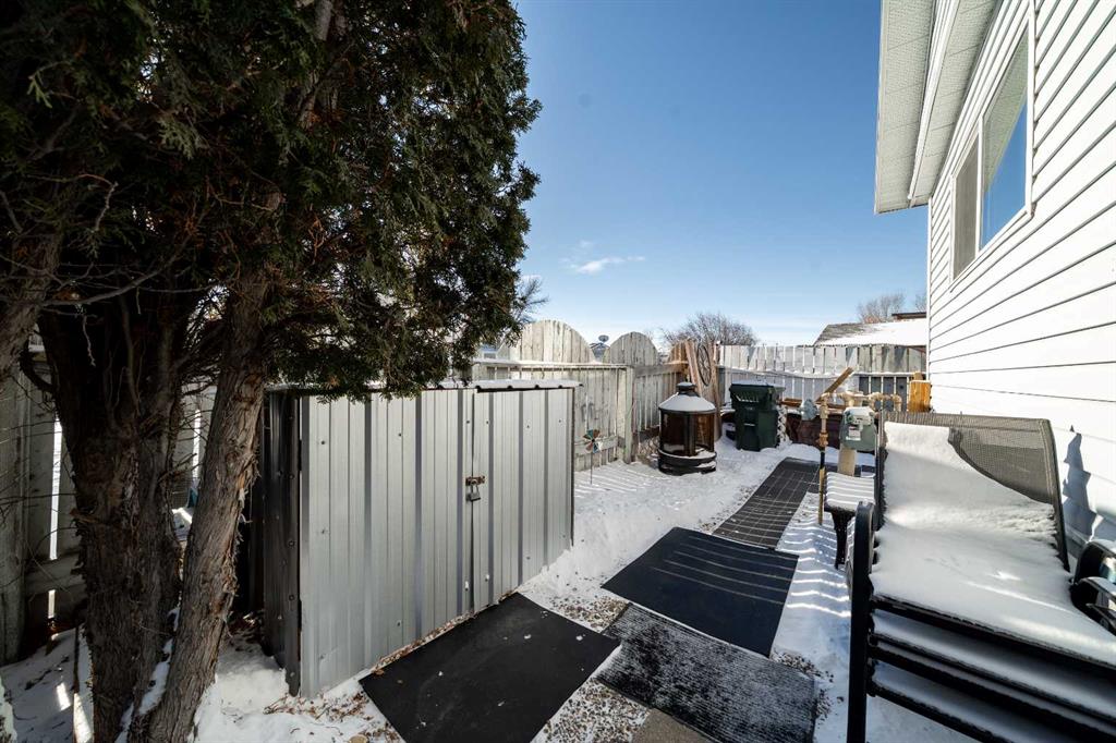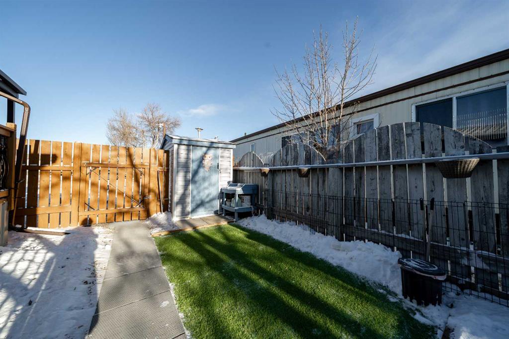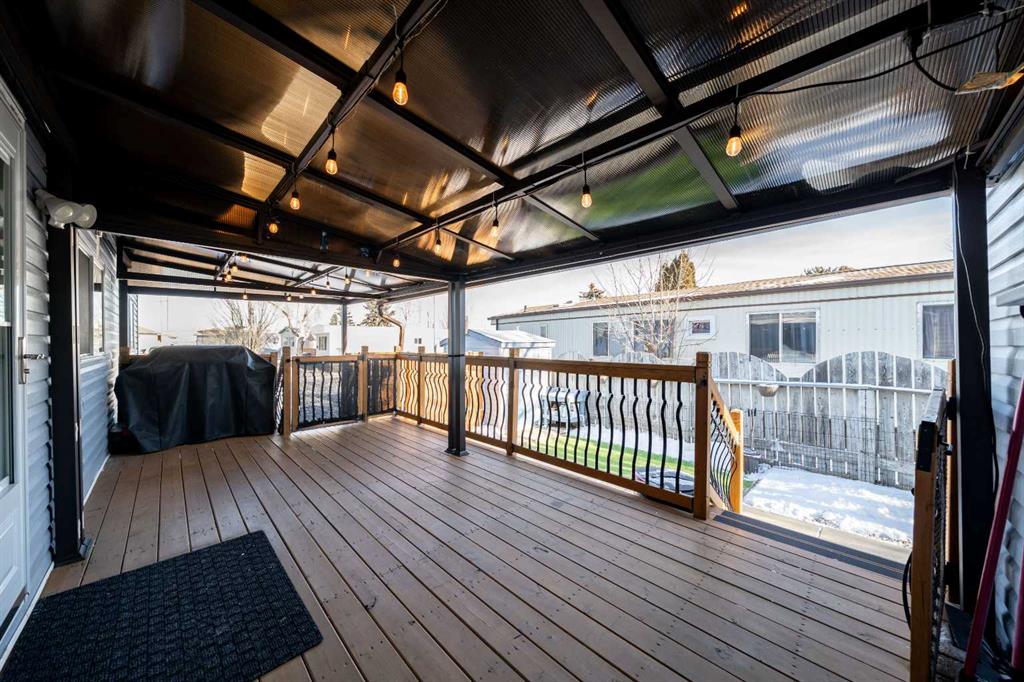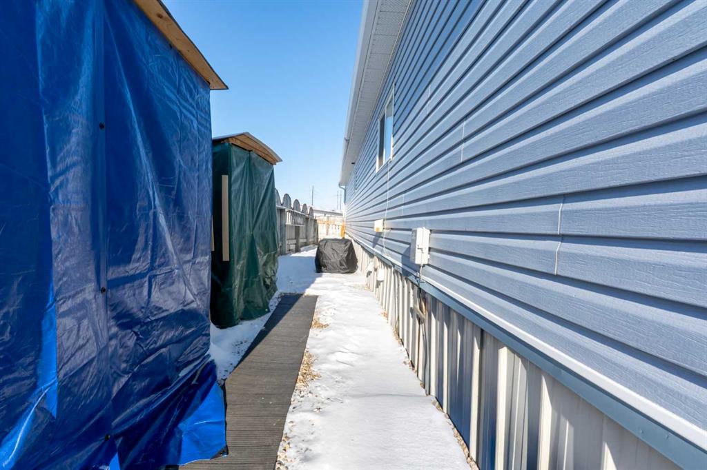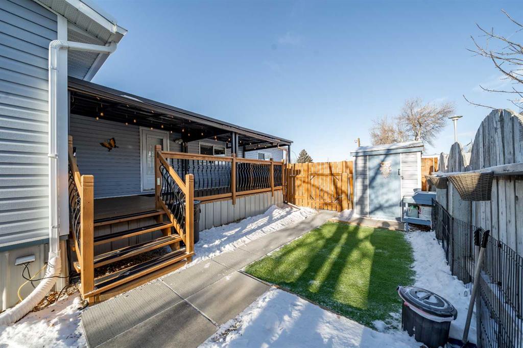 OWNED LAND, NO LOT FEES! Want low maintenance living with everything on one level...with fully fenced yard for your pets or kids? Welcome to this 3 bed 2 bath home that has been meticulously maintained inside and out. The large covered deck (19'5"x 10'5") is welcoming and a great addition to morning coffees, entertaining friends and family in the warmer months, all while being protected from the elements. It's an extension of the home! Step inside the front door to find a beautiful open concept kitchen/dining/living room with vaulted ceilings and newly incorporated pot lights to add to the abundance of natural light. The kitchen has new countertops, new sink and new side by side fridge. Enjoy simple meals at the counter seated island which also supplies numerous storage drawers/cupboards and an electrical outlet for further convenience. Down the hall, away from the noise of living, you will find a four pc bath with laundry, a generous master bedroom with 3pc ensuite and two additional bedrooms..one currently used as an office with outdoor access. No detail has been missed, inside or outside...the list is endless. A new furnace installed in July 2025, with a pump so it doesn't drain under the home (affecting moisture below)but rather into the sewer lines, new light fixtures/fans...washer/dryer and dishwasher approximately 2 years old, new flooring in master bedroom. The office has been freshly painted. Moving outside, the covered deck was stained this past summer and the gazebo has sliding panels to control level of sun etc. The yard has been completely transformed into a maintenance free zone including pea gravel and artificial grass. New sidewalks and rubber pads were installed to keep walking easy as well as a new garbage platform. There are 3 sheds and two container holding racks for added storage and convenience. Finally, the home was relevelled with new footings on cement pads and new 8ml poly/pea gravel installed with heat tape on water lines below for optimal comfort and security. Parking is never a problem, there is plenty extra in the roundabout directly in front of the home. Don't miss the opportunity to check out this great home!