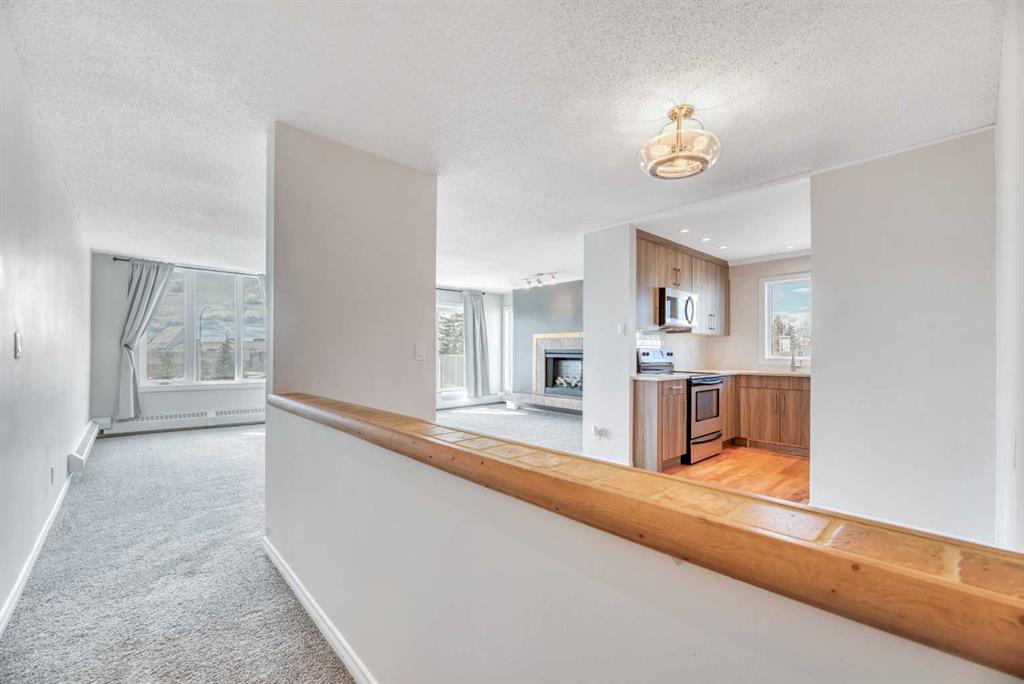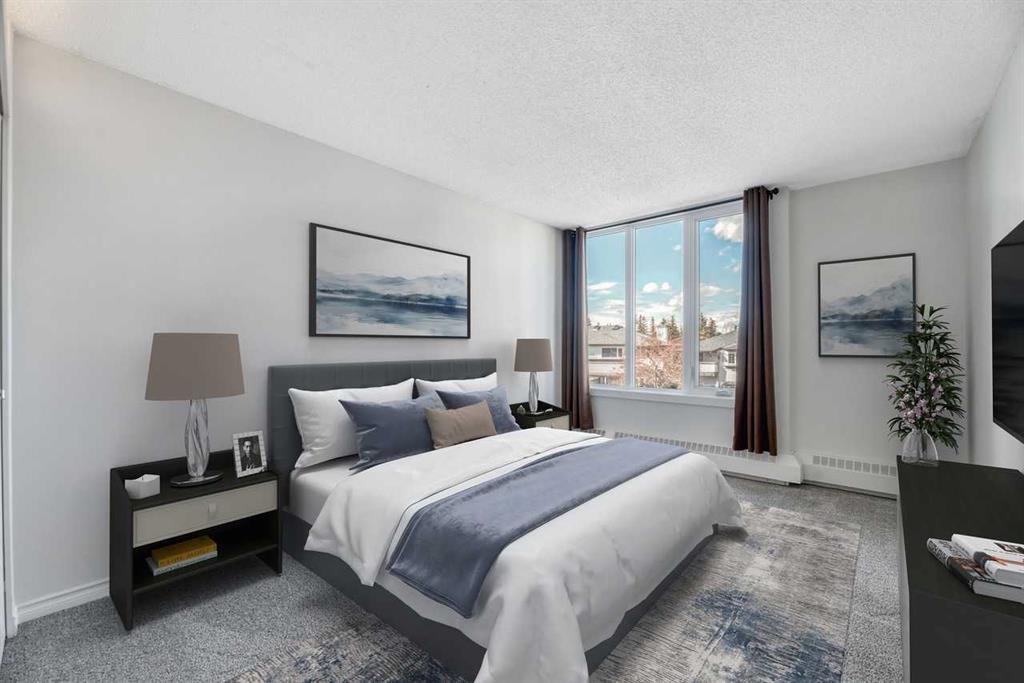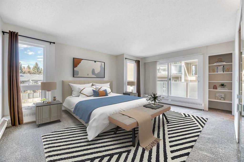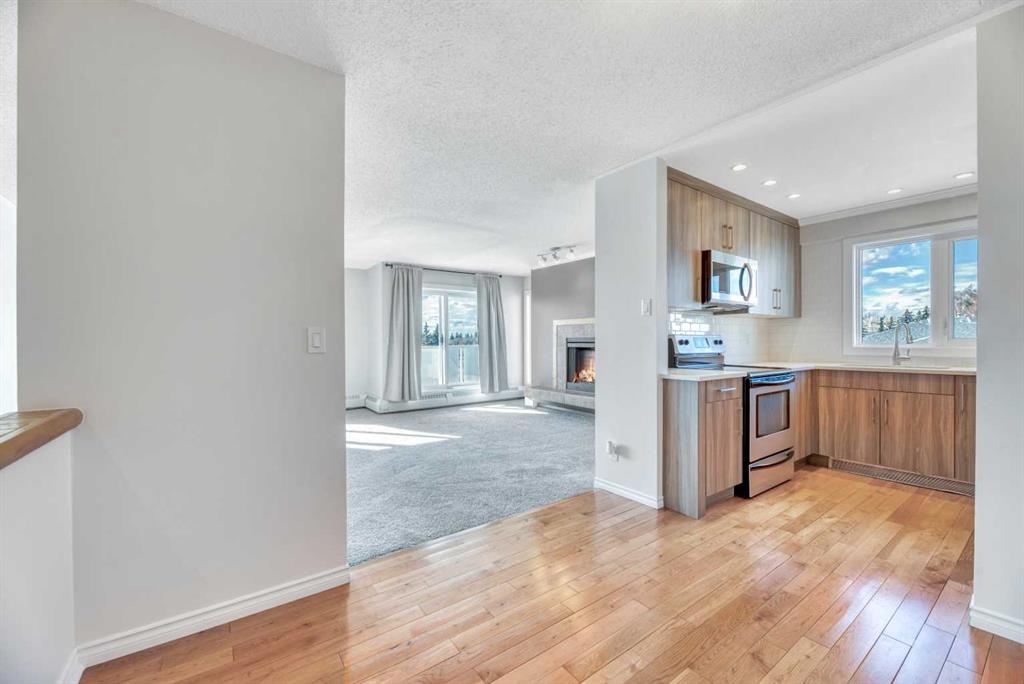 Don't miss this spacious renovated 2 bedroom, 2 bathroom condo in the heart of Varsity! Step inside to a tastefully updated kitchen featuring quartz countertops and stainless steel appliances, with updated lighting throughout the kitchen, bathrooms, and bedroom closets. At 1,127 square feet, the layout is generous and functional — a large dining area, and a sun-filled living room with expansive west-facing windows and completely unobstructed views to the west. Cozy up to the electric fireplace on those cold Calgary evenings, or step out onto one of two private balconies and soak in the sunshine. One of the great features of this unit is its position in the building — it shares just one wall with one neighboring unit. The primary bedroom is king-size ready and features its own balcony — a rare and lovely touch. The ensuite has been thoughtfully upgraded with a custom walk-in shower and heated flooring, making it a genuinely comfortable retreat year-round. The second bedroom and bathroom are equally well-appointed and ready for guests, family, or a home office setup. And the building itself deserves a mention: over the last decade this complex has seen significant investment in the exterior and common areas, including new roofing, balconies and railings, siding, windows, doors, landscaping, and refreshed interior hallways. This is a well-maintained complex that has been well cared for. This property is perfectly situated near Market Mall, and close to the University of Calgary, Alberta Children's Hospital, the river, parks, schools, public transportation, and so much more. Varsity is one of Calgary's most established and sought-after NW communities. Whether you're looking for a comfortable home or a strong rental property, this one is worth a serious look.