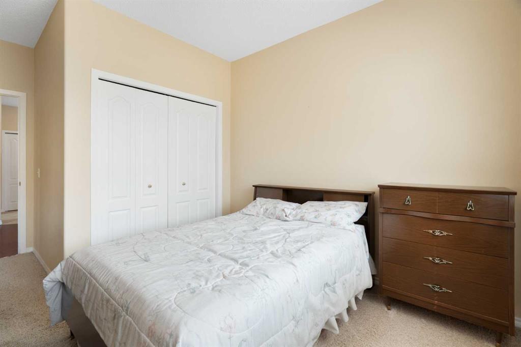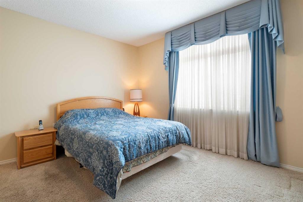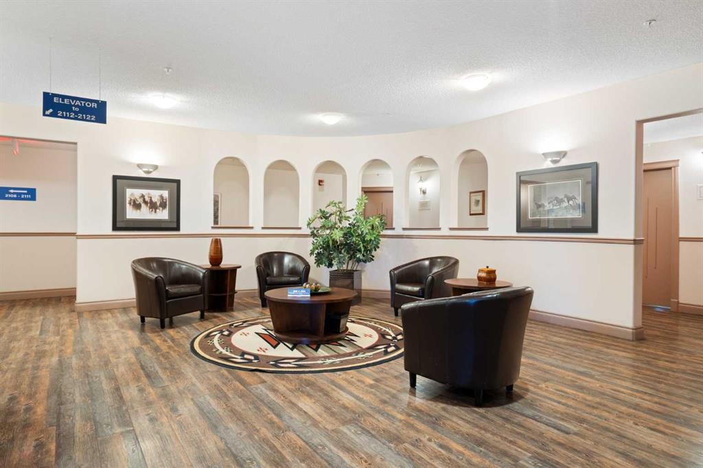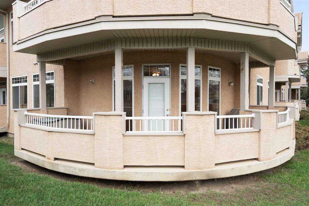 Your opportunity to live in the desirable Patterson Bluffs 55+ seniors’ complex. These units don’t become available very often and this unit is one of the largest and unique designs in the complex. With 1235 sq. ft. of single level living space, 2 bedrooms and 2 bathrooms, 9’ ceilings, soft corners, numerous large windows and an open plan, there is so much to work with in making it your new home. The entrance is wide and inviting with a large closet and space for seating. The newer rectangular tile that continues into the kitchen is easy to maintain. Moving forward into the living area your senses will be impacted by the abundance of natural light, the spaciousness of the living area, the unique curved wall, the airiness created by the 9’ ceilings, all complimented by the soft neutral colour palate. There is great flexibility of use provided by the open plan. The living room features a corner gas fireplace for added atmosphere and comfort. Step out to the wrap-around patio with southeast to southwest exposure and enjoy a morning coffee, summer lunch or evening BBQ. A large dining room with one wall of windows, space for a buffet and hutch, located next to the kitchen can accommodate daily meals or larger gatherings. A raised breakfast bar provides another option for snacks. The well-planned kitchen is bright with white appliances, lots of cabinets, counter space and a pantry. Retire to the primary suite with space for a king-sized bed, large window, walk-in closet with organizers and a 3-piece bathroom with a walk-in shower and storage cabinet. A second bedroom can function as a guest room or den. There is a main 4-piece bathroom with a one-piece jetted tub shower combination. A large laundry room with front loading washer and dryer has space for in-suite storage as well. The unit comes with 2 assigned parking stalls and a storage locker. This premier complex has a number of wonderful amenities including a hobby/workshop, self serve car wash bay, social/recreation room and a great clubhouse. Wonderfully landscaped grounds with paths and water features add to the overall ambiance of this fine home. It is located just off Old Banff Coach Road in the desirable community of Patterson. There is great access to Sarcee Trail, Stoney Trail, Highway #1 and public transportation. You will be close to many amenities and services such as McMahon Stadium, Foothills Medical Centre, University of Calgary, Canada Olympic Park, Calgary Farmer’s Market, Westhills Towne Centre and so much more. You owe it to yourself to check it out today.