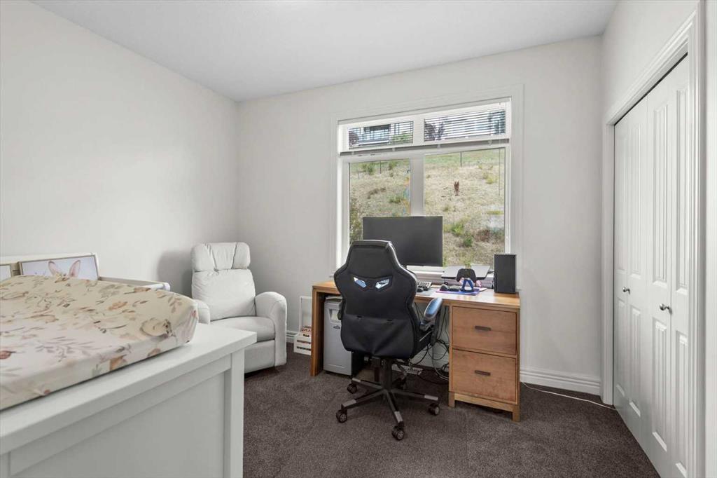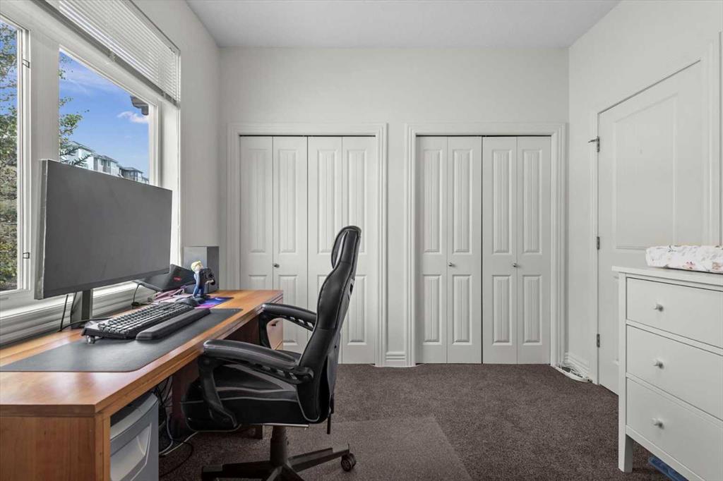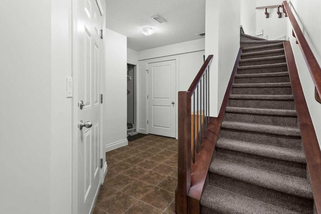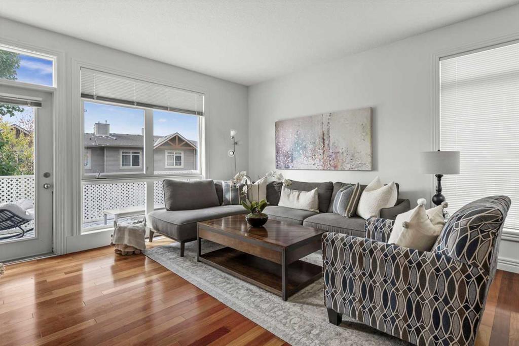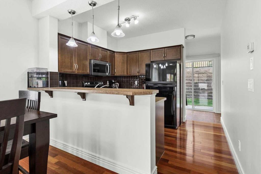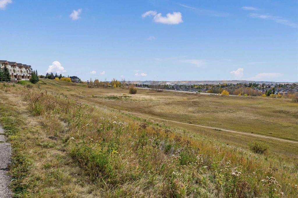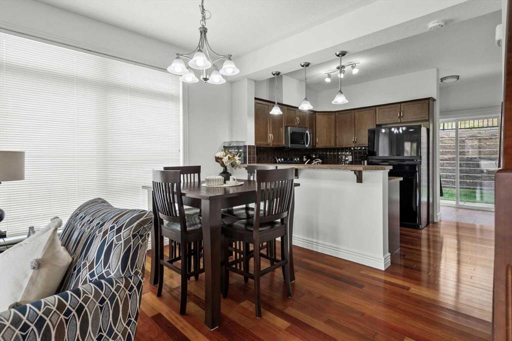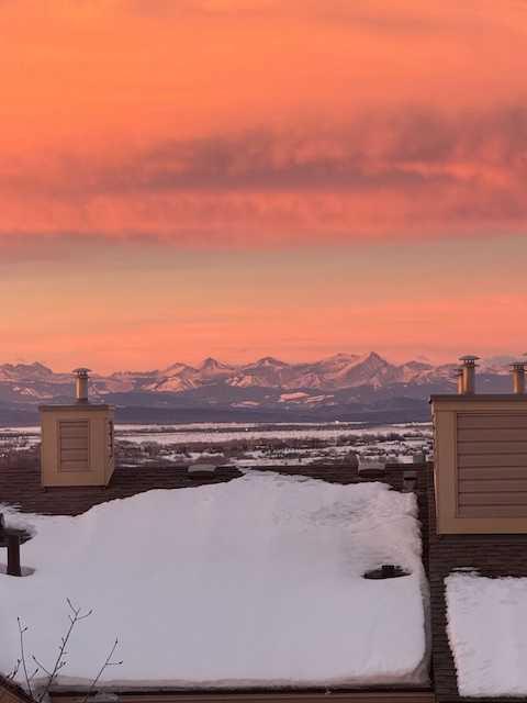 Welcome to this bright and beautifully maintained END UNIT townhome in Rocky Ridge, offering west-facing mountain views from both the front deck and upper level. With 9-foot ceilings and over 1450 sq. ft. of developed living space, this home blends comfort and style in one of Calgary’s most desirable communities. The entry level features a spacious foyer, large storage room, and access to the single attached garage. The main floor showcases hardwood flooring, a modern kitchen with stainless steel appliances, a breakfast bar, and an open-concept living and dining area with large, bright windows. Step out onto the front deck to enjoy mountain views or relax on the private rear patio with a gas line for your barbecue. A two-piece bath completes this level. Upstairs, the primary bedroom offers stunning mountain views and a three-piece ensuite, along with a second bedroom and 4 piece bath. The laundry is conveniently located on this upper level Recent updates include new carpet throughout (2025), freshly painted throughout (2025), new shower door, bedroom fan, hot water tank (2023), light fixtures, and vent and duct cleaning (2024) — all adding to the home’s fresh, move-in-ready feel. Located close to Rocky Ridge Co-op, Royal Oak Centre, and the Shane Homes YMCA, with playgrounds, walking paths, and bike trails nearby, this home offers the perfect combination of convenience, comfort, and mountain charm.