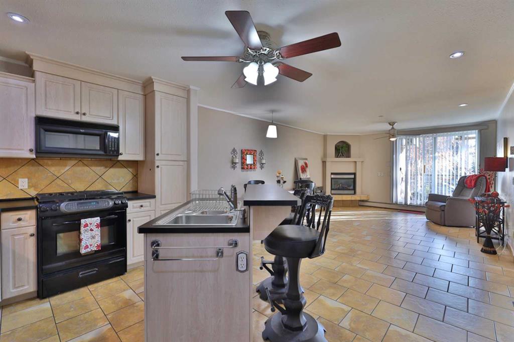Welcome to Fieldstone Place Condomium and this Lovely 1 Bedroom Suite. Fieldstone is mere steps to all the pathways around Mirror Lake and just a block to all the downtown shopping and festivities. Once you're in the Beautiful Building and past the mailboxes, you'll find this main floor home. It has a nice open floor plan with just enough neat kitchen cabinetry, handy island, eating area and living room. You can even enjoy the cozy corner gas fireplace on those cool days and appreciate the A/C on the warm ones. From here there are patio doors out to the covered East facing deck, complete with overhead heaters and BBQ gas hook-up. Back inside, you'll find the primary bedroom which has double closets, shoe organizer closet and again, access to the East facing deck. Completing the suite is a 3 pc. washroom (w/ walk-in shower and washroom heater) and the laundry space. Again, with neat organizers in the cupboard. You'll love that you never have to leave the building to get to your vehicle that is securely parked in the underground parkade as well as the secure storage space. Ohhhh! and when you want a little more space to gather the family, you will LOVE the "Sunset Lounge" on the 4th floor with a small kitchen, numerous tables, another fireplace AND a huge West facing deck! Take a look at what carefree condo living can look like! (Building is Adults 55+)