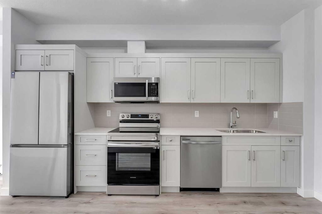 Welcome to this brand-new, never-lived-in 1 bed, 1 bath main floor apartment perfectly located in the highly desirable community of Sage Hill NW, Calgary. With its oversized balcony overlooking a beautiful green space, this home offers the perfect combination of modern comfort, natural beauty, and unbeatable convenience. Step inside to discover a thoughtfully designed open-concept layout featuring high ceilings and luxury vinyl plank flooring that create a warm and inviting ambiance from the moment you enter. The upgraded kitchen is both stylish and functional, complete with stainless steel appliances, quartz countertops, and ample cabinetry — ideal for everyday living or entertaining guests. The spacious living room is filled with natural light from a large window and opens directly onto your private oversized balcony — the perfect spot for morning coffee or evening relaxation. Plus, with a BBQ gas line already installed, summer grilling has never been easier. Your bedroom is a cozy retreat with a large window offering abundant daylight, a walk-in closet, and convenient access to the full bathroom with a Jack & Jill door. Additional highlights include in-suite laundry, central air conditioning for year-round comfort, and a titled parking stall for your convenience. Located in the heart of Sage Hill, this home puts you just 1 minute away from T&T Supermarket, Walmart, Sobeys, Costco, McDonald’s, schools, parks, playgrounds, walking paths, and offers easy access to major highways. Sage Hill is known for its scenic trails, abundant green spaces, and nearby nature reserve, creating a peaceful lifestyle with all the amenities right at your doorstep. This property is an excellent choice for first-time home buyers, students, downsizers, or investors seeking a move-in-ready home in a prime NW location. Don’t miss your chance to own this stunning apartment — book your private showing today!