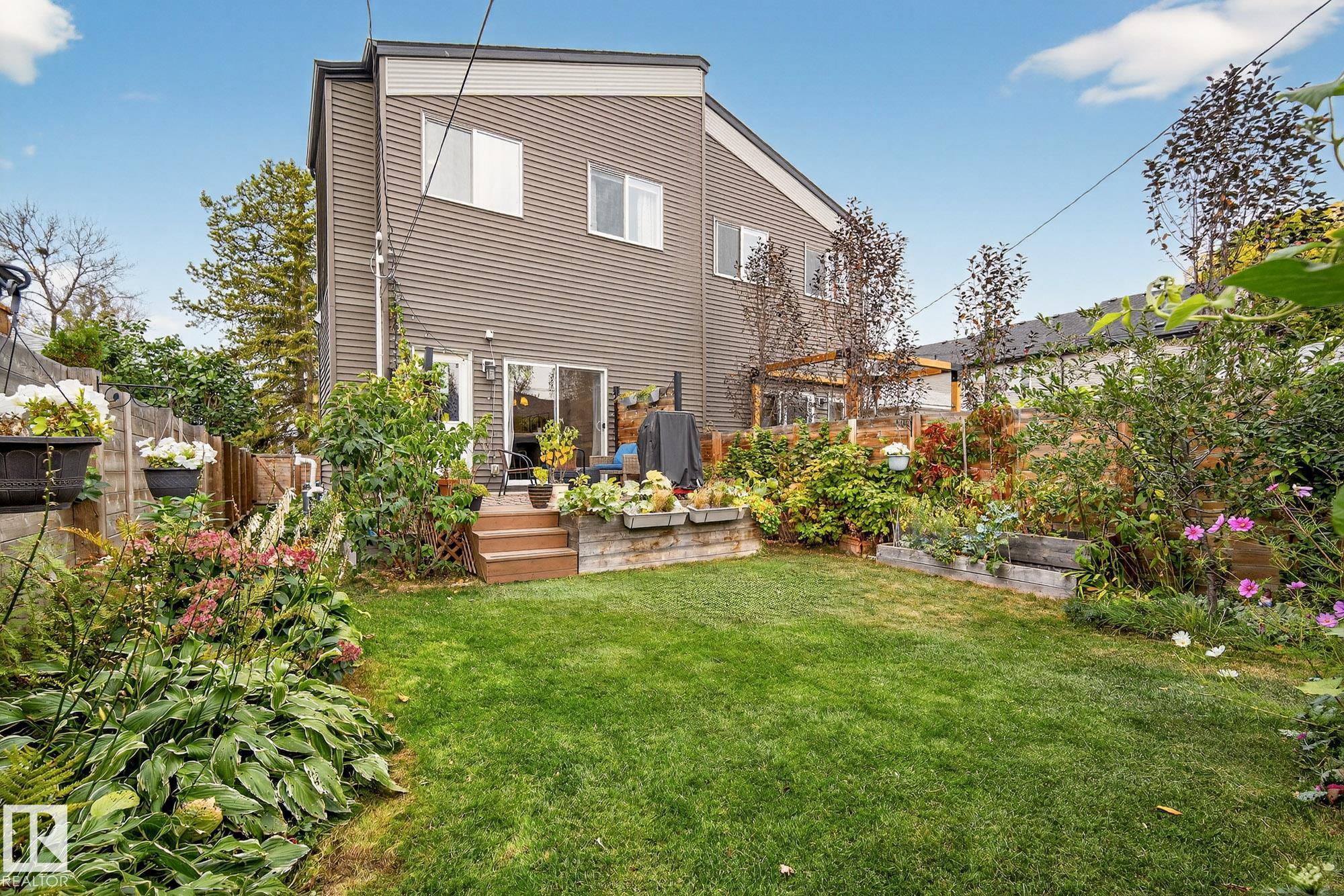 HELLO CHARMING! Welcome home to this OG Accent Infills half-duplex located in historic Inglewood located walking distance to Westmount Jr High, Westmount Shopping Centre + trendy 124 St. Shopping District. The stunning perennial cottage garden in the backyard will have you SWOONING! Inside, you’re greeted by beautiful hickory hardwood floors, large open living space, and a spacious kitchen with patio doors leading to your deck + detached double garage. Upper level features 3 bedrooms, laundry room and convenient tech space. You’ll be WOWED by the primary retreat with its huge vaulted ceilings, massive windows, and gorgeous spa-like ensuite. A/C added in 2023 to keep you cool with your massive windows! Basement left untouched for you to create the space you desire - complete with SIDE ENTRANCE for those looking to develop a basement suite.