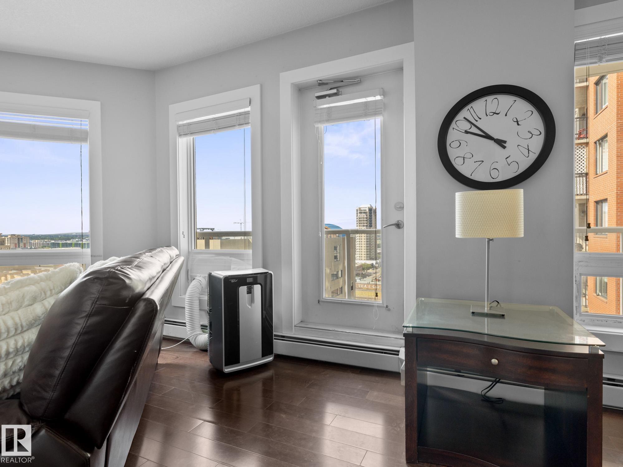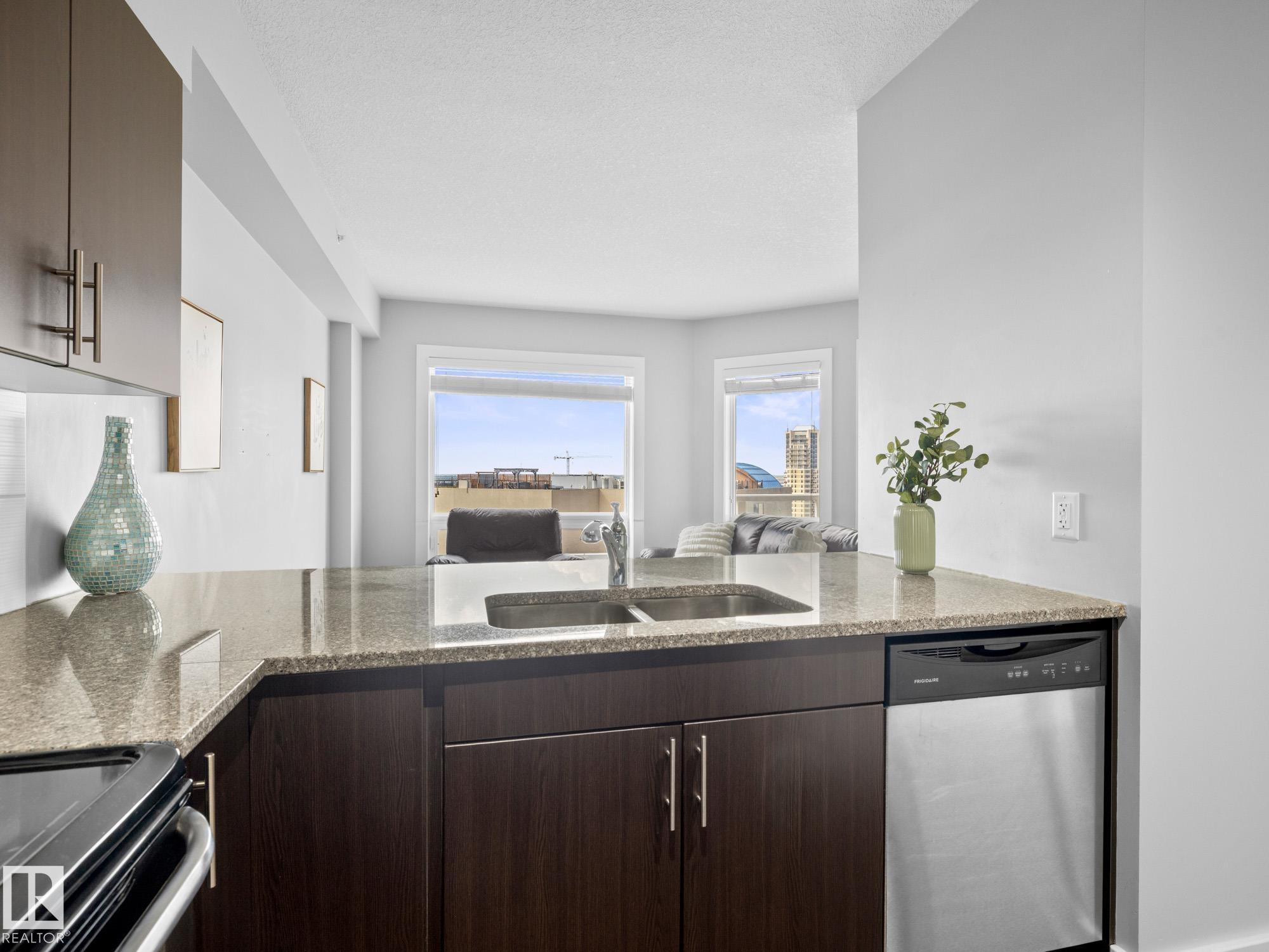 PRICED TO SELL!! Welcome to one of the most desirable large 724 sq ft, 1-bedroom corner units in the sought-after ICON II, right on 104 Street in the vibrant heart of Downtown. Step into an open-concept layout flooded with natural light from numerous windows. The modern kitchen features granite countertops, stainless steel appliances, sleek cabinetry, and a breakfast bar for casual dining, while the central dining area anchors the home.The spacious primary bedroom is next to a well-appointed 4-piece bathroom, and the unit offers the convenience of in-suite laundry, ample storage, and UNDERGROUND titled parking. Relax or entertain on your west-facing balcony, perfect for evening sunsets over the city. Walk to Rogers Place, the Ice District, top dining, coffee shops, farmers market, and River Valley trails—all just steps away. This unit can be fully furnished & turnkey, or move in vacant and make it your own. Refreshed, ready, pet friendly and waiting for you!