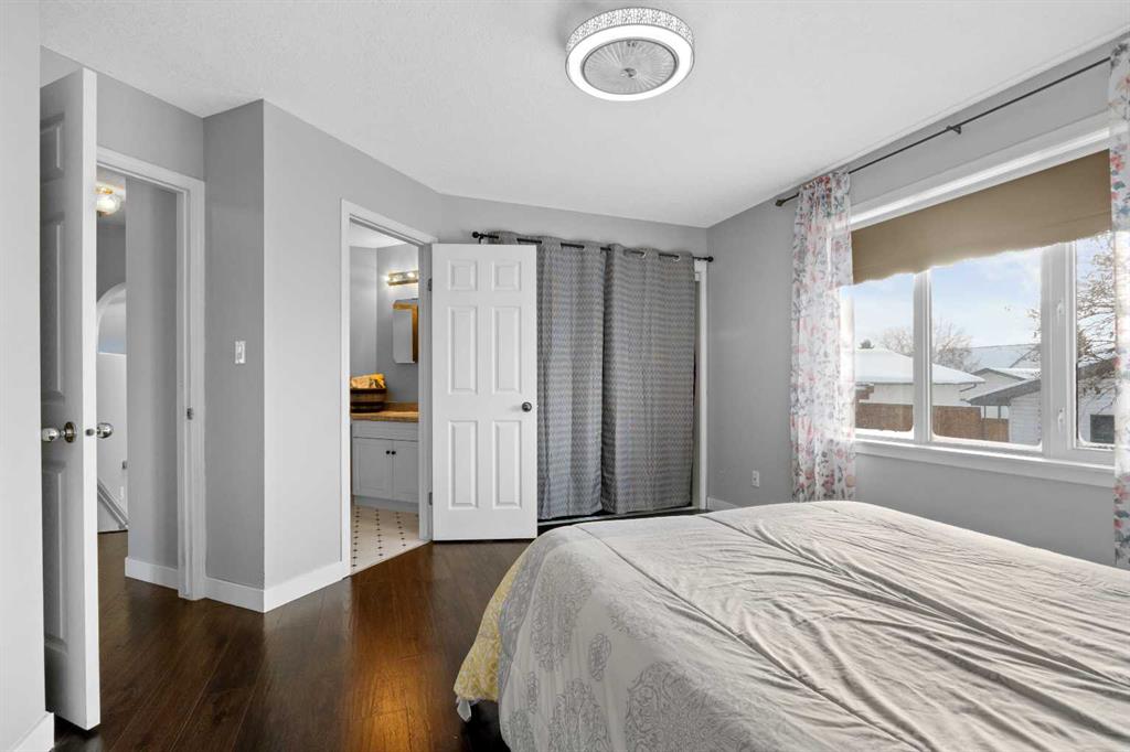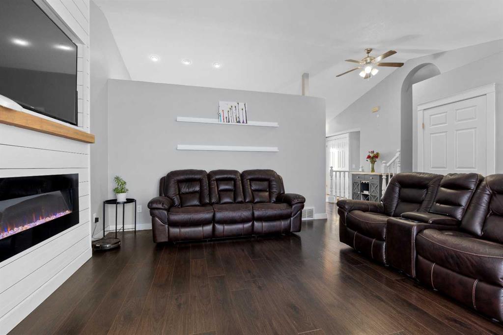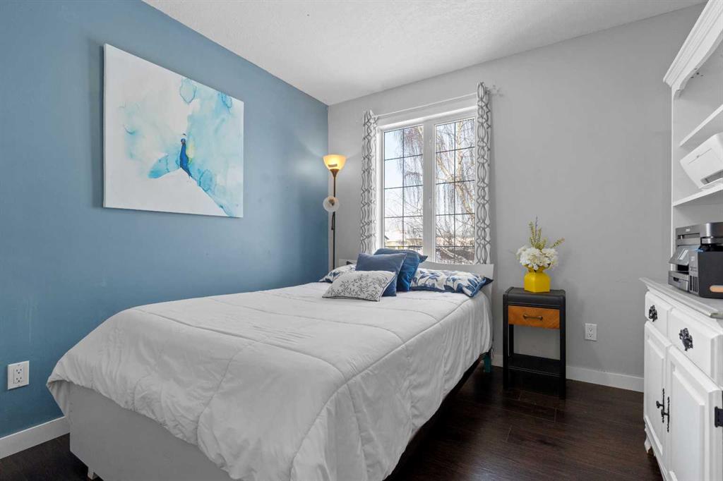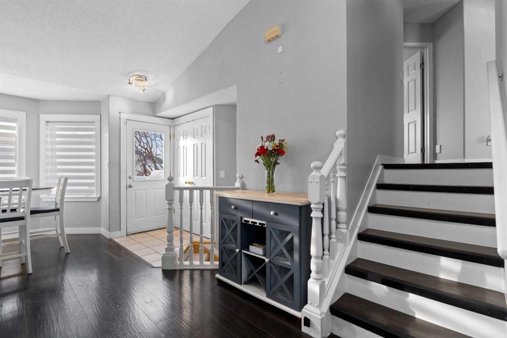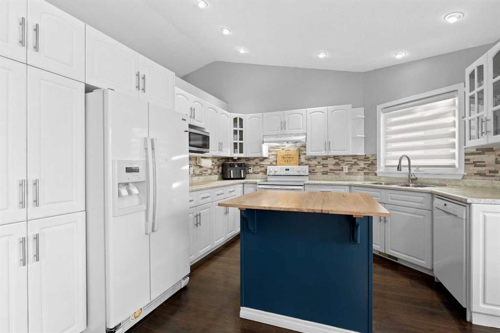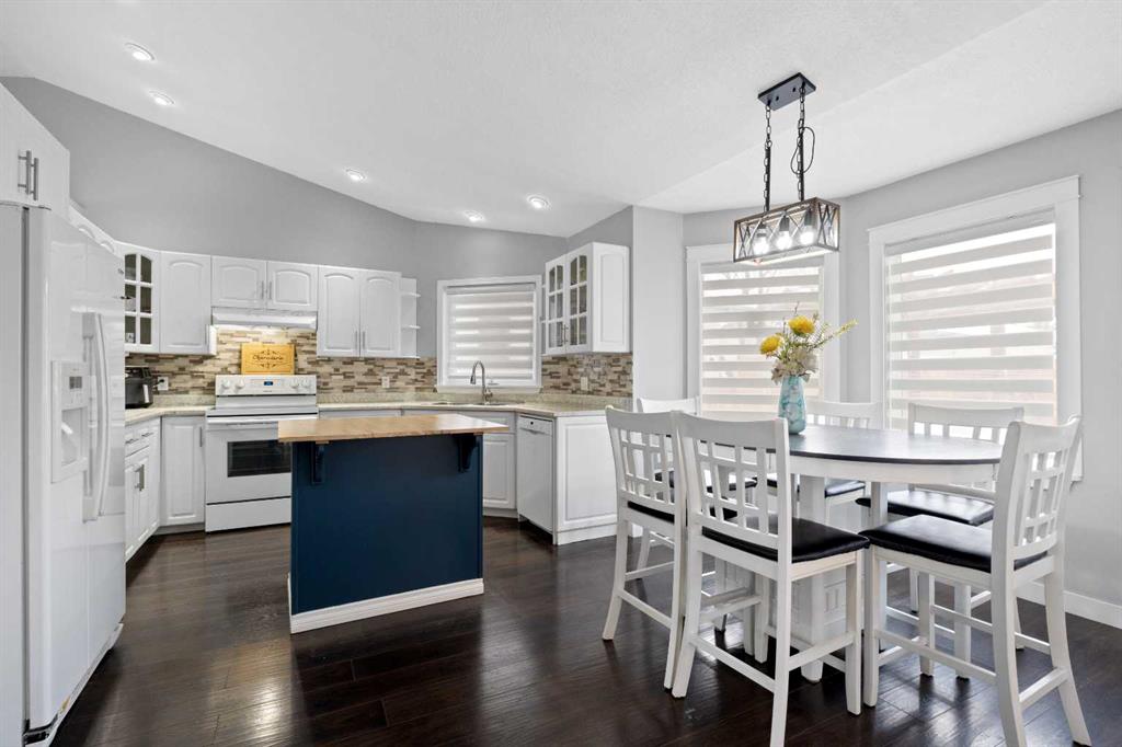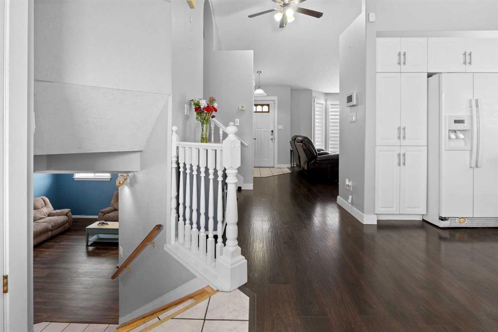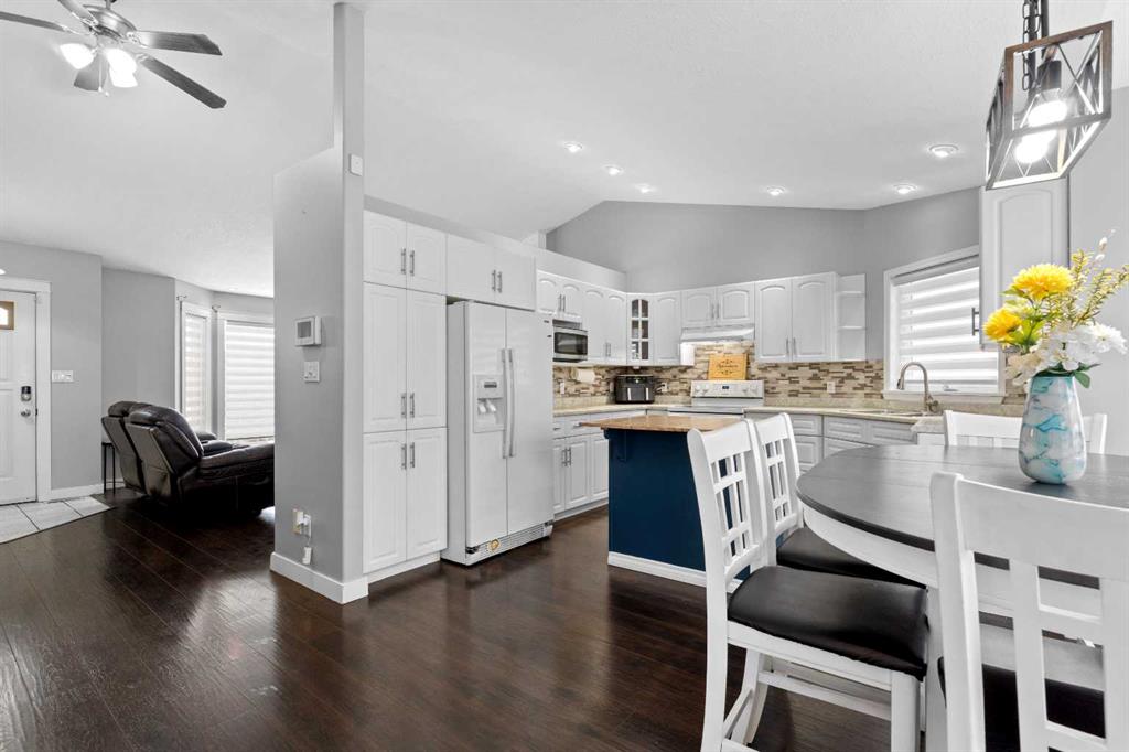This home offers a practical layout suited for day-to-day living. Situated on a cul-de-sac and features immediate backyard access to a spacious, heated 28' by 26' detached garage with convenient back alley entry and additional adjacent parking. The main floor offers high ceilings, an electric fireplace in the living room, and an open kitchen with a floating island and backyard views, while the upper floor provides three bedrooms and two full bathrooms. Functionality continues on the lower levels, which include a large rec room with 9-foot ceilings, the home's third full bathroom, and laundry, plus two extra rooms and storage in the basement. The fully-fenced backyard enhances outdoor living with a greenhouse and hot and cold water taps.