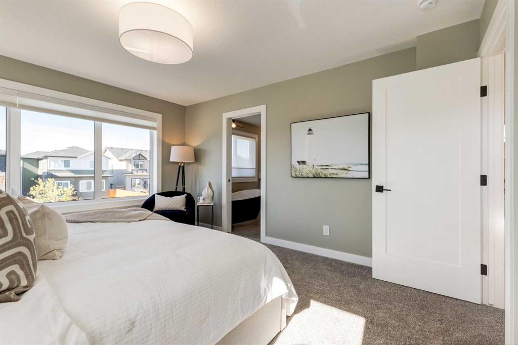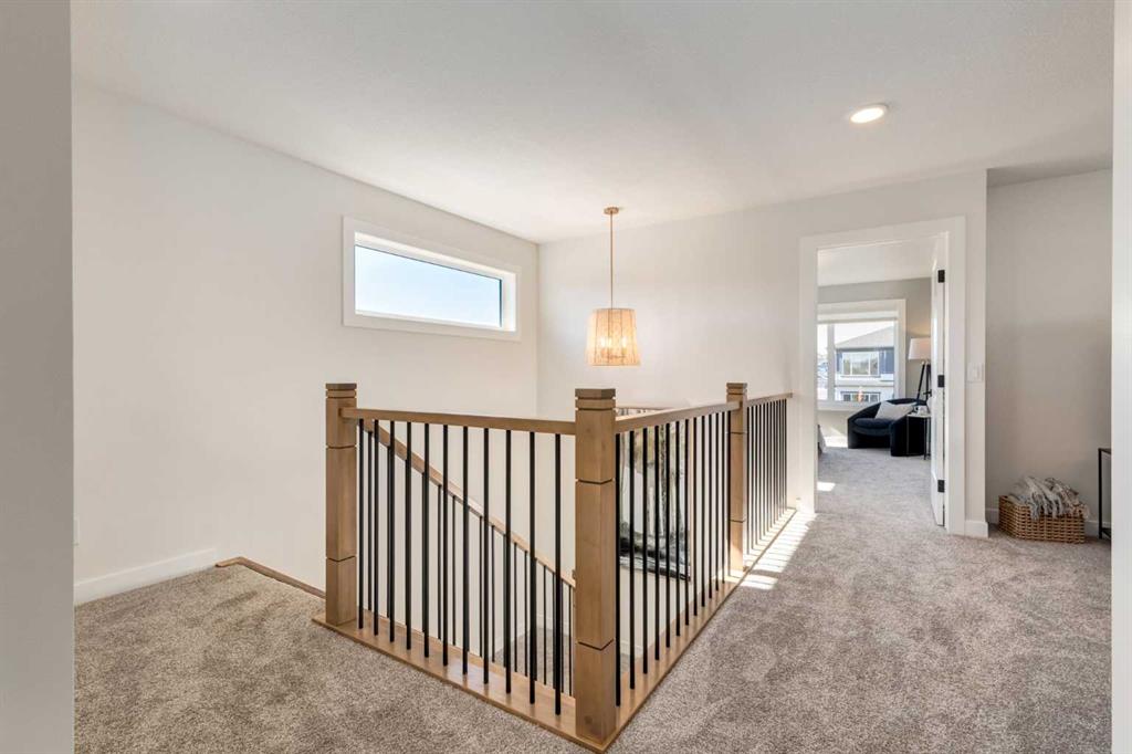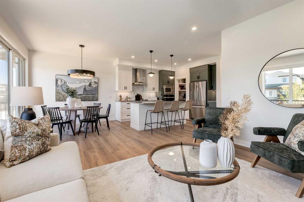 This beautifully designed former showhome offers a bright, open-concept layout that seamlessly connects the kitchen, dining, and living areas, creating an inviting space for both everyday living and entertaining. The kitchen is thoughtfully appointed with a large central island, quartz countertops, stainless steel appliances, and a striking blend of white and rich green cabinetry. A butler’s pantry and walkthrough mudroom connect the garage to the kitchen, adding exceptional functionality and storage. Pendant lighting, upgraded fixtures, and a full-height backsplash complete the space with a clean, modern finish. The living room is anchored by a gas fireplace with tile extending from floor to ceiling, creating a warm and contemporary focal point. Large windows allow natural light to fill the space, while wide-plank flooring and neutral tones enhance the home’s cohesive design. Just off the main living area, the dining space offers direct access to a full-width rear deck with a BBQ gas line, making indoor-outdoor living effortless. The home backs west onto green space, providing privacy and beautiful afternoon light. Upstairs, the primary bedroom is a serene retreat designed for comfort and relaxation. It features generous proportions, plush carpeting, and large windows that frame views of the surrounding community. The upgraded five-piece ensuite includes a freestanding soaker tub, a walk-in glass shower, dual vanities with ample storage, and modern fixtures, creating a spa-inspired atmosphere. Additional upper-level highlights include a bonus room, two secondary bedrooms, and a conveniently located laundry area. The professionally developed basement adds valuable living space and includes a recreation area, an additional bedroom, and a full bathroom, making it ideal for guests, extended family, or a home office setup. Landscaping, custom window coverings, and an upgraded lighting package are already in place, allowing the next owner to enjoy the home without additional work. Immediate possession is available, offering a rare opportunity to move into a finished, thoughtfully designed property. Located in the sought-after community of Greystone in Cochrane, this home is surrounded by scenic pathways, green spaces, and easy access to the Bow River. Residents enjoy a strong sense of community, nearby schools, parks, and convenient access to local amenities, while still being just a short drive to Calgary. Greystone offers a perfect balance of small-town charm and modern living, making it an ideal place to call home. Book your private showing today! *Measurements were pulled from builder drawings*