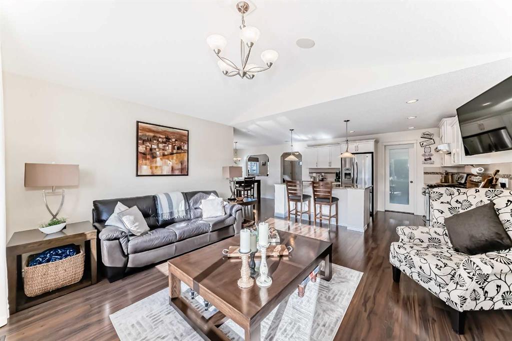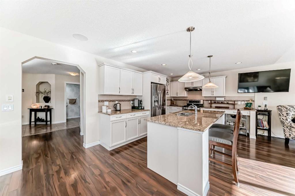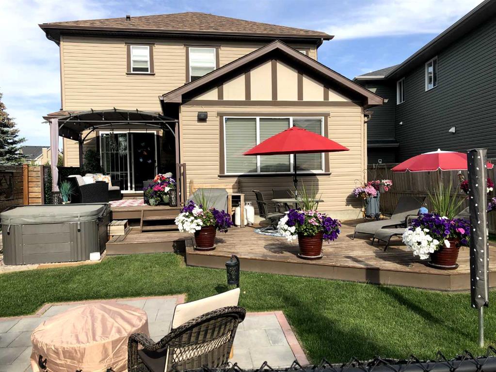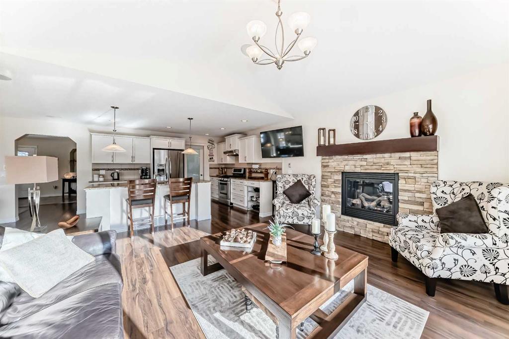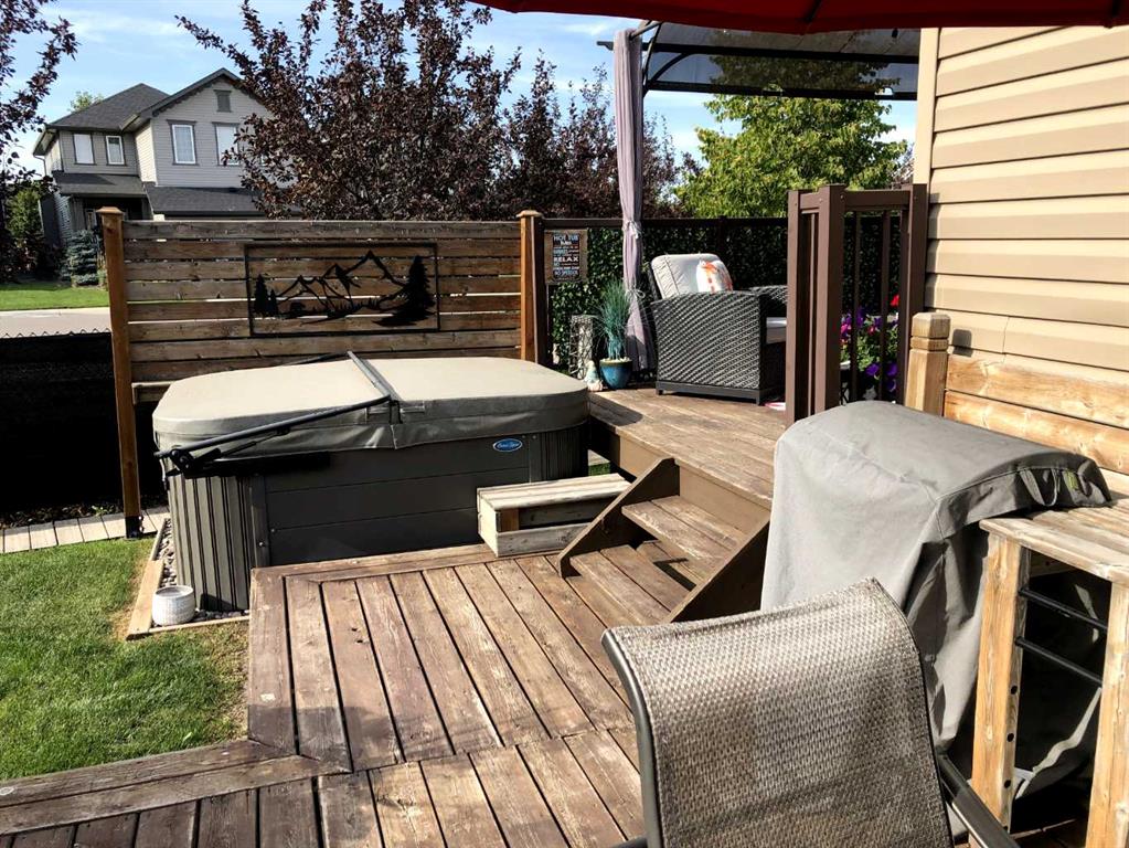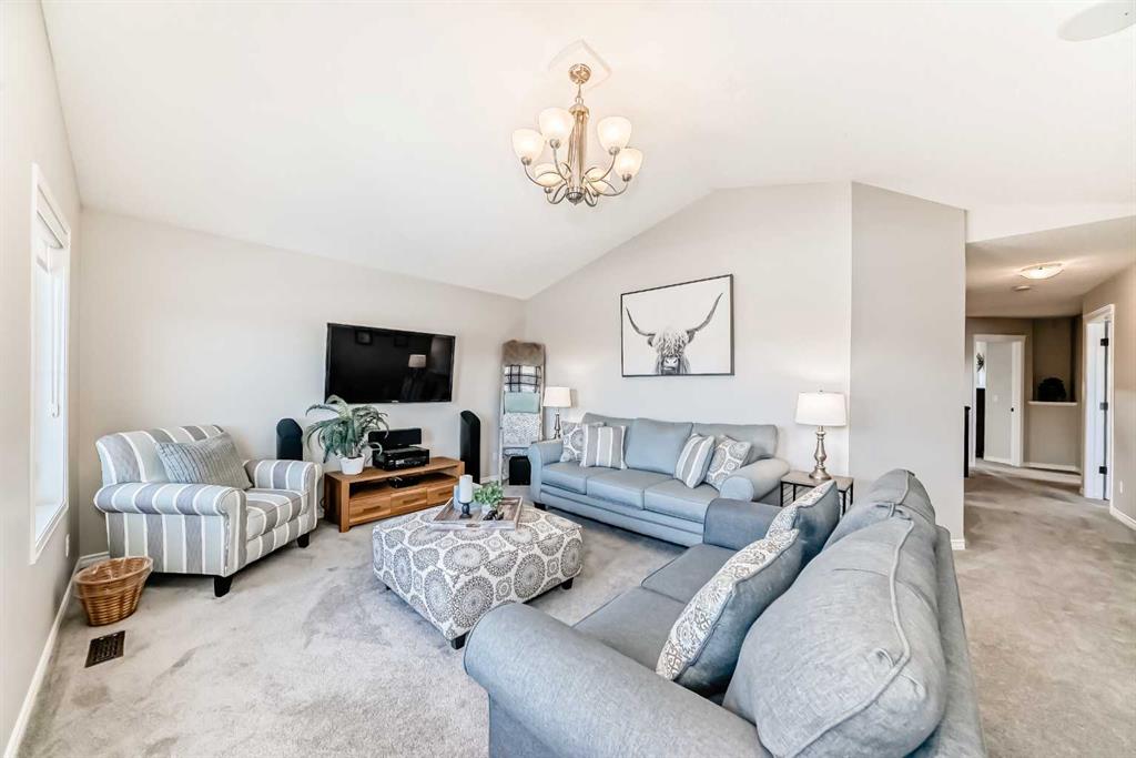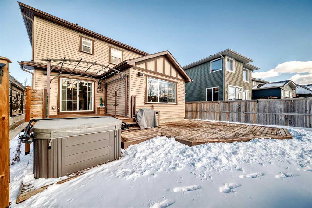 Welcome to this 4 bdrm, 3.5 bath, fully finished, immaculate one-owner home, built by Mckee Homes, in the beautiful, family-friendly, sought-after community of Ravenswood Airdrie. Situated with city greenspace to the north (no shovelling), walking paths behind, with a large sun-catching south/west-facing yard and a 2-tiered deck. With over 2,900 sq ft of finished living space and the flex/poss 5th bdrm in the basement, there is room here for a growing family. Walking in, you will love the open concept, which includes a 2-piece bath to the left, a door to the mudroom that connects to the laundry room, pantry and kitchen, and the garage entrance. Ahead is an office space, then into the open kitchen, dining and living room area. Large south/west windows fill the rooms with an abundance of natural light. The kitchen is for someone who loves to cook and entertain with modern white cabinetry, granite counters with ample counter space and an island. SS appliances, a 5-burner gas stove, a DBL Door refrigerator w water and ice maker and a large pantry make this plan ideal. The living room is vaulted and has a cozy gas fireplace with a fan and a stone front, and the dining area will fit a large table for family meals. Then through the sliding patio doors onto an extra-large 2-tiered deck w a hot tub, paved patio area with a firepit, privacy screen, extra power outlets, and a huge backyard for gardening and entertaining. Upstairs is a vaulted, bright bonus room, perfect for an extra TV room or play area for the kids. 3 bedrooms and 2 bathrooms. All the rooms are a good size, with the primary large enough to fit not only a king-size bed but also all your large bedroom furniture and your extensive wardrobe in the walk-in closet. The ensuite is very spacious with dual vanities on a long counter, a large separate shower and a soaker tub with a separate shower head. Downstairs, you will find a 4 th bdrm without a closet, another flex room with two windows that could easily be turned into a 5 th bdrm. As well as another bathroom, plus a fabulous bar and entertainment room, with a natural theme for relaxing. All TVs and TV mounts throughout the house stay, as do the hot tub, shed, bar fridge, SONOS sound system, and built-in speakers throughout the house, including both back decks, the lower deck is also fitted with low level lighting. New roof shingles in 2021, Gas hot water tank 2020, carpets upstairs 2024, built-in Telus security system that the buyer can take over, the seller is paying $25 + tax a month. The smoke detector is also linked to Telus security. This home is a one-owner home and is immaculate and feels like new inside. You will not be disappointed. It's got quick access to parks, pathways, nearby schools, and shopping at the Yankee Valley Crossing Shopping Plaza, the Kingsview Plaza Sierra Springs Plaza. Access the rest of the city and Calgary through several nearby major roadways, including Deerfoot Trail, Yankee Valley Blvd. Downtown Calgary is a 23 min drive.