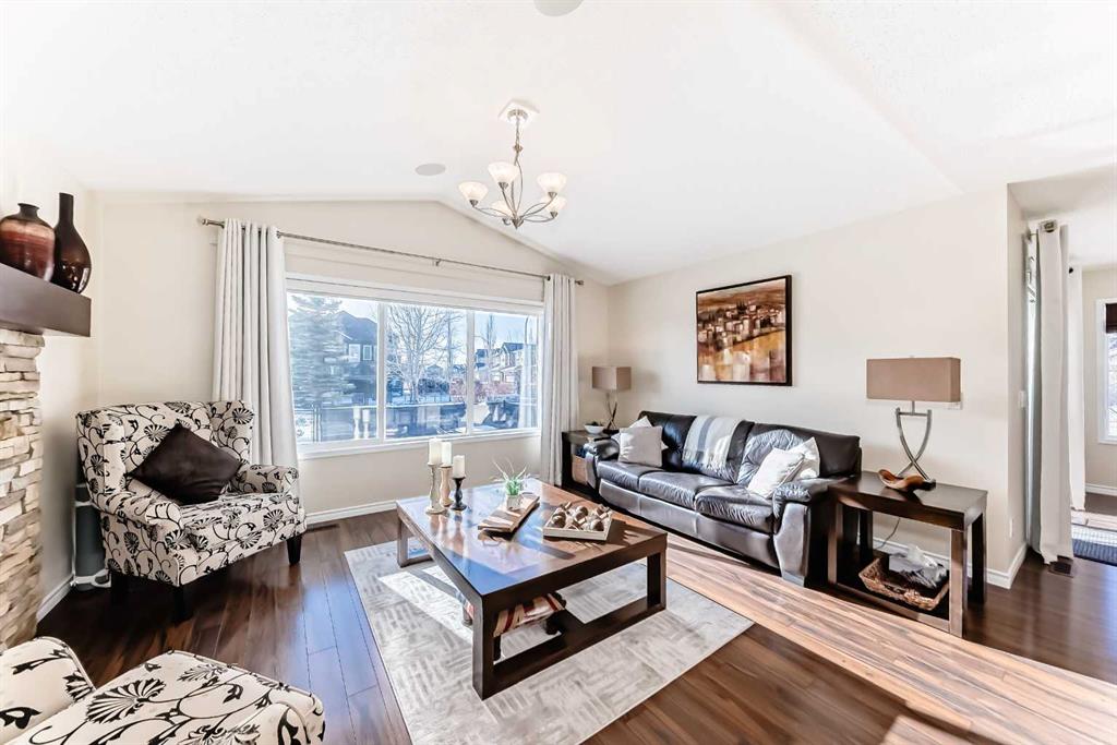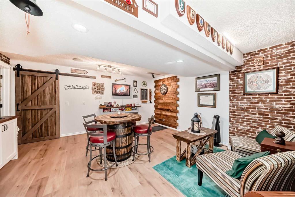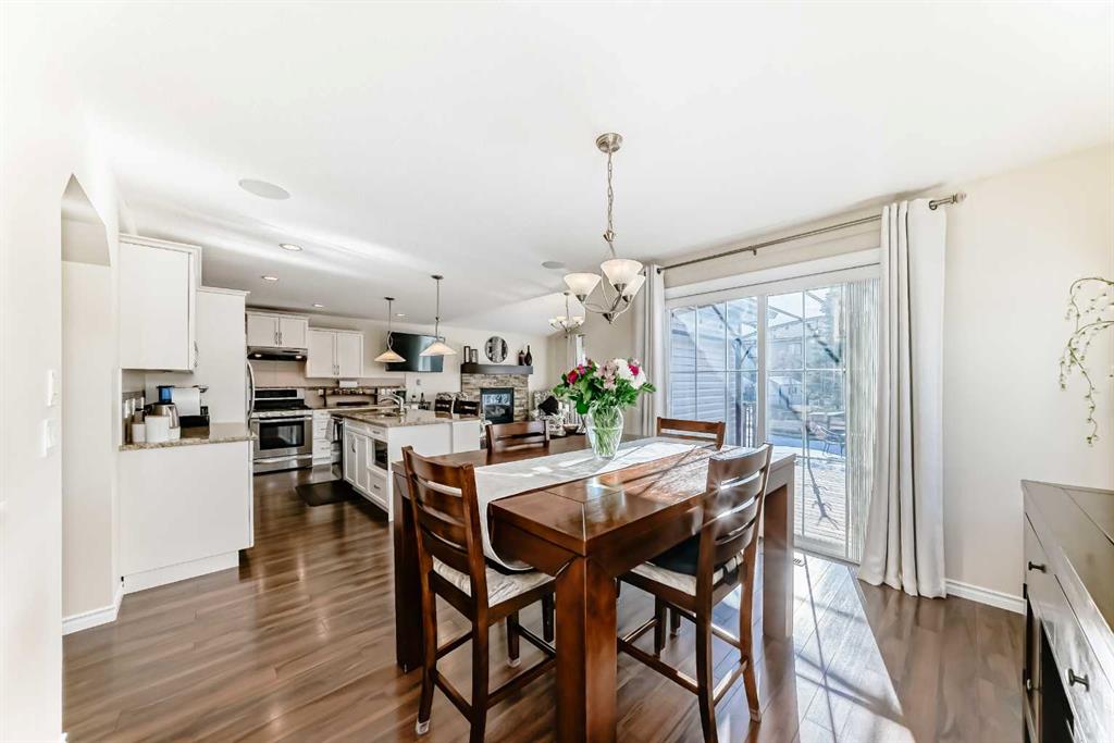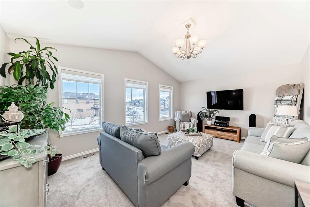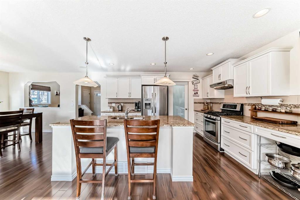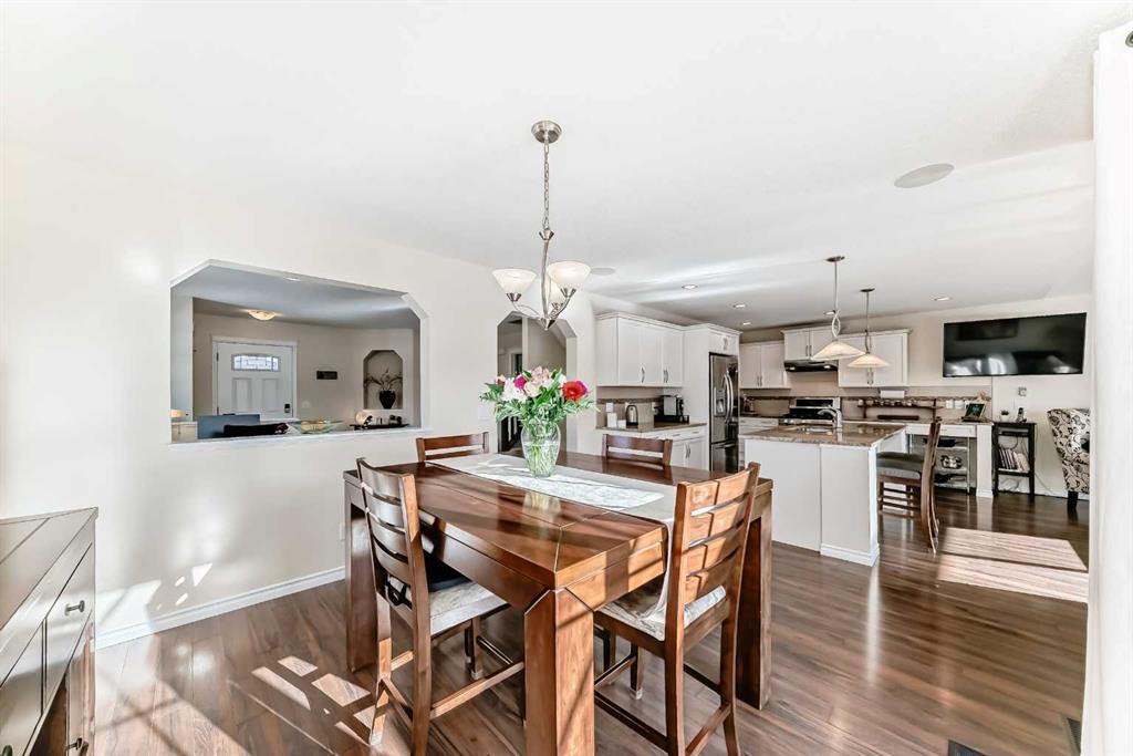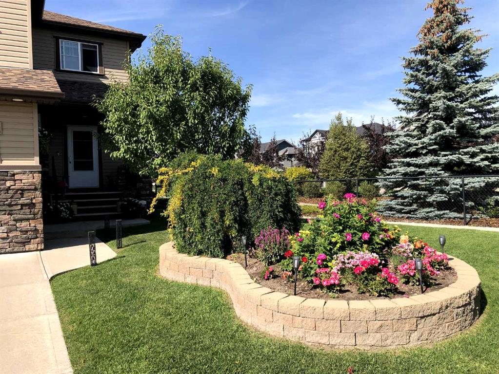 Welcome to this 4 bdrm, 3.5 bath, fully finished, immaculate one-owner home, built by Mckee Homes, in the beautiful, family-friendly, sought-after community of Ravenswood Airdrie. Situated with city greenspace to the north (no shovelling), walking paths behind, with a large sun-catching south/west-facing yard and a 2-tiered deck. With over 2,900 sq ft of finished living space and the flex/poss 5th bdrm in the basement, there is room here for a growing family. Walking in, you will love the open concept, which includes a 2-piece bath to the left, a door to the mudroom that connects to the laundry room, pantry and kitchen, and the garage entrance. Ahead is an office space, then into the open kitchen, dining and living room area. Large south/west windows fill the rooms with an abundance of natural light. The kitchen is for someone who loves to cook and entertain with modern white cabinetry, granite counters with ample counter space and an island. SS appliances, a 5-burner gas stove, a DBL Door refrigerator w water and ice maker and a large pantry make this plan ideal. The living room is vaulted and has a cozy gas fireplace with a fan and a stone front, and the dining area will fit a large table for family meals. Then through the sliding patio doors onto an extra-large 2-tiered deck w a hot tub, paved patio area with a firepit, privacy screen, extra power outlets, and a huge backyard for gardening and entertaining. Upstairs is a vaulted, bright bonus room, perfect for an extra TV room or play area for the kids. 3 bedrooms and 2 bathrooms. All the rooms are a good size, with the primary large enough to fit not only a king-size bed but also all your large bedroom furniture and your extensive wardrobe in the walk-in closet. The ensuite is very spacious with dual vanities on a long counter, a large separate shower and a soaker tub with a separate shower head. Downstairs, you will find a 4 th bdrm without a closet, another flex room with two windows that could easily be turned into a 5 th bdrm. As well as another bathroom, plus a fabulous bar and entertainment room, with a natural theme for relaxing. All TVs and TV mounts throughout the house stay, as do the hot tub, shed, bar fridge, SONOS sound system, and built-in speakers throughout the house, including both back decks, the lower deck is also fitted with low level lighting. New roof shingles in 2021, Gas hot water tank 2020, carpets upstairs 2024, built-in Telus security system that the buyer can take over, the seller is paying $25 + tax a month. The smoke detector is also linked to Telus security. This home is a one-owner home and is immaculate and feels like new inside. You will not be disappointed. It's got quick access to parks, pathways, nearby schools, and shopping at the Yankee Valley Crossing Shopping Plaza, the Kingsview Plaza Sierra Springs Plaza. Access the rest of the city and Calgary through several nearby major roadways, including Deerfoot Trail, Yankee Valley Blvd. Downtown Calgary is a 23 min drive.