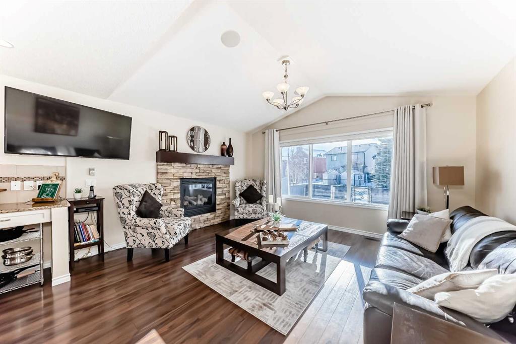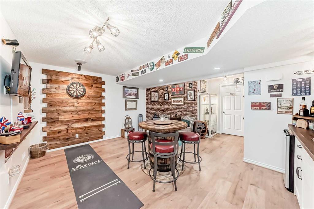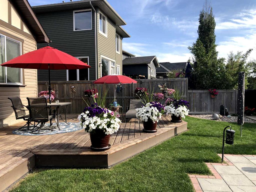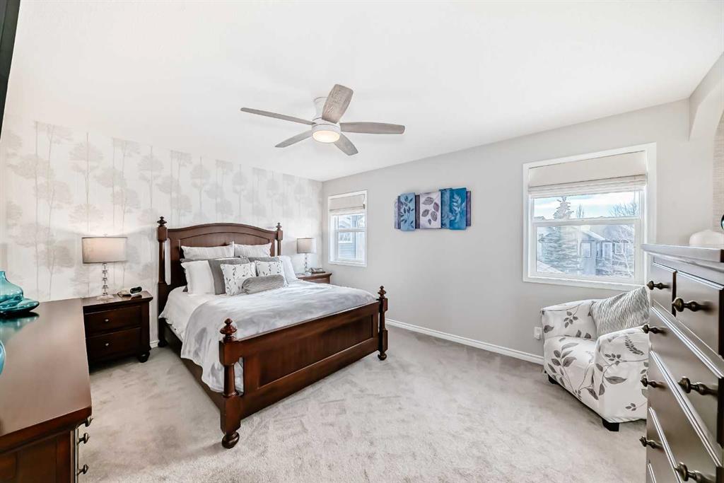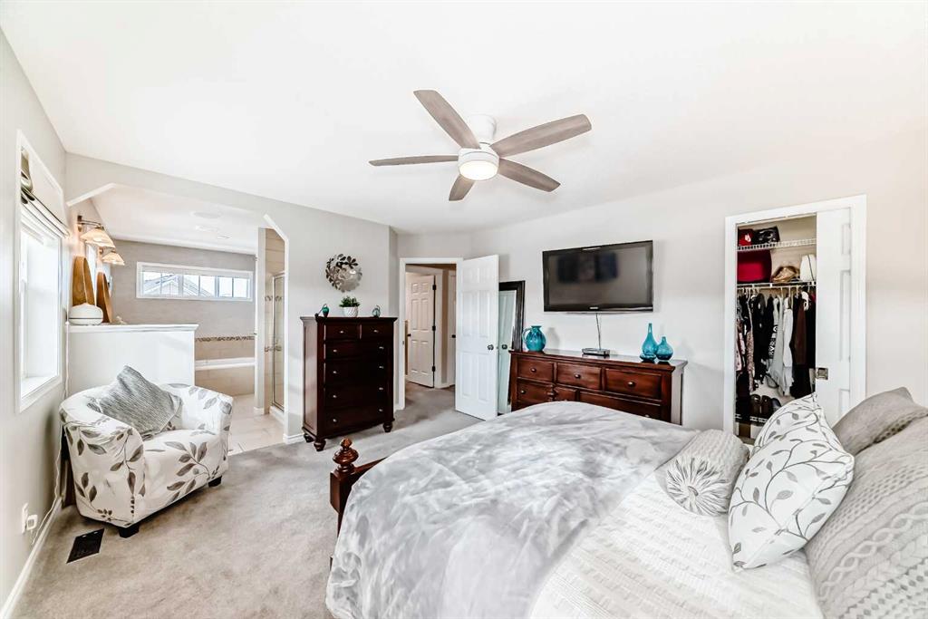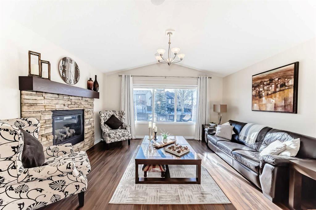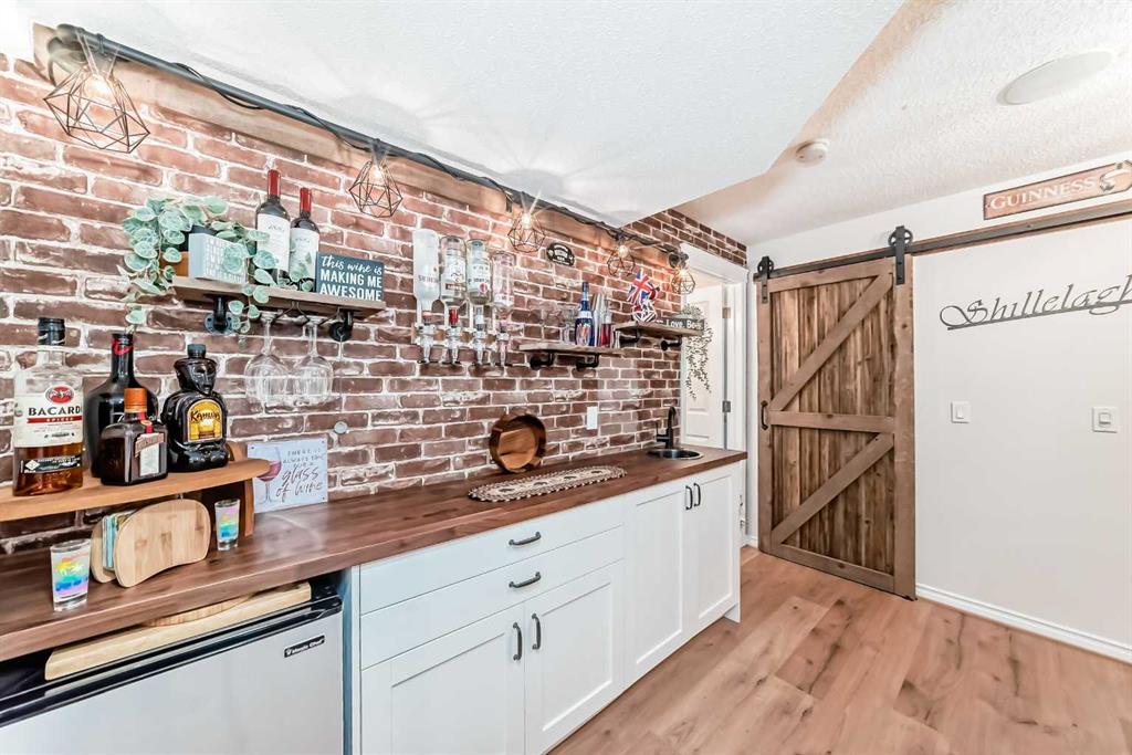 Welcome to this 4 bdrm, 3.5 bath, fully finished, immaculate one-owner home, built by Mckee Homes, in the beautiful, family-friendly, sought-after community of Ravenswood Airdrie. Situated with city greenspace to the north (no shovelling), walking paths behind, with a large sun-catching south/west-facing yard and a 2-tiered deck. With over 2,900 sq ft of finished living space and the flex/poss 5th bdrm in the basement, there is room here for a growing family. Walking in, you will love the open concept, which includes a 2-piece bath to the left, a door to the mudroom that connects to the laundry room, pantry and kitchen, and the garage entrance. Ahead is an office space, then into the open kitchen, dining and living room area. Large south/west windows fill the rooms with an abundance of natural light. The kitchen is for someone who loves to cook and entertain with modern white cabinetry, granite counters with ample counter space and an island. SS appliances, a 5-burner gas stove, a DBL Door refrigerator w water and ice maker and a large pantry make this plan ideal. The living room is vaulted and has a cozy gas fireplace with a fan and a stone front, and the dining area will fit a large table for family meals. Then through the sliding patio doors onto an extra-large 2-tiered deck w a hot tub, paved patio area with a firepit, privacy screen, extra power outlets, and a huge backyard for gardening and entertaining. Upstairs is a vaulted, bright bonus room, perfect for an extra TV room or play area for the kids. 3 bedrooms and 2 bathrooms. All the rooms are a good size, with the primary large enough to fit not only a king-size bed but also all your large bedroom furniture and your extensive wardrobe in the walk-in closet. The ensuite is very spacious with dual vanities on a long counter, a large separate shower and a soaker tub with a separate shower head. Downstairs, you will find a 4 th bdrm without a closet, another flex room with two windows that could easily be turned into a 5 th bdrm. As well as another bathroom, plus a fabulous bar and entertainment room, with a natural theme for relaxing. All TVs and TV mounts throughout the house stay, as do the hot tub, shed, bar fridge, SONOS sound system, and built-in speakers throughout the house, including both back decks, the lower deck is also fitted with low level lighting. New roof shingles in 2021, Gas hot water tank 2020, carpets upstairs 2024, built-in Telus security system that the buyer can take over, the seller is paying $25 + tax a month. The smoke detector is also linked to Telus security. This home is a one-owner home and is immaculate and feels like new inside. You will not be disappointed. It's got quick access to parks, pathways, nearby schools, and shopping at the Yankee Valley Crossing Shopping Plaza, the Kingsview Plaza Sierra Springs Plaza. Access the rest of the city and Calgary through several nearby major roadways, including Deerfoot Trail, Yankee Valley Blvd. Downtown Calgary is a 23 min drive.