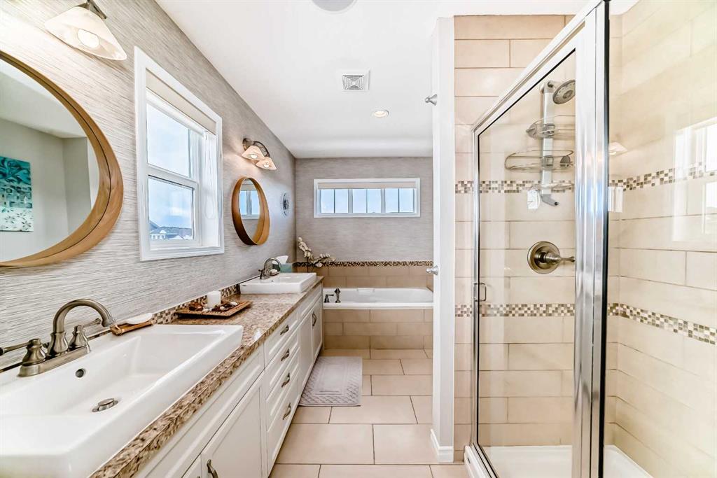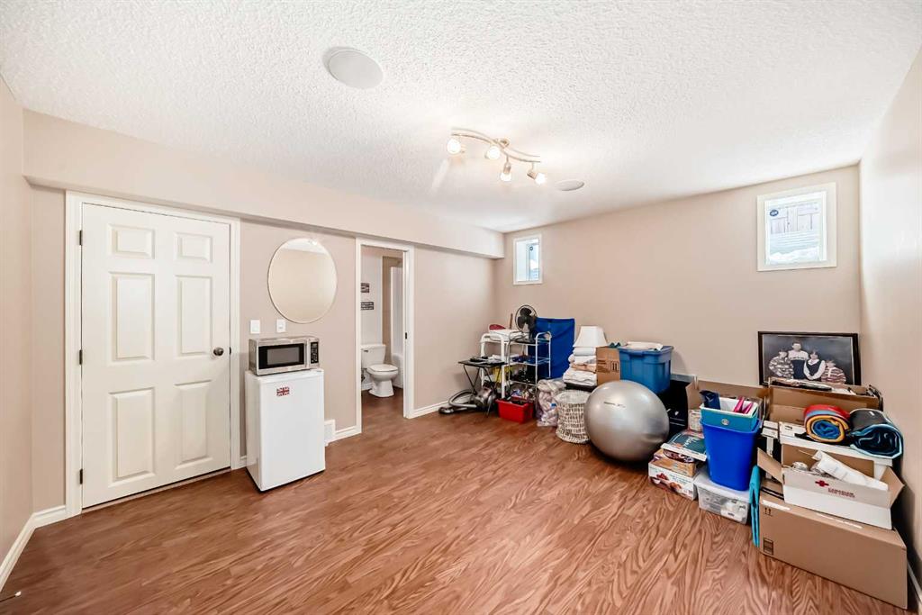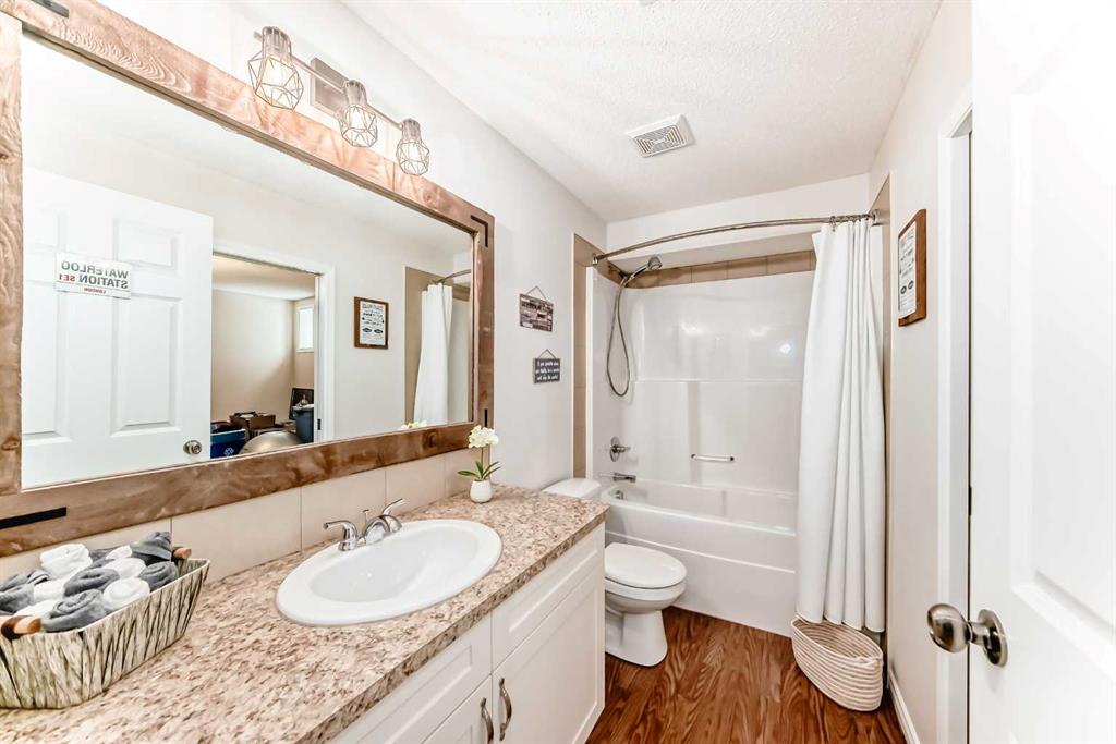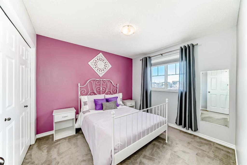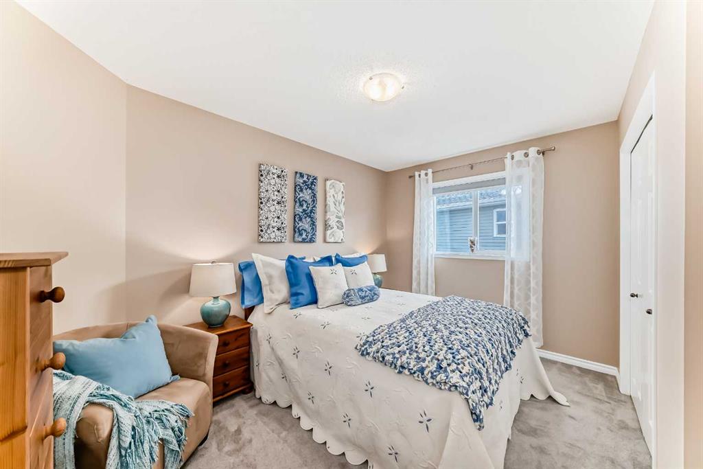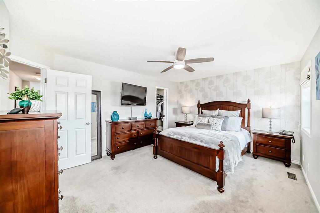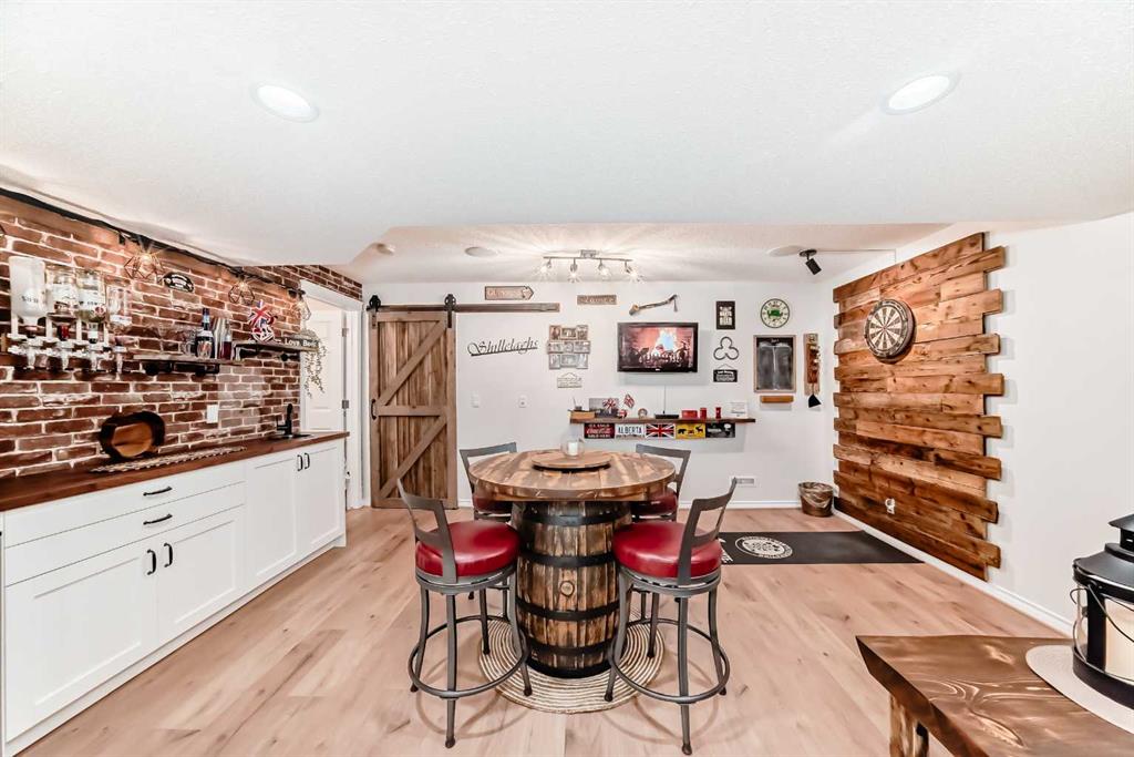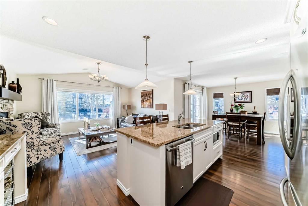 Welcome to this 4 bdrm, 3.5 bath, fully finished, immaculate one-owner home, built by Mckee Homes, in the beautiful, family-friendly, sought-after community of Ravenswood Airdrie. Situated with city greenspace to the north (no shovelling), walking paths behind, with a large sun-catching south/west-facing yard and a 2-tiered deck. With over 2,900 sq ft of finished living space and the flex/poss 5th bdrm in the basement, there is room here for a growing family. Walking in, you will love the open concept, which includes a 2-piece bath to the left, a door to the mudroom that connects to the laundry room, pantry and kitchen, and the garage entrance. Ahead is an office space, then into the open kitchen, dining and living room area. Large south/west windows fill the rooms with an abundance of natural light. The kitchen is for someone who loves to cook and entertain with modern white cabinetry, granite counters with ample counter space and an island. SS appliances, a 5-burner gas stove, a DBL Door refrigerator w water and ice maker and a large pantry make this plan ideal. The living room is vaulted and has a cozy gas fireplace with a fan and a stone front, and the dining area will fit a large table for family meals. Then through the sliding patio doors onto an extra-large 2-tiered deck w a hot tub, paved patio area with a firepit, privacy screen, extra power outlets, and a huge backyard for gardening and entertaining. Upstairs is a vaulted, bright bonus room, perfect for an extra TV room or play area for the kids. 3 bedrooms and 2 bathrooms. All the rooms are a good size, with the primary large enough to fit not only a king-size bed but also all your large bedroom furniture and your extensive wardrobe in the walk-in closet. The ensuite is very spacious with dual vanities on a long counter, a large separate shower and a soaker tub with a separate shower head. Downstairs, you will find a 4 th bdrm without a closet, another flex room with two windows that could easily be turned into a 5 th bdrm. As well as another bathroom, plus a fabulous bar and entertainment room, with a natural theme for relaxing. All TVs and TV mounts throughout the house stay, as do the hot tub, shed, bar fridge, SONOS sound system, and built-in speakers throughout the house, including both back decks, the lower deck is also fitted with low level lighting. New roof shingles in 2021, Gas hot water tank 2020, carpets upstairs 2024, built-in Telus security system that the buyer can take over, the seller is paying $25 + tax a month. The smoke detector is also linked to Telus security. This home is a one-owner home and is immaculate and feels like new inside. You will not be disappointed. It's got quick access to parks, pathways, nearby schools, and shopping at the Yankee Valley Crossing Shopping Plaza, the Kingsview Plaza Sierra Springs Plaza. Access the rest of the city and Calgary through several nearby major roadways, including Deerfoot Trail, Yankee Valley Blvd. Downtown Calgary is a 23 min drive.