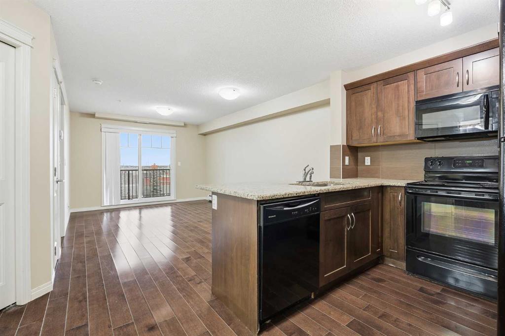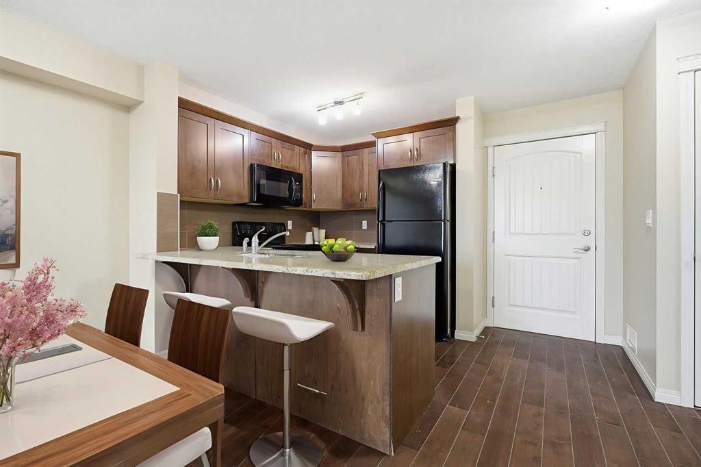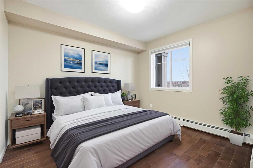 1 BED / 1 BATH UNIT WITH TITLED PARKING IN PANORAMA WEST! Experience an elevated lifestyle in this timeless condo located in the heart of Panorama Hills. This modern unit features tall ceilings, warm beige tones, and rich brown laminate flooring throughout. The spacious kitchen is finished with matching brown cabinetry, stainless black appliances, granite countertops, and a large breakfast island—perfect for both everyday living and entertaining. The open-concept living area offers plenty of room to relax and leads to a generously sized balcony through patio doors, allowing for abundant natural light. The well-designed layout includes a spacious bedroom with a large window, walk-in closet, and convenient access to the 4-piece bathroom. Additional highlights include in-unit laundry, a storage locker, and a titled parking stall. Ideally located just steps from shopping centres, schools, and playgrounds, this home is perfect for first-time buyers or investors seeking excellent value in a prime community. Book your private showing today!