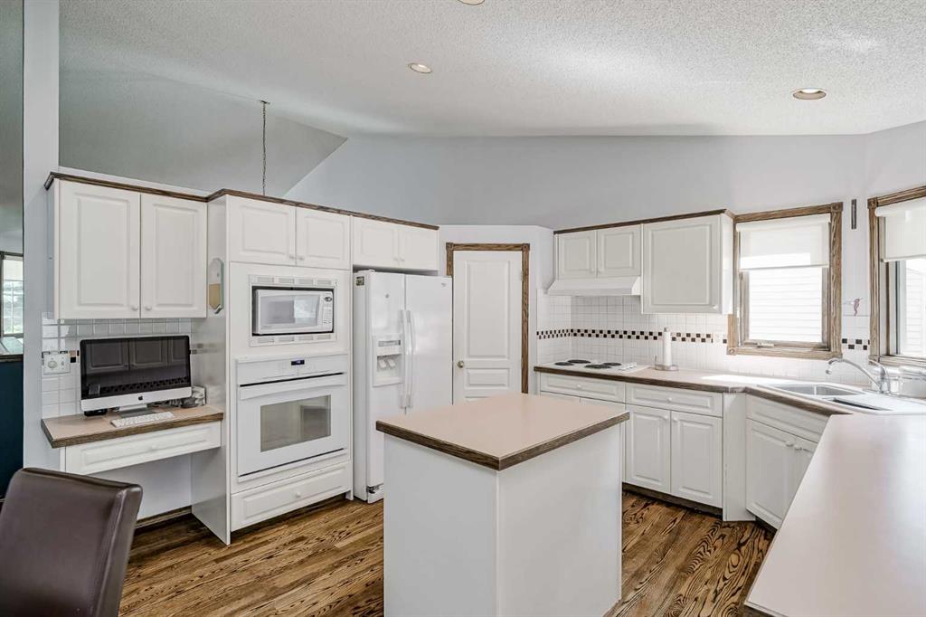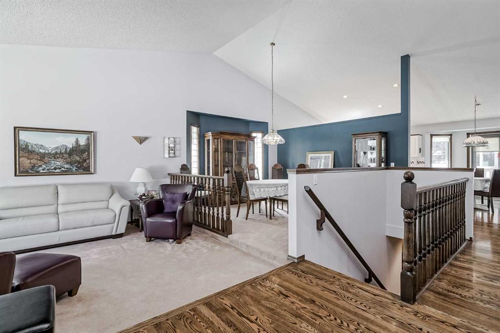 Experience the pinnacle of convenience and comfort in this meticulously maintained bungalow, perfectly situated in the highly desirable community of Evergreen. This residence offers a rare lifestyle opportunity, located just steps from the natural beauty of Fish Creek Provincial Park, local schools, and the C-Train station, providing an ideal balance of nature and urban accessibility. Designed for effortless single-level living, the home immediately impresses with a grand living room defined by soaring vaulted ceilings and expansive windows that flood the space with natural light. Rich hardwood flooring flows throughout the main floor, leading you into a tastefully appointed kitchen. With its classic white cabinetry and bright, airy atmosphere, the kitchen serves as a central hub, overlooking the tranquil backyard while catering to both casual morning coffees in the breakfast nook and elegant evenings in the dedicated dining room. The adjacent family room provides a warm and inviting retreat, anchored by a cozy fireplace and custom built-in shelving perfect for your personal library or cherished collectibles. The main floor is further enhanced by a primary suite designed as a true sanctuary. This spacious retreat features a generous walk-in closet and a spa-like four-piece ensuite bathroom, complete with a deep soaking tub and a separate walk-in shower for a private, high-end experience. The partially finished lower level significantly expands the living footprint, offering a versatile family room and two additional comfortable bedrooms supported by a full bathroom. A large undeveloped area remains, providing incredible potential for future customization or extensive storage. Outdoor living is a highlight of the property, featuring a large, covered rear deck that allows you to enjoy the beautifully landscaped yard regardless of the weather. Complete with a double attached garage and a location that places the best of the Southside at your doorstep, this Evergreen gem represents a sophisticated find in today's market. Exquisite Comfort. Premier Location. Your Evergreen Sanctuary Awaits.