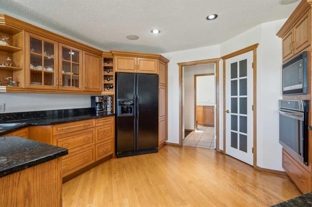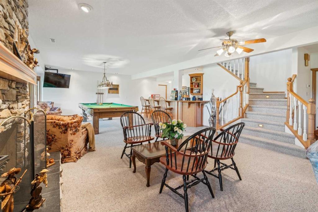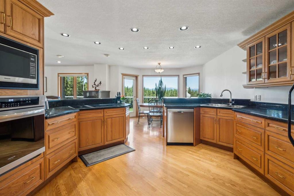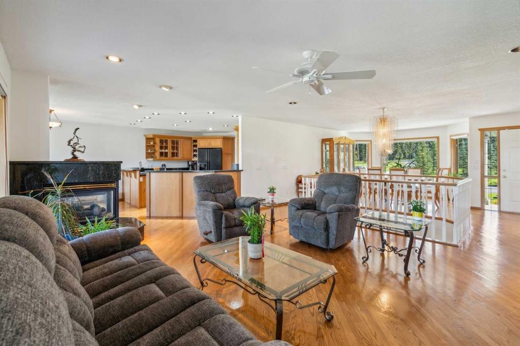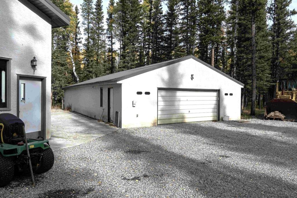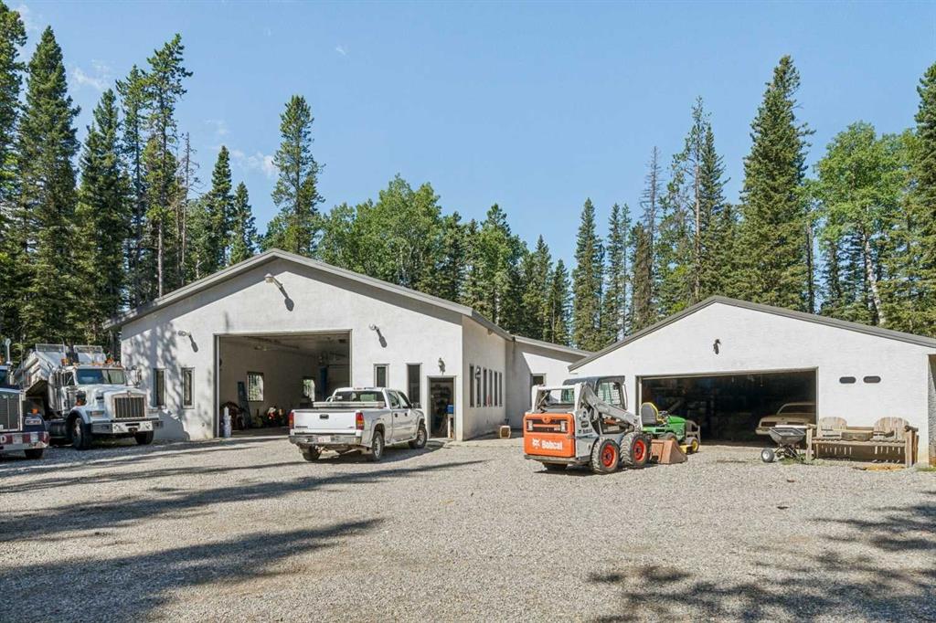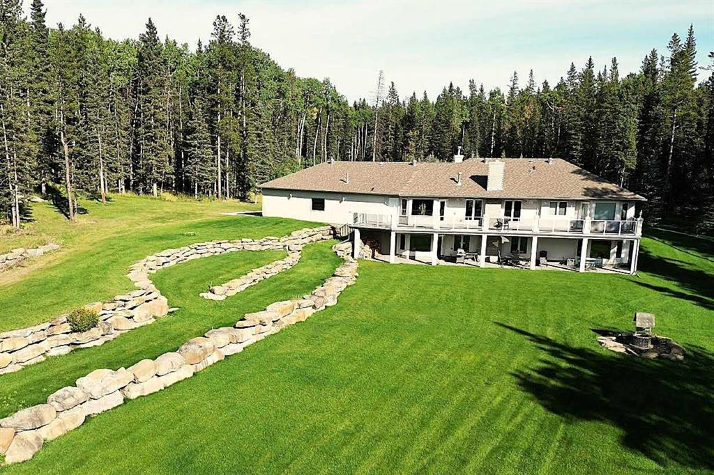 ** GORGEOUS VIEWS, GREAT SETTING** Less than thirty minutes from Calgary lies a jewel of a home, a secluded acreage with stunning views, and some very unique outbuildings. This 23 acre estate has a main floor and lower-level walkout; both with sweeping vistas of the impressively landscaped backyard and mountains beyond. Upon arrival through the private cul-de-sac, the first thing you notice are the impeccably maintained lawns and groomed driveway. The front entrance opens to a bright foyer that leads either to a formal dining area, or to a grand living room with site-finished oak floors and many windows showcasing the beauty beyond. It shares a three-way gas fireplace with the cosy dining nook and bay window, and the updated kitchen with quartz countertops and a large walk-through pantry. The pantry connects to the generous garage mudroom and laundry room. The large back deck runs along the length of the house and opens into the primary bedroom suite with walk-in closet, bay window, and 4-piece en-suite. This wing of the house has two more good size bedrooms and another full bathroom. The heated large three-car garage is an appealing feature with almost 1400 square feet of room, plenty of storage, windows, and a separate stair leading to the lower level. Downstairs you’ll find a large rec room with updated Berber carpet and a fieldstone floor-to-ceiling wood-burning fireplace, as well as an amazing bar with its own full size fridge and dishwasher- the perfect place to entertain. There is also a spacious office, and another bedroom and bath that would be perfect for guests. Leaving the main house, you’ll come to a truly special feature of the property, a large shop which is a mechanics dream. Not only does it have a ten thousand pound hoist and lift, but also radiant in-floor heat, and has its own bathroom, shower and laundry. Socks not completely knocked off? Attached is a very spacious area that used to be a fully functional butcher shop, complete with a large walk-in cooler. Although this space would be a hunter's delight, it also has many possibilities for studio space, other hobbies, or home based business, with its gleaming tile, industrial sinks, and extensive counters. There is also another 30 x 60 storage building for the toys; to store boats, cars, recreational vehicles or any other equipment. This acreage is one of a kind!