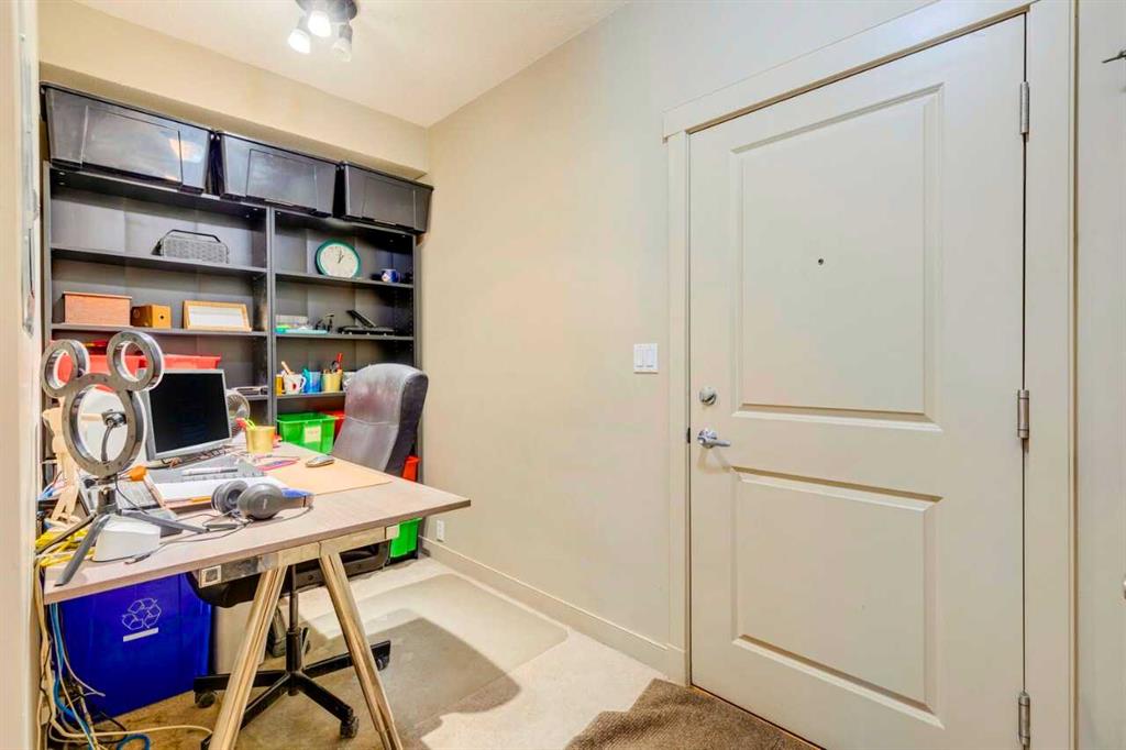 This ground-floor unit offers a functional layout with defined spaces, including an area suitable for office use. It is designed for low-maintenance living and features an east-facing orientation that provides morning sunlight. The unit has direct exterior access with a front door opening to a sidewalk, allowing convenient loading and unloading. Parking is located directly below the unit and can be accessed by stairs from the rear entrance. Constructed with concrete, the building is designed to provide enhanced structural durability and acoustic separation. Mechanical and electrical systems are centralized, which may reduce the amount of in-unit equipment such as a furnace or hot water tank. Residents have access to a well-maintained 24-hour fitness facility, an interior courtyard garden, and rentable guest suites. The Garrison Green community features limited through-traffic and several nearby parks, green spaces, and walking paths. Local amenities include nearby retail areas on both the east and west sides of the community, as well as close proximity to North Glenmore Park, Rockyview General Hospital, and several shopping centres. Major roadways such as Crowchild Trail and Glenmore Trail provide convenient citywide access. Public transit options are extensive due to the community’s location adjacent to Mount Royal University, whose recreation facilities also offer public memberships. Proximity to Lakeview and Earl Grey golf courses, along with access to major roadways toward Bragg Creek and the mountains. Furniture may be available by separate agreement.
