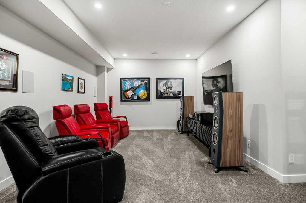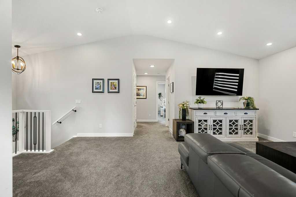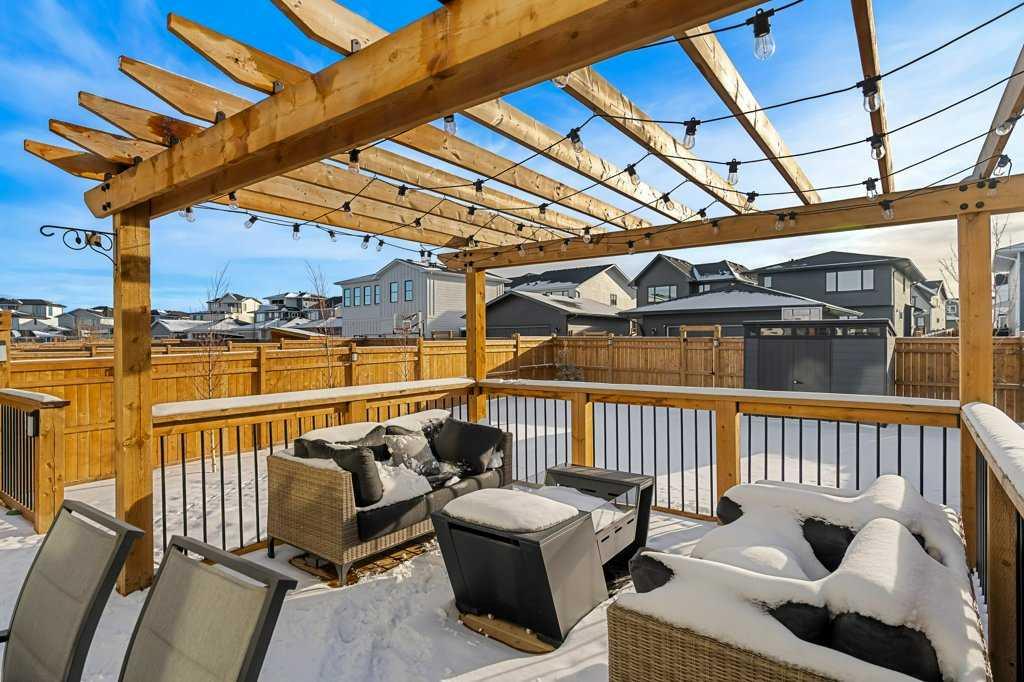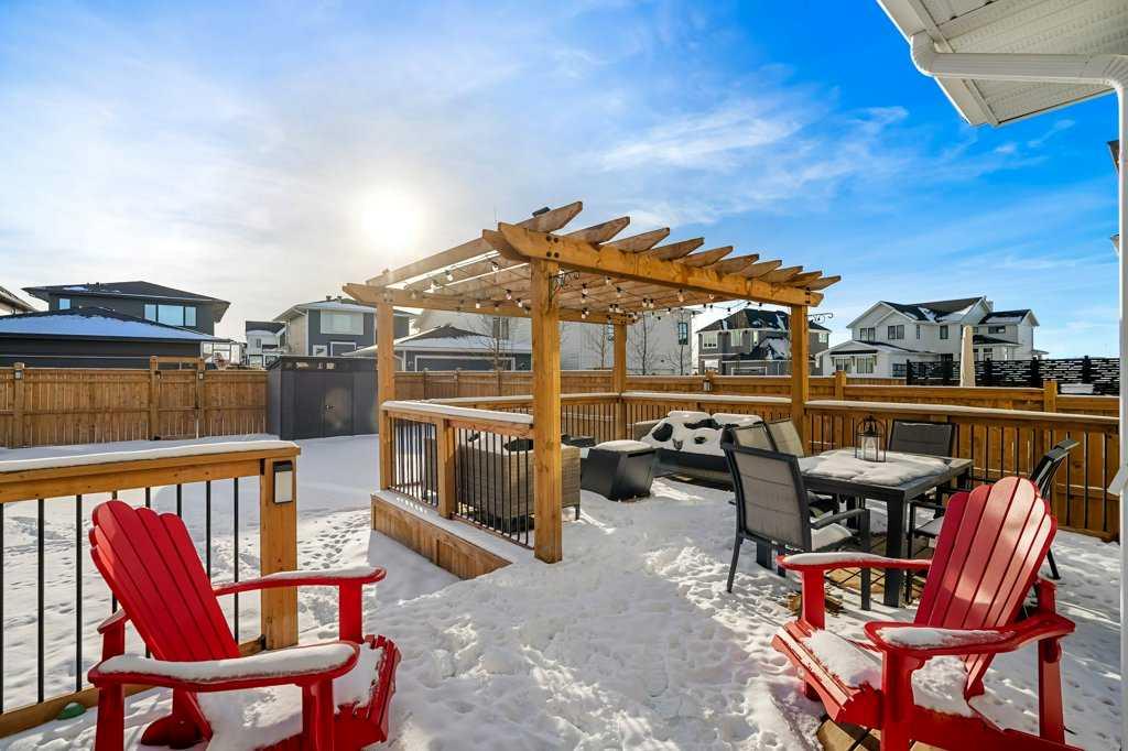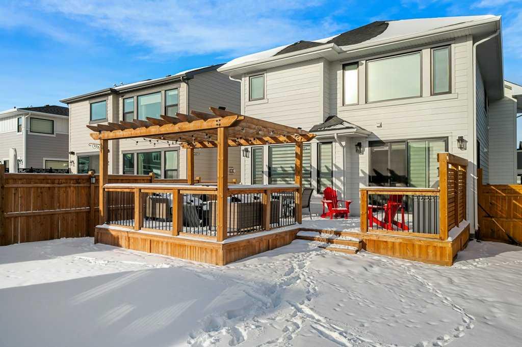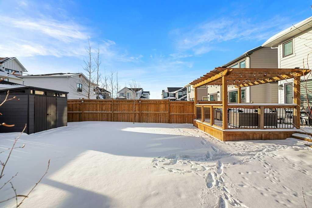 Exceptional Sterling Homes built Allure 3 plan featuring a south-facing backyard and extensive upgrades throughout. The exterior showcases durable Hardie board and stone, with an attached double garage and paved back lane. The oversized, fully fenced yard (approximately 139–135 feet deep) includes a large deck, privacy-side pergola, storage shed, BBQ gas line, and expansive sliding doors that seamlessly connect indoor and outdoor living. The main floor is thoughtfully designed with 9’ knockdown ceilings, LVP flooring, silhouette blinds, and a stunning floor-to-ceiling stone fireplace anchoring the living area. The chef’s kitchen is a showstopper with white perimeter cabinetry and a light grey waterfall island, quartz countertops, soft-close cabinetry with crown molding, dovetail drawers, gold accents, pot lighting, and a Silgranite sink. Premium appliances include a Wolf 5-burner gas cooktop, chimney hood fan, built-in Wolf speed oven and wall oven, Miele dishwasher, Samsung smart refrigerator, and bar fridge. A walk-through pantry with pocket doors connects to the mudroom and garage entry. The mudroom offers dual closets and access to a stylish 2-piece bath, while the large front foyer includes a guest closet and broom storage. Upstairs features upgraded carpet with 10 lb underlay, an open rail staircase, and a central bonus room with vaulted ceiling and pot lights. The primary bedroom is positioned at the back of the home and includes a feature wall and barn door leading to a luxurious 5-piece ensuite with fully tiled shower (10 mm glass), soaker tub, tower cabinetry, and a walk-in closet with added shelving. Two front bedrooms share a beautifully finished 4-piece bath with quartz counters and tiled tub surround. Upper-floor laundry offers tile flooring, a window, and quartz folding counter. Three picture windows over the stairwell add abundant natural light. The professionally developed basement by the builder offers 9’ ceilings, a spacious recreation room, rough-in speakers, a bedroom currently used as a studio, storage under the stairs, and a rough-in for a future bathroom. The utility room includes a wash basin, HRV, sump pump, Kinetico water softener, high-efficiency dual-zone furnace, and ample storage. A meticulously upgraded home in the 4-season award winning community of Harmony with premium finishes, functional design, and exceptional indoor-outdoor living—this property is truly move-in ready and built to impress.