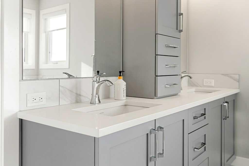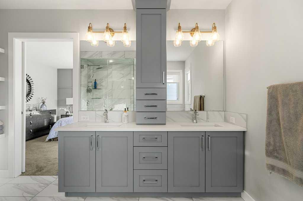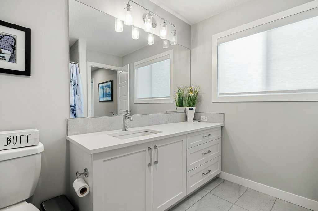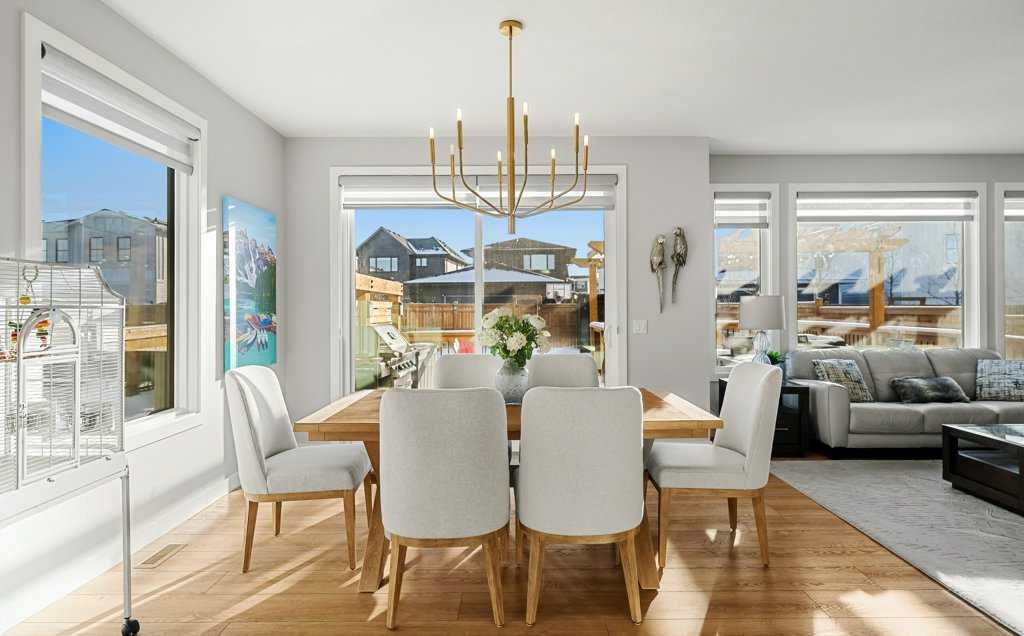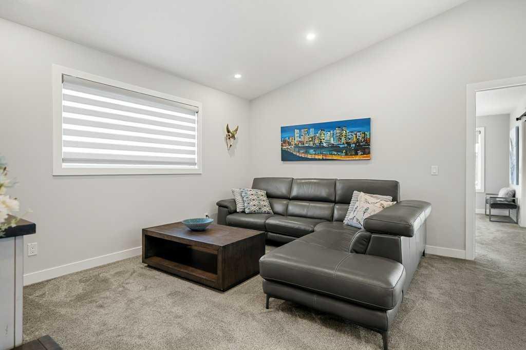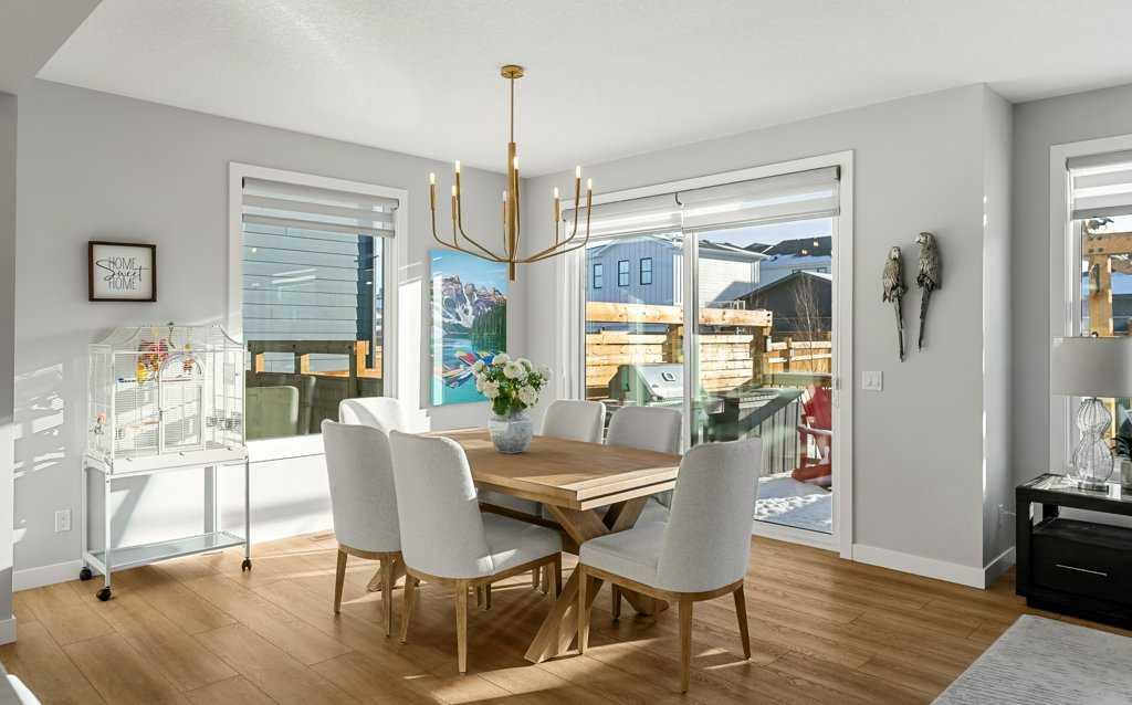 Exceptional Sterling Homes built Allure 3 plan featuring a south-facing backyard and extensive upgrades throughout. The exterior showcases durable Hardie board and stone, with an attached double garage and paved back lane. The oversized, fully fenced yard (approximately 139–135 feet deep) includes a large deck, privacy-side pergola, storage shed, BBQ gas line, and expansive sliding doors that seamlessly connect indoor and outdoor living. The main floor is thoughtfully designed with 9’ knockdown ceilings, LVP flooring, silhouette blinds, and a stunning floor-to-ceiling stone fireplace anchoring the living area. The chef’s kitchen is a showstopper with white perimeter cabinetry and a light grey waterfall island, quartz countertops, soft-close cabinetry with crown molding, dovetail drawers, gold accents, pot lighting, and a Silgranite sink. Premium appliances include a Wolf 5-burner gas cooktop, chimney hood fan, built-in Wolf speed oven and wall oven, Miele dishwasher, Samsung smart refrigerator, and bar fridge. A walk-through pantry with pocket doors connects to the mudroom and garage entry. The mudroom offers dual closets and access to a stylish 2-piece bath, while the large front foyer includes a guest closet and broom storage. Upstairs features upgraded carpet with 10 lb underlay, an open rail staircase, and a central bonus room with vaulted ceiling and pot lights. The primary bedroom is positioned at the back of the home and includes a feature wall and barn door leading to a luxurious 5-piece ensuite with fully tiled shower (10 mm glass), soaker tub, tower cabinetry, and a walk-in closet with added shelving. Two front bedrooms share a beautifully finished 4-piece bath with quartz counters and tiled tub surround. Upper-floor laundry offers tile flooring, a window, and quartz folding counter. Three picture windows over the stairwell add abundant natural light. The professionally developed basement by the builder offers 9’ ceilings, a spacious recreation room, rough-in speakers, a bedroom currently used as a studio, storage under the stairs, and a rough-in for a future bathroom. The utility room includes a wash basin, HRV, sump pump, Kinetico water softener, high-efficiency dual-zone furnace, and ample storage. A meticulously upgraded home in the 4-season award winning community of Harmony with premium finishes, functional design, and exceptional indoor-outdoor living—this property is truly move-in ready and built to impress.