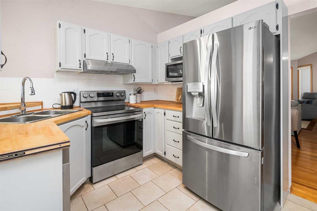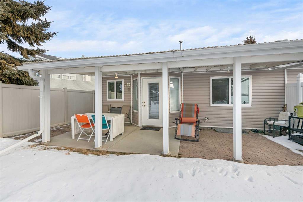 Welcome to this beautifully maintained bungalow villa, positioned to enjoy sweeping prairie and mountain views. You’ll be greeted by a bright, inviting living and dining area with vaulted ceilings and a cozy gas fireplace, filled with natural light. The kitchen features a butcher block countertop, ceramic tile flooring, and newer appliances, including a ThinkQ electric stove with convection oven and a refrigerator. Extend your living space outdoors to a covered pergola with a natural gas hookup—an ideal spot to unwind and soak in the surroundings. The main floor is designed for easy living, boasting original oak hardwood floors, fresh paint (2024), and updated lighting. The spacious primary bedroom offers a true retreat, while the second bedroom is currently used as an office with direct access to the garage. A modern main-floor bathroom with a large walk-in shower and a convenient powder room with stacking washer/dryer complete the level. The backyard, with patio and pergola, is a peaceful, sunny space to embrace the views of the mountains. You will love this unique location backing on to green space. There are garden plots for anyone wishing to exercise their green thumb. Downstairs, you’ll find a generous recreation room, a hobby area, ample storage, and an additional three-piece bathroom. This thoughtfully updated 55+ villa has seen improvements such as a new Air Ease furnace and hot water tank (2023), complete removal of Poly-B plumbing, updated main-floor bathrooms, and new eaves. Pride of ownership shines in this self-managed, mature living complex—move-in ready and waiting for you to call it home.