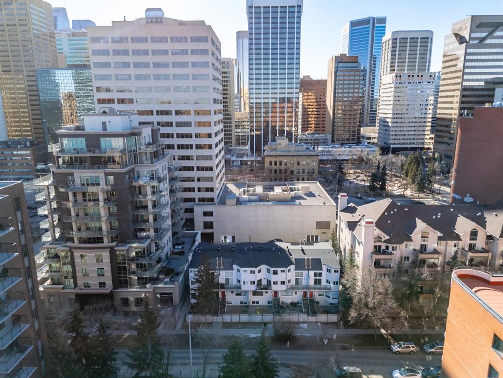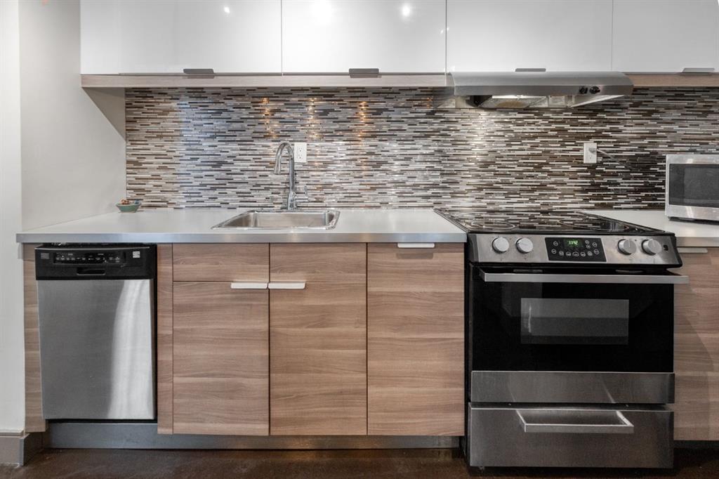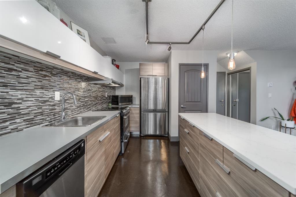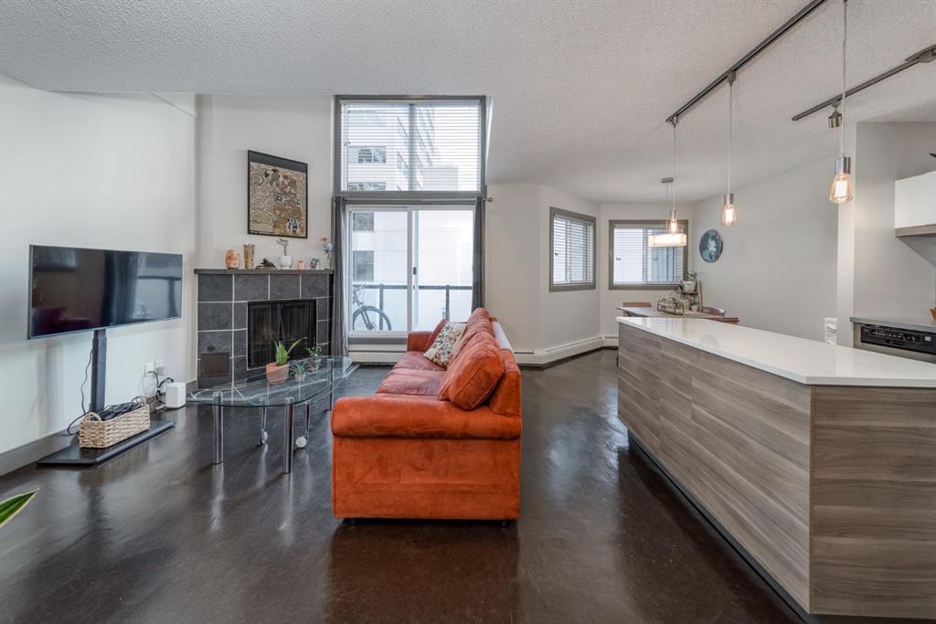 Welcome to this beautifully updated one-bedroom + loft condo, tucked away on a quiet street just steps to the Bow River Pathway and an easy walk to work, shopping, cafés, and recreation. Located in a boutique 20-unit building, this home offers privacy, character, and a prime inner-city location. The main level features an open-to-above design with soaring living room windows, stained concrete floors, and a cozy wood-burning fireplace, adding warmth and style. The updated kitchen shines with a quartz island, stainless steel appliances, and generous cabinet storage, combining style and functionality - perfect for casual dinners or entertaining friends. Full-size in-suite laundry adds everyday convenience, and fresh paint throughout enhances the clean, modern feel. Upstairs, upgraded laminate flooring flows through the bright loft and spacious primary bedroom. The loft provides an ideal home office or creative flex space, while the primary bedroom easily accommodates a king-sized bed and furnishings. Updated bath fixtures complete the upper level. Enjoy sunny south-facing exposure, updated windows and sliding doors, and a refreshed balcony with glass railing and Duradek. Secure building access to the second-level entry offers enhanced privacy. The assigned parking stall, complete with plug-in, is conveniently located adjacent to the secure building entrance. Stylish, low-maintenance, and truly move-in ready - this is inner-city living done right.