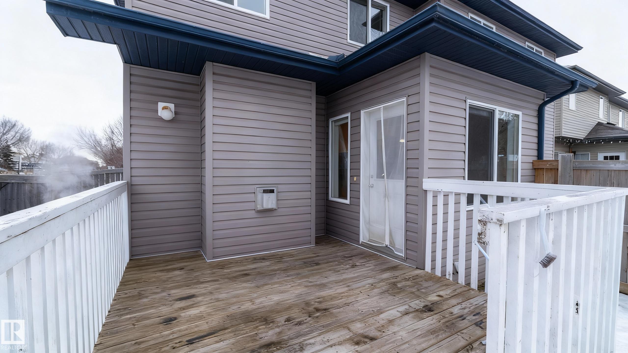 Welcome to the vibrant community of Rutherford. This stylish half duplex offers a fantastic opportunity with NO CONDO FEES and a smart, functional layout. The spacious front foyer provides access to the attached garage, a convenient two-piece bathroom, and a built-in desk ideal for a home office. The open-concept main floor features a bright kitchen with maple cabinetry, modern paint tones, and plenty of windows. A sunny breakfast nook overlooks the backyard and west-facing deck, while the cozy family room is anchored by a gas fireplace. Fresh paint and laminate flooring complete the main level. Upstairs offers three generously sized bedrooms, including a primary suite with a large window, walk-in closet, and private four-piece ensuite. Two additional bedrooms and another four-piece bathroom complete the upper level. The unfinished basement is ready for future development. Close to schools, parks, public transit, and all amenities.
