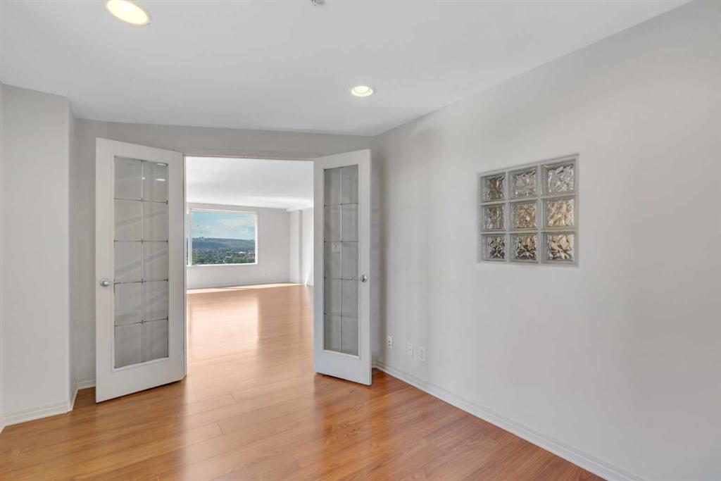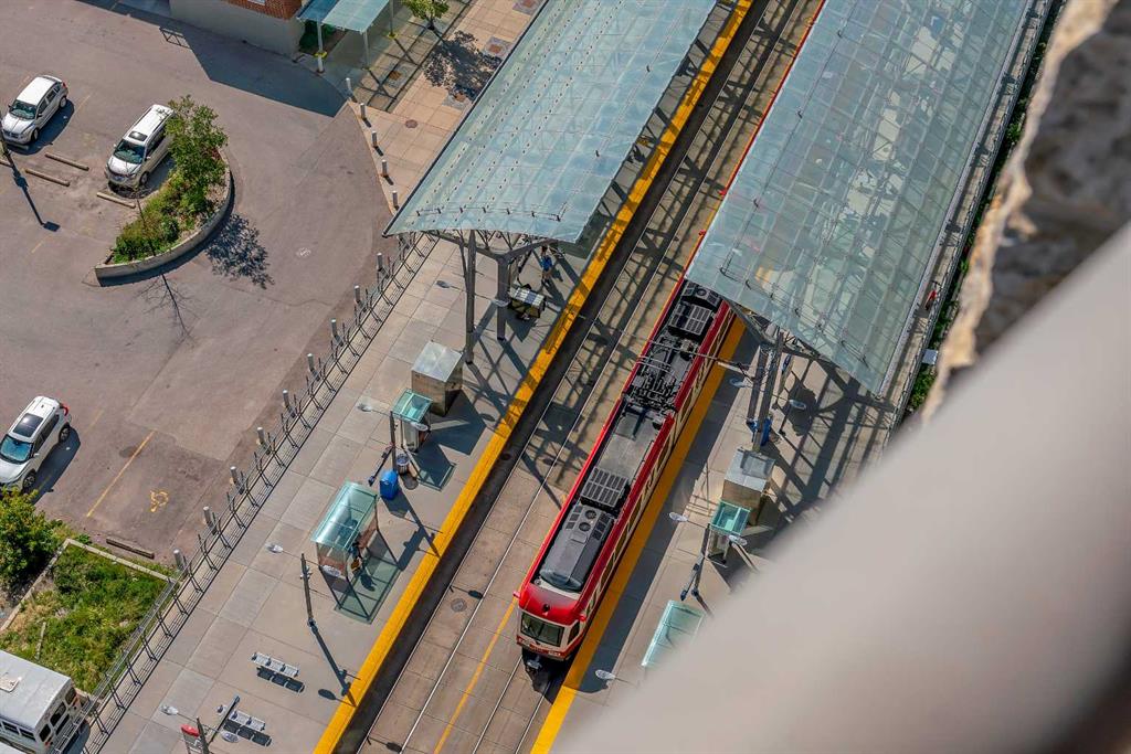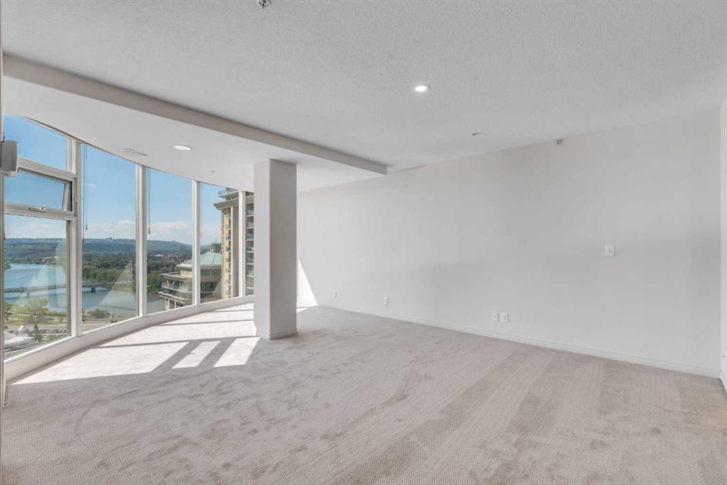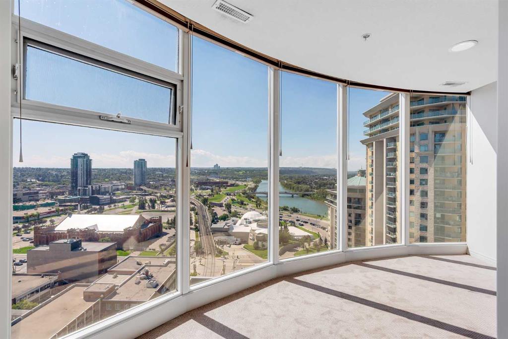 Unparalleled, Spectacular PANORAMIC VIEWS of the mountains, Bow River, and sparkling city lights! This nearly 1,600 sq. ft. luxury condo offers 2 bedrooms plus a den, 2 full baths, and 2 secure titled, underground parking stalls. Beautifully updated with hardwood floors, new carpet, fresh paint, and custom window coverings. Expansive windows fill the open living space with natural light, highlighting the raised panel cabinetry, granite countertops, pot lighting, and quality finishes throughout. Enjoy year-round comfort with full air conditioning and the sought-after south and west exposure. Ideally located in West Downtown with the Kerby LRT station right at your doorstep, and just steps to Shaw Millennium Park, river pathways, and all the conveniences of the city. Easy in-and-out access to downtown makes this the perfect urban retreat. This is the place to "right-size"!