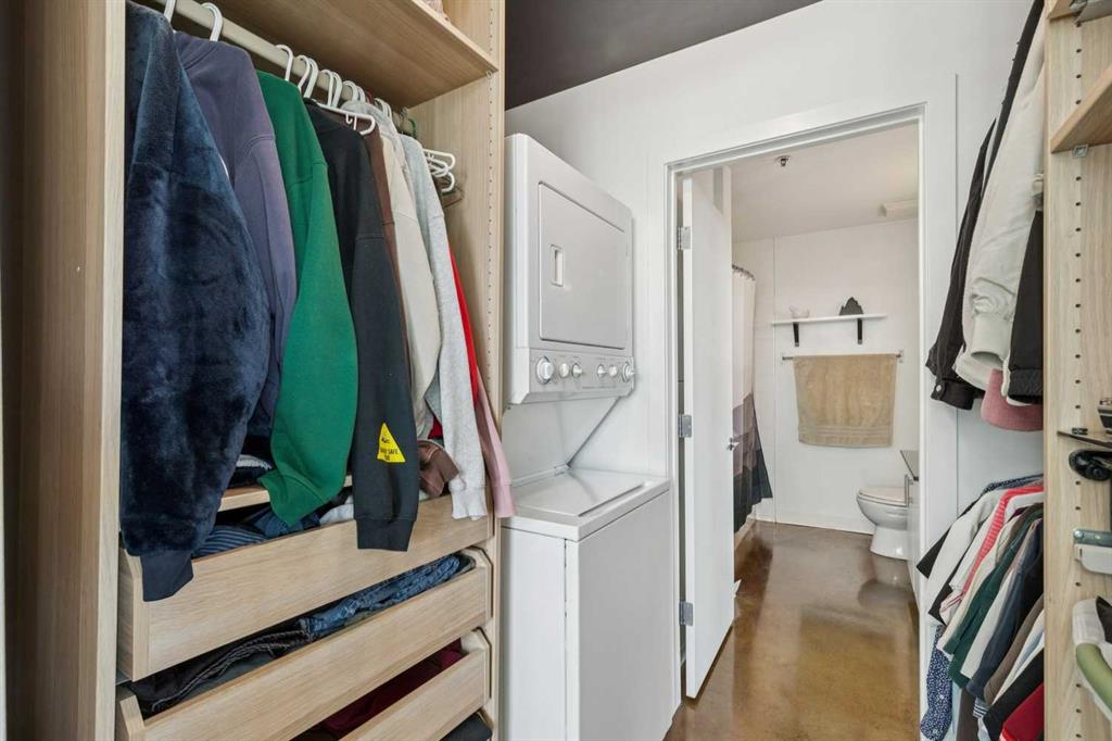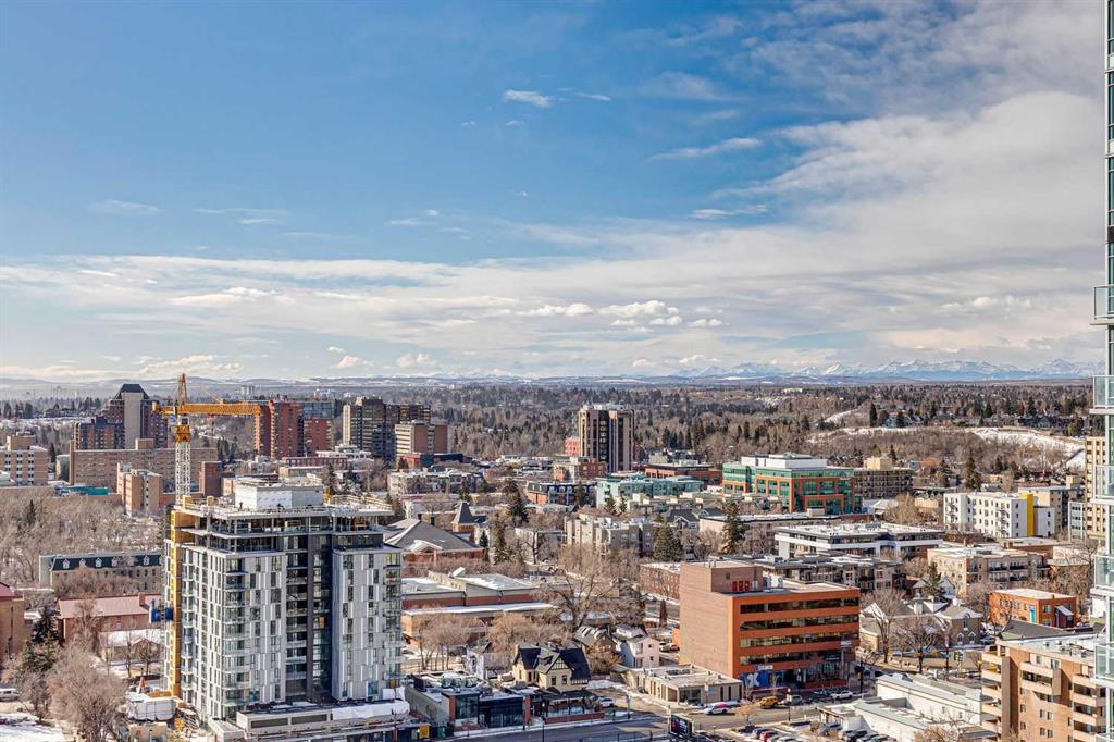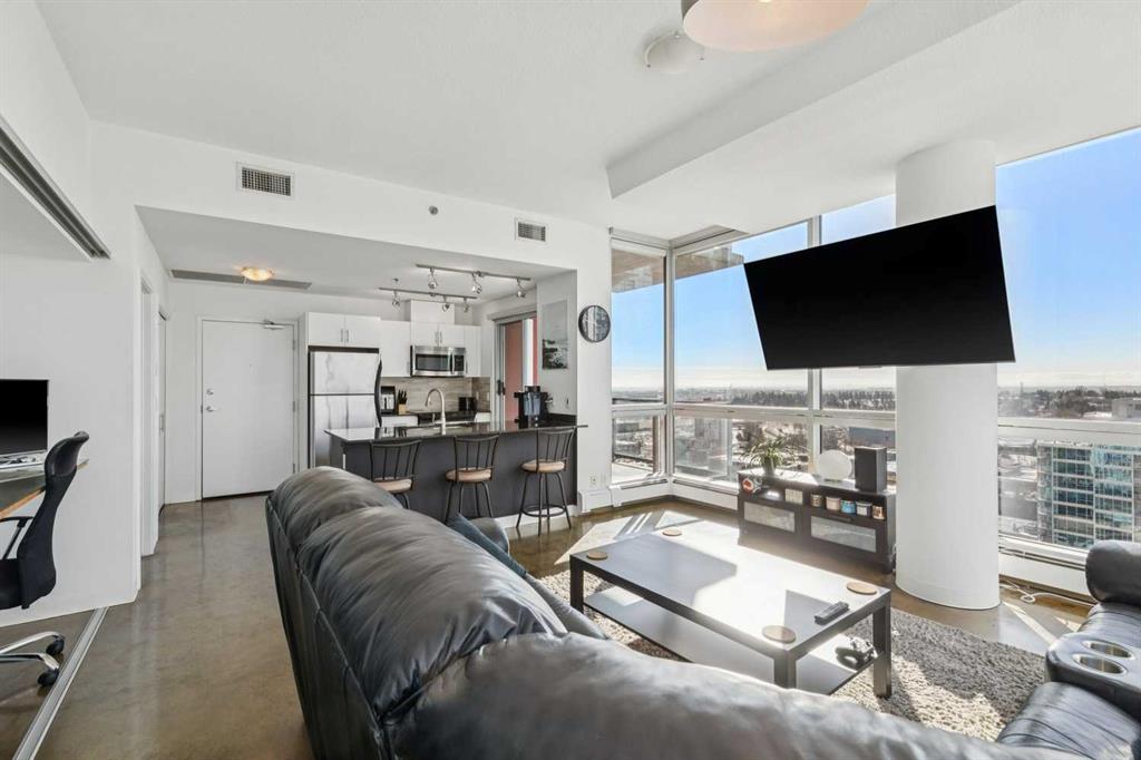 Perched high above the city on the 20th floor of Colours, this one bedroom, SW facing corner apartment offers a front row seat to some of Calgary’s most striking skyline views. With Stampede Park below, the downtown towers to the north, and the Rocky Mountains visible on clear days, the outlook feels more like a big city skyline than typical condo living. The unit offers approximately 635 square feet with a practical, open layout and 9.5 foot ceilings that add to the sense of space. Polished concrete floors run throughout, complemented by floor to ceiling windows that frame the view and bring in excellent natural light. The kitchen features granite countertops, stainless steel appliances, custom cabinetry, and a breakfast bar that connects easily to the main living area. A small office or den area provides a convenient work from home option, while the living space opens to a private balcony that extends the living area outdoors. The bedroom also enjoys full height windows and connects to a walk-through closet with built in organizers. The bathroom includes a soaker tub, granite vanity, and marble tile backsplash. Additional features include in suite laundry, titled underground parking, bike storage, and professional management. With restaurants, entertainment, transit, and the energy of the Beltline and Stampede district just outside your door, this home offers a true urban lifestyle with views that are hard to match. Call your favorite realtor today to book your private tour.