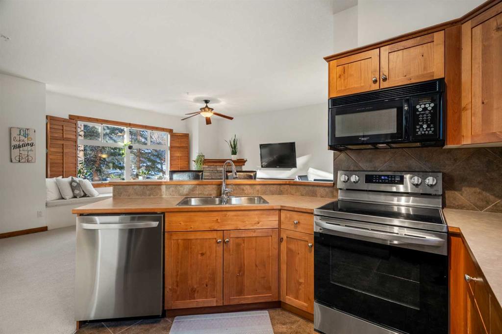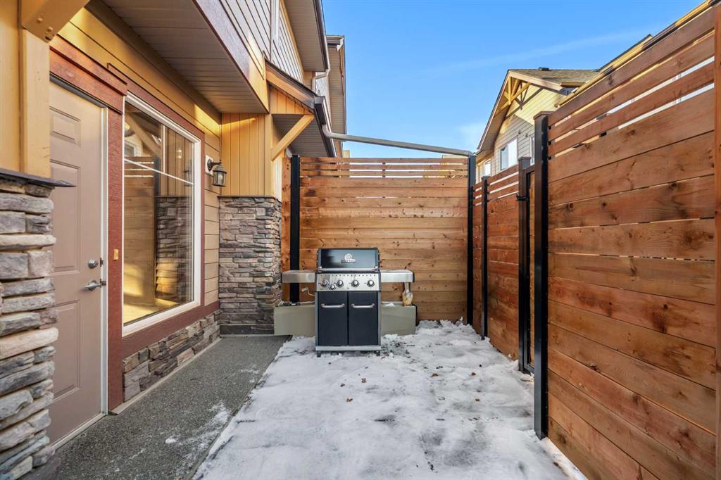 This spacious 2 bedroom end-unit townhouse at 201, 85 Dyrgas Gate immediately stands out for its wide, open-concept layout and exceptional natural light. The main living space feels airy and welcoming, with generous sightlines between the kitchen, dining, and living areas, making it ideal for both everyday living and entertaining. Large windows capture beautiful mountain views and excellent sun exposure throughout the day, while fresh, bright white paint enhances the clean, modern feel of the home. The kitchen is well-appointed with new appliances and flows seamlessly into the living area, which opens onto a private, fully enclosed rear patio, offering a quiet and sunny outdoor space that feels tucked away and protected. Thoughtfully integrated into the main floor is a built-in Murphy bed, subtly tucked away off the living room to comfortably accommodate guests when needed and completely out of the way when not in use. Upstairs, the two bedrooms are well-proportioned, with the primary bedroom featuring its own 2-piece ensuite and walk-in closet, in addition to a full bathroom serving the upper level and a convenient half bath on the main floor. In-floor heating efficiently complements the forced air furnace, providing comfortable and consistent warmth, particularly during the winter months. A rare and highly desirable double car garage sets this unit apart, offering excellent storage and secure parking that is increasingly hard to find in The Bow Valley. With reasonable condo fees and a location close to the new Gateway shopping centre, OLS school, Stewart Creek Golf club and an extensive network of walking and biking trails, this home offers an ideal blend of space, functionality, and mountain lifestyle in one of Canmore’s most accessible neighborhoods.