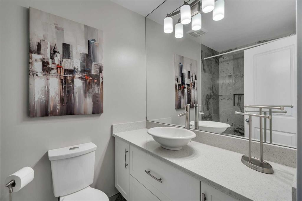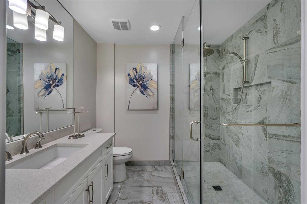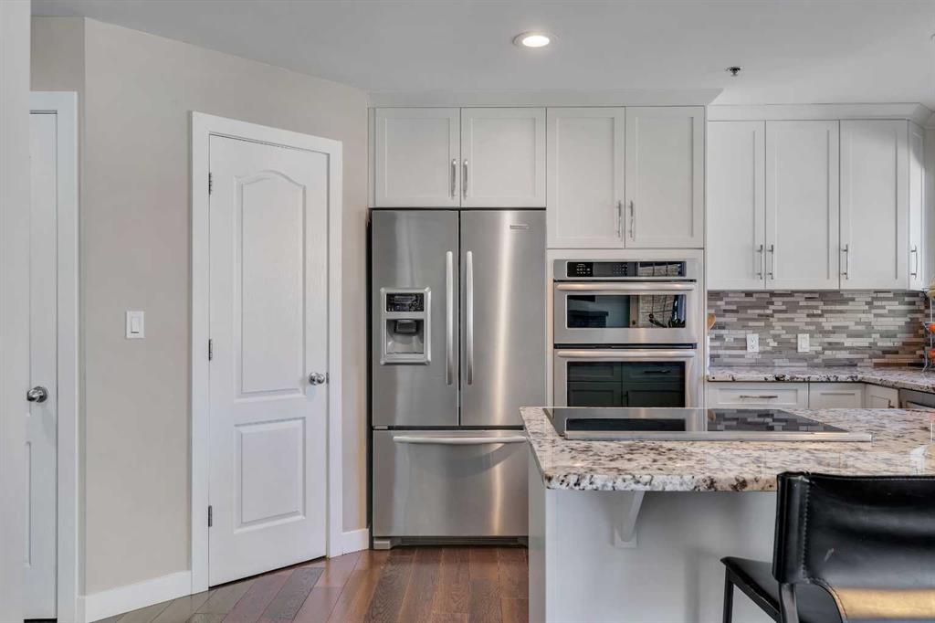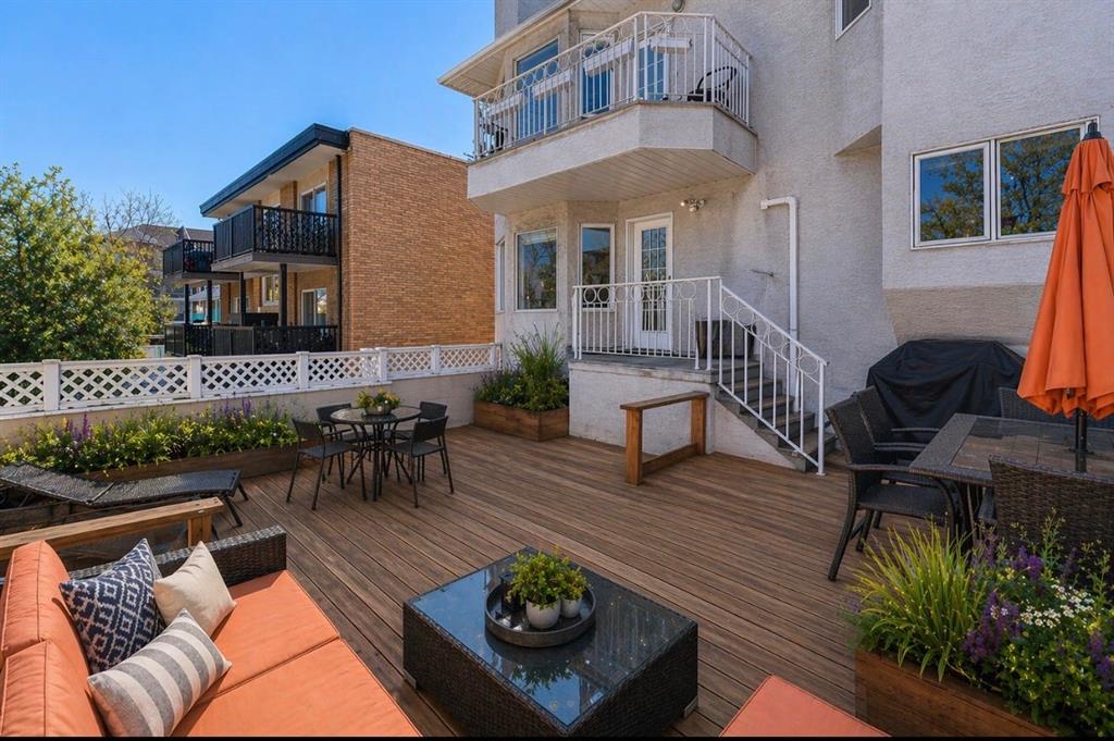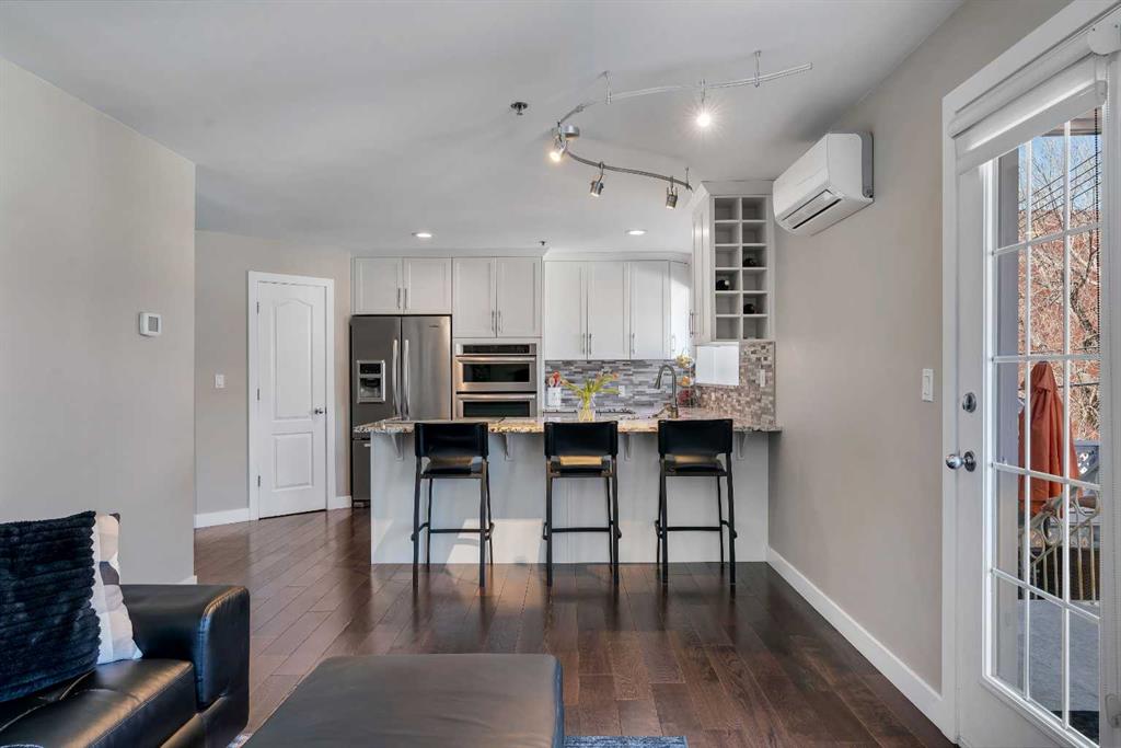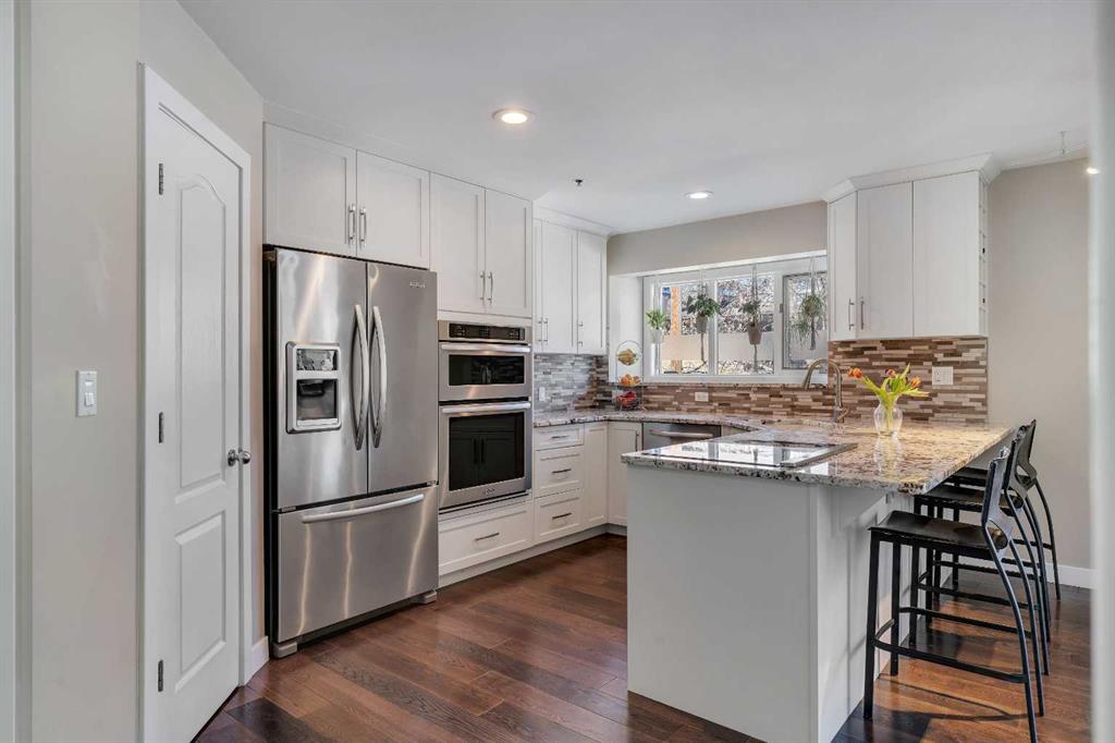 Tucked into the heart of Lower Mount Royal, this beautifully refreshed 2-bedroom, 2-bathroom condo offers the perfect blend of style, comfort, and inner-city living. Just steps from the vibrant shops, restaurants, and energy of 17th Avenue, this home delivers a walkable lifestyle while still feeling private, relaxed, and inviting. Inside, you’ll find a bright, contemporary custom kitchen by Superior Cabinets, complete with soft-close cabinetry, a sleek induction cooktop with downdraft hood fan, built-in oven and microwave, and a striking stone backsplash. The open-concept layout flows seamlessly into the living area, creating an ideal space for both everyday living and entertaining. The spacious primary bedroom easily accommodates a king-sized bed and features a beautifully finished ensuite with a custom tile and glass shower, premium Grohe fixtures, and stone flooring for a spa-inspired feel. The second bathroom is equally well appointed, offering quartz countertops, a tiled tub surround, and modern finishes throughout. A true standout is the impressive 700 sq. ft. multi-level patio — a rare outdoor retreat that feels more like a private courtyard. Perfect for summer dinners, weekend lounging, or evenings with friends, this exceptional space extends your living area outdoors in a way few condos can offer. Additional highlights include engineered hardwood flooring, in-floor heating, updated windows, and an oversized parking stall conveniently located close to the building entrance. With thoughtful upgrades, exceptional outdoor space, and an unbeatable location in one of Calgary’s most sought-after neighbourhoods, this Lower Mount Royal condo is a rare opportunity to enjoy the best of urban living.