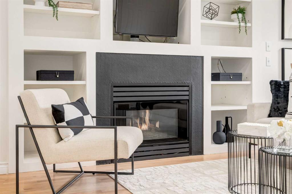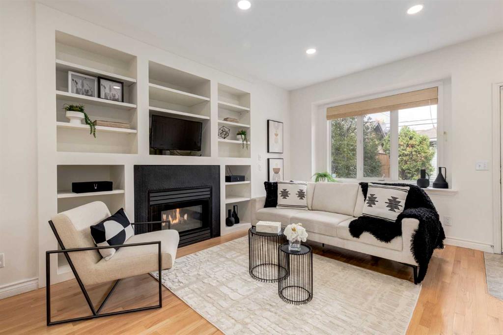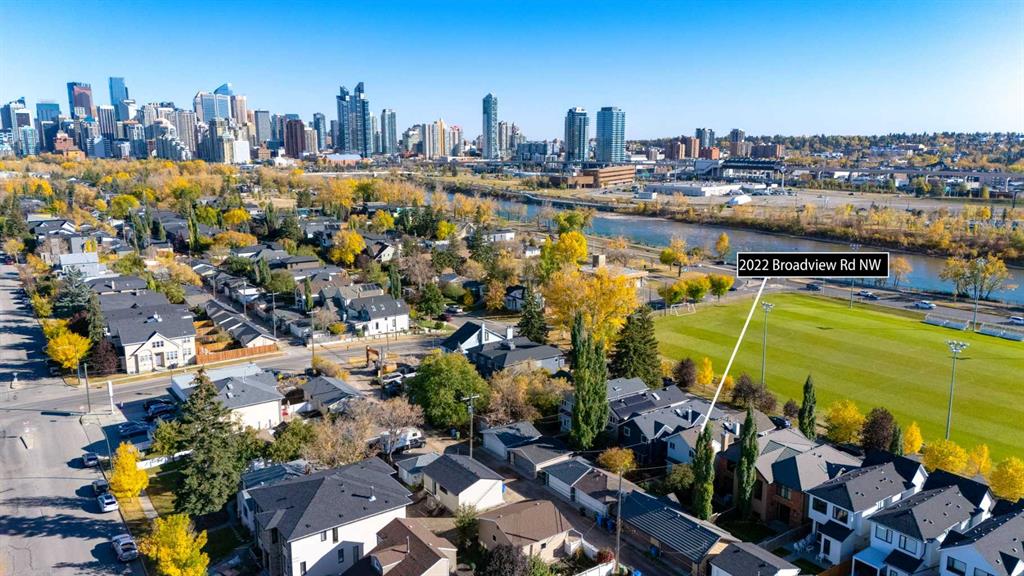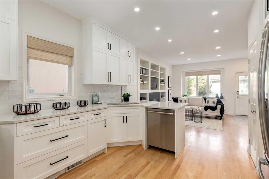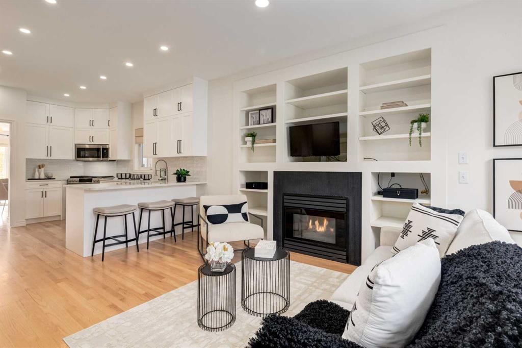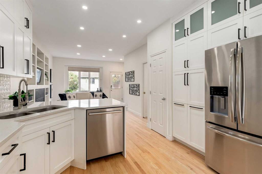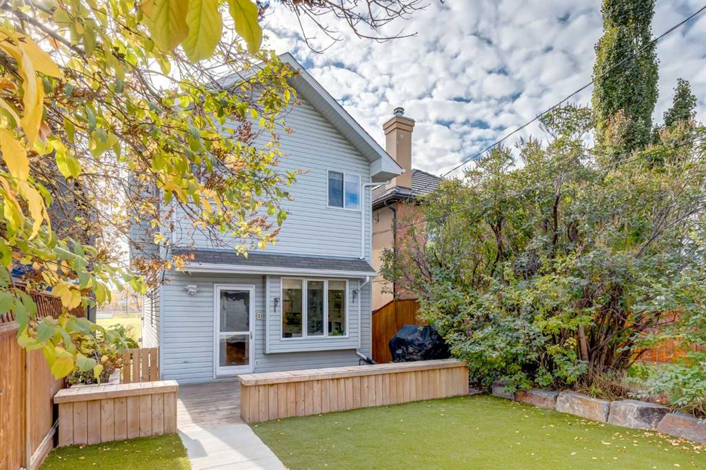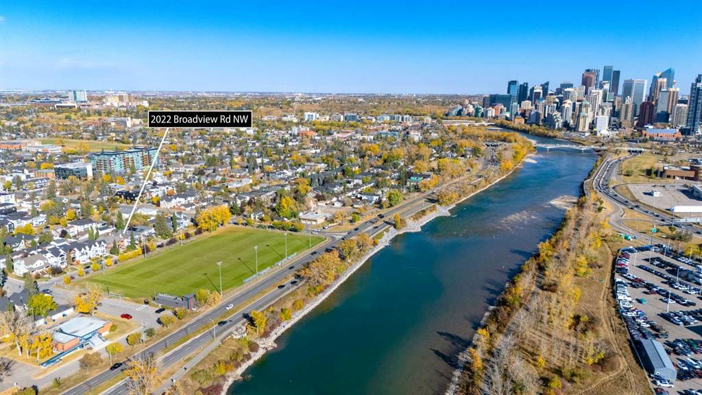 Front-row views across from a sprawling soccer field with sweeping vistas of the Bow River and Calgary’s West End skyline. This detached home offers exceptional curb appeal and meticulous landscaping front and back — featuring synthetic grass, natural boulders, and a sunny south-facing front patio with gas fire pit. Inside, you’ll find a bright and spacious layout that shows like new. The front living and dining rooms are bathed in natural light and finished with onsite hardwood, fresh white paint, and stylish lighting. The renovated kitchen boasts quartz counters, quality cabinetry, and an upgraded appliance package. A cozy rear family room with gas fireplace and built-ins opens to the backyard and double garage. The newly finished lower level impresses with high ceilings, large above-grade windows, a sprawling rec room, with a corner gas fireplace and wet bar. There is an elegant full bath, and a spacious bedroom. With a total of 4 bedrooms and 3.5 baths, the upper level showcases a primary suite with skyline views, dual closets, and a sitting nook. Fresh paint, new carpet, upper laundry, skylight, and built-in speakers complete this standout home — steps to Kensington, parks, cafes, and the river pathways.