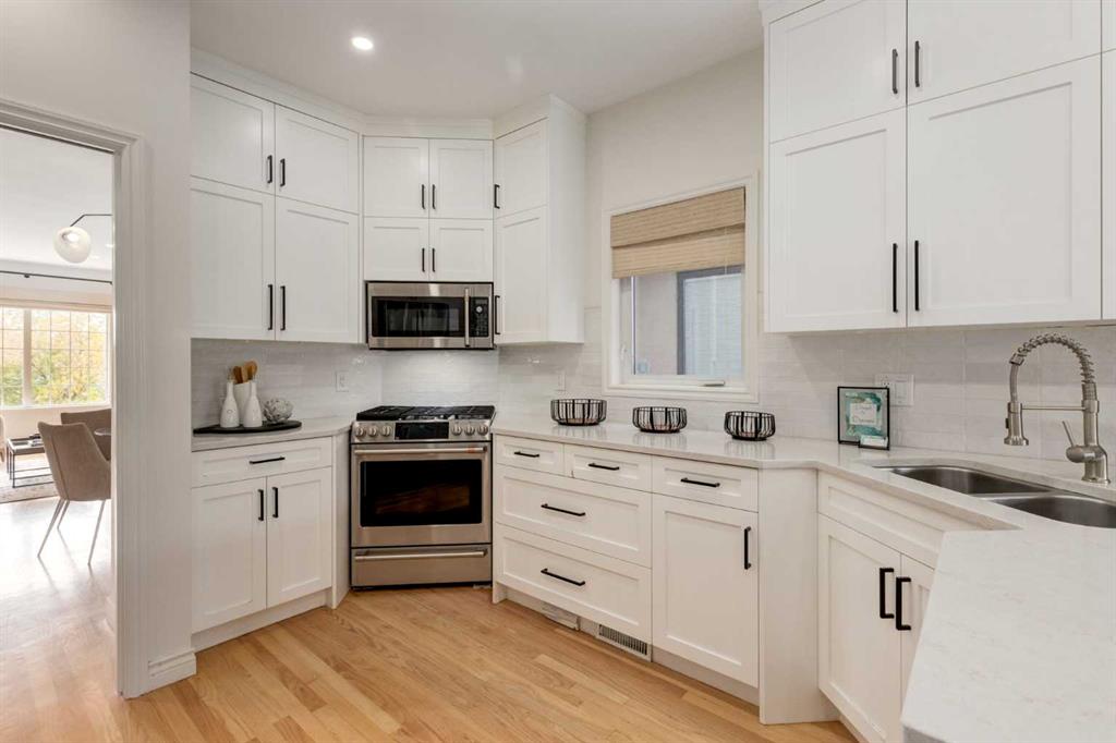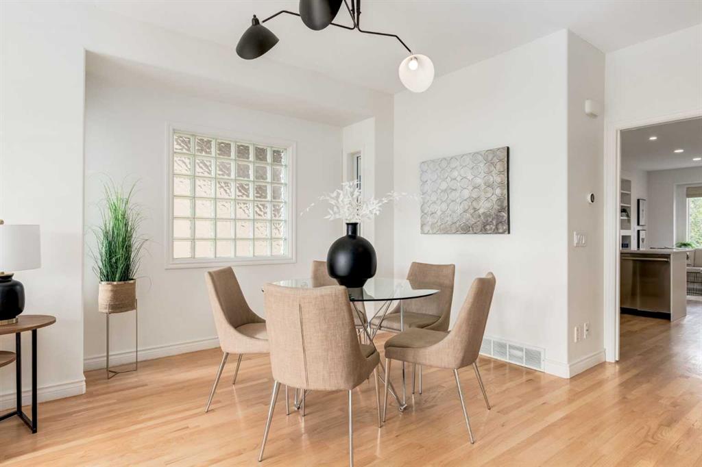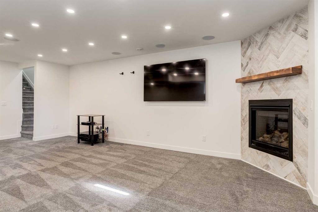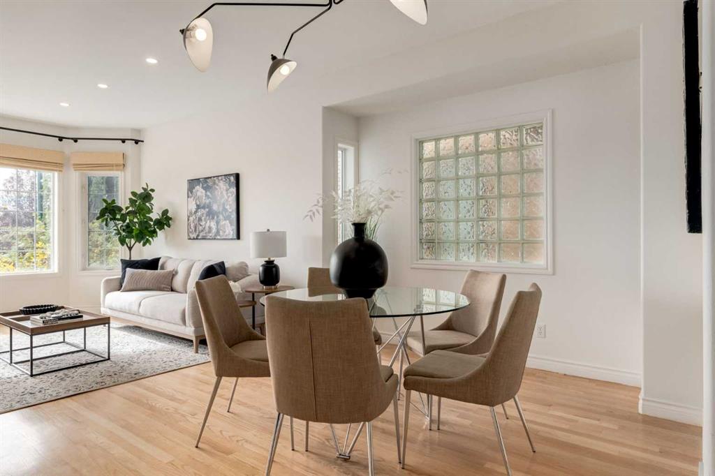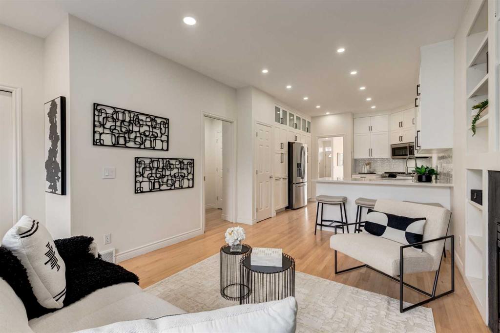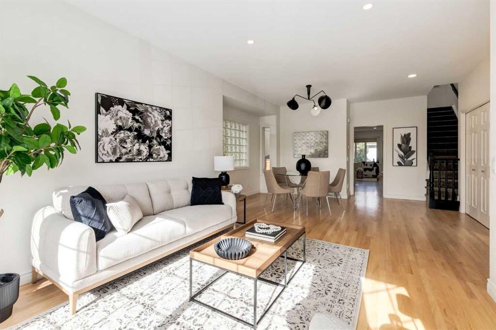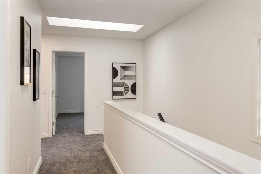Front-row views across from a sprawling soccer field with sweeping vistas of the Bow River and Calgary’s West End skyline. This detached home offers exceptional curb appeal and meticulous landscaping front and back — featuring synthetic grass, natural boulders, and a sunny south-facing front patio with gas fire pit. Inside, you’ll find a bright and spacious layout that shows like new. The front living and dining rooms are bathed in natural light and finished with onsite hardwood, fresh white paint, and stylish lighting. The renovated kitchen boasts quartz counters, quality cabinetry, and an upgraded appliance package. A cozy rear family room with gas fireplace and built-ins opens to the backyard and double garage. The newly finished lower level impresses with high ceilings, large above-grade windows, a sprawling rec room, with a corner gas fireplace and wet bar. There is an elegant full bath, and a spacious bedroom. With a total of 4 bedrooms and 3.5 baths, the upper level showcases a primary suite with skyline views, dual closets, and a sitting nook. Fresh paint, new carpet, upper laundry, skylight, and built-in speakers complete this standout home — steps to Kensington, parks, cafes, and the river pathways.