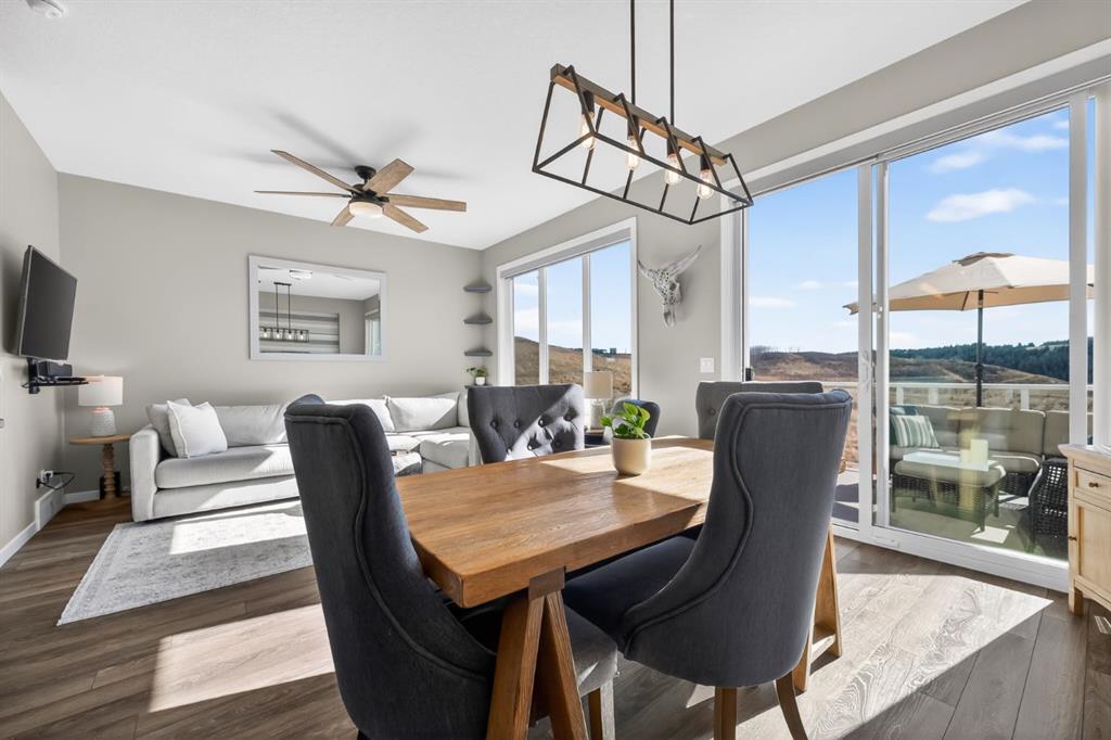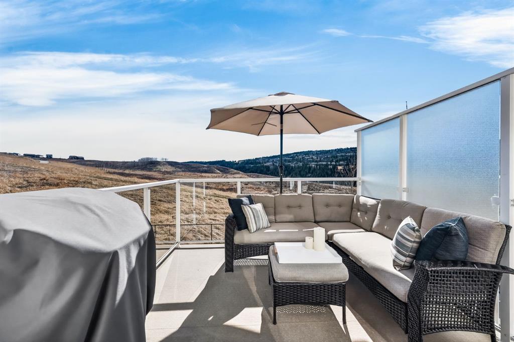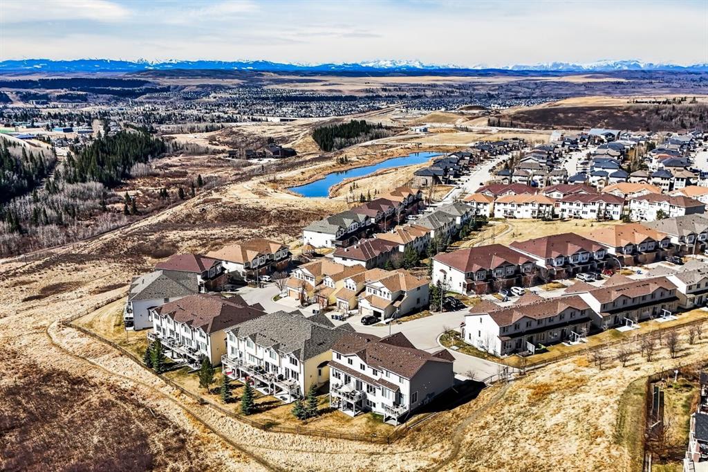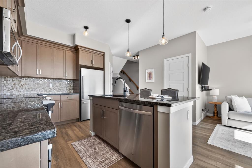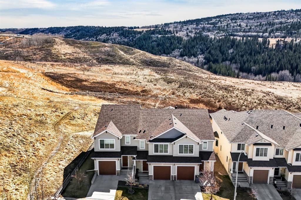 Welcome to 205 Sunset Point in beautiful Cochrane, Alberta. This is hands-down one of the best locations in the complex—tucked at the end of a quiet cul-de-sac with no through traffic, backing directly onto a stunning ravine with forest, rolling hills, and wildlife, plus private gated access to walking trails right out your door. Built by Calbridge and meticulously maintained, this 3 bed, 3.5 bath townhouse is move-in ready with the added confidence of an extended structural warranty until Feb 2027. Inside, you’ll find a bright, open feel with 9’ ceilings, large windows, neutral tones, and a spacious layout. The kitchen is a standout—featuring granite countertops, full-height cabinets with crown moulding, mosaic backsplash, Silgranite sink, pantry, island with breakfast bar, and newer stainless steel appliances (including a new fridge). The dining nook opens to your upper deck with Duradeck, glass railing, and privacy wall—perfect for taking in those unobstructed views. Upstairs offers three generous bedrooms, with 2 overlooking the ravine, plus a full bath and convenient laundry (with newer dryer). The primary suite sits on its own level for added privacy, complete with partial mountain views, a large walk-in closet with window, and a 4-piece ensuite with granite and tile finishes. The newly developed walkout basement (2025) adds incredible value—featuring a spacious rec room, 4-piece bath with heated floors, and direct access to a relaxing lower patio, all with continued views of the natural surroundings. You’ll also appreciate the new high-efficiency furnace and hot water tank. Additional highlights: Low condo fees, Single attached garage, Built-in vac rough-in, Extremely clean, pride of ownership throughout. This home offers a rare mix of privacy, views, upgrades, and location—all in a well-managed complex. Opportunities like this are few and far between. Don’t miss your chance to own one of the best units here.