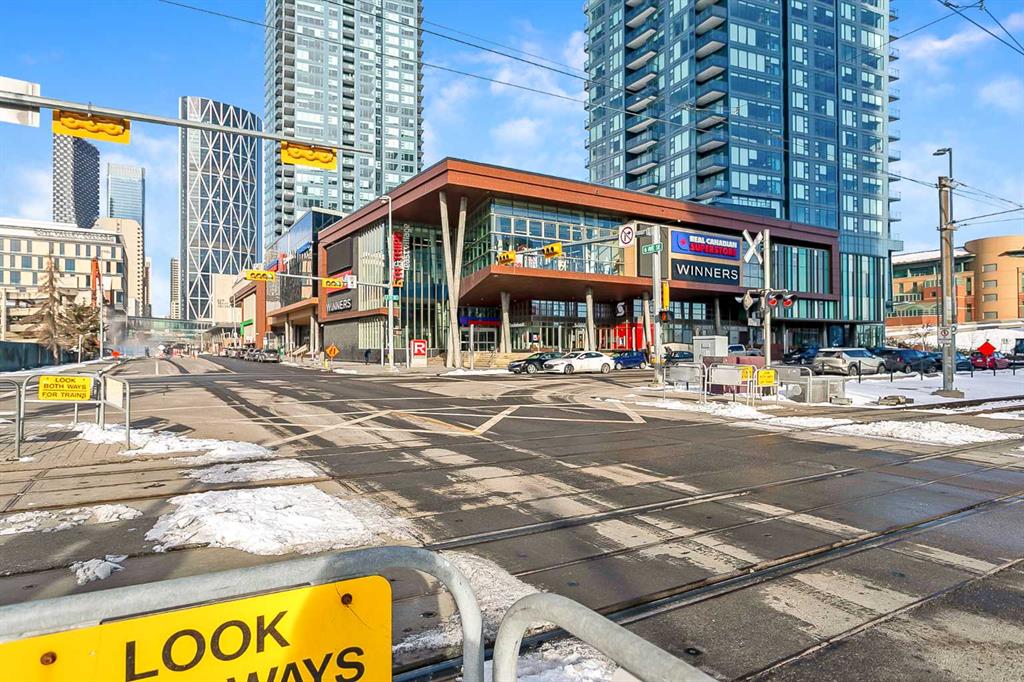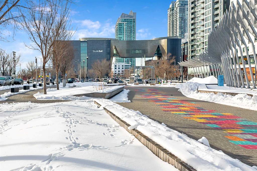 Welcome to the 21st floor of Evolution, where elevated living meets modern design in the heart of the city. This spacious 1,121 sqft unit offers a functional layout with a versatile front den that is perfect for a home office or flex space and the convenience of in-suite laundry. The kitchen is thoughtfully designed with granite countertops and a full-height granite backsplash, under-cabinet lighting, two-toned cabinetry, and a eating bar. The dining area is bathed in natural light, while the expansive living room offers flexibility to accommodate a variety of furniture options. Enjoy stunning northeast-facing views of the Bow River, along with breathtaking sunrises that fill the home with natural light creating a bright and inviting atmosphere throughout the day. The primary bedroom features a walkthrough closet leading to a stunning 5-piece ensuite complete with heated floors, dual sinks, granite countertops, a soaker tub, and a 10mm glass shower. The second bedroom is generously sized with ample closet space, and the additional 3-piece bathroom also includes heated floors, granite counters, and a 10mm glass shower. Residents of Evolution enjoy premium amenities located on the second floor, including a fully equipped fitness centre, sauna, party room, and rooftop patio. This unit includes one assigned underground parking stall and a storage locker.