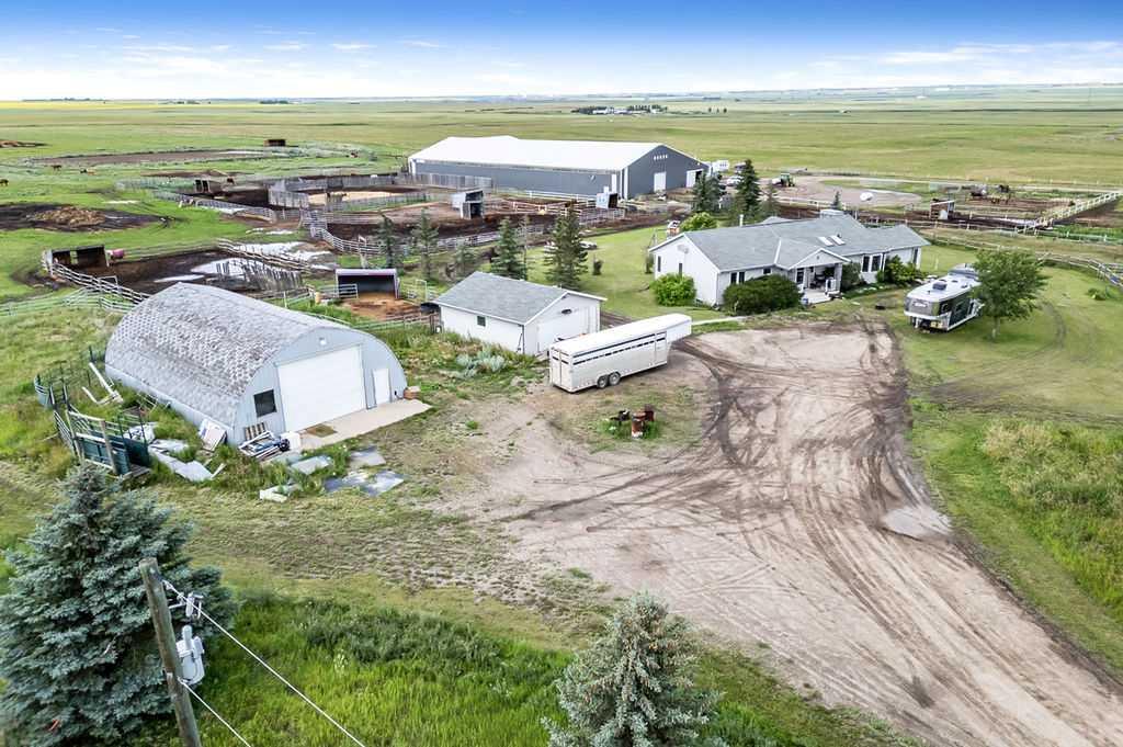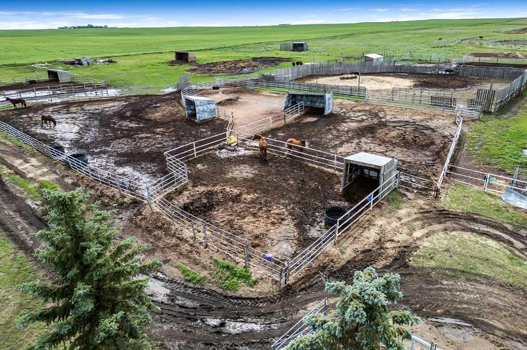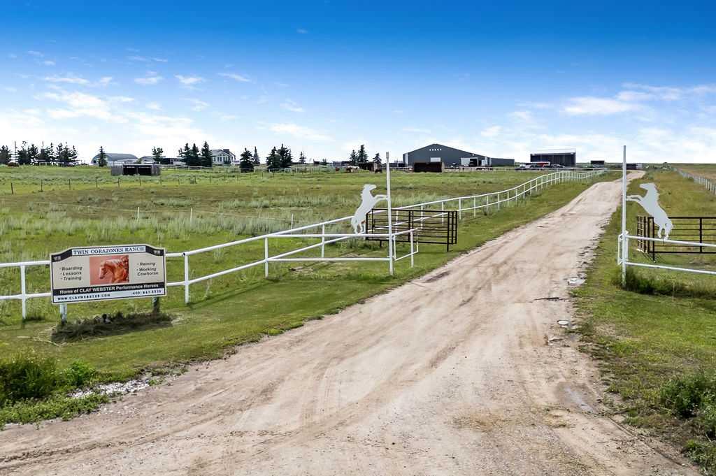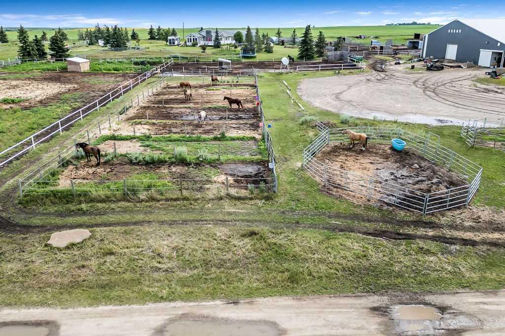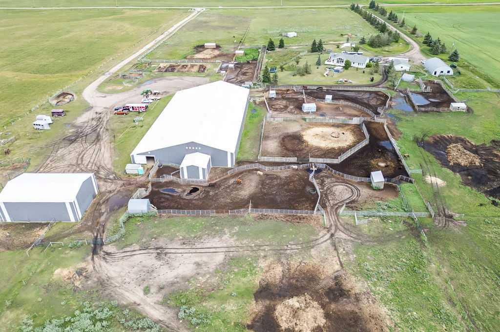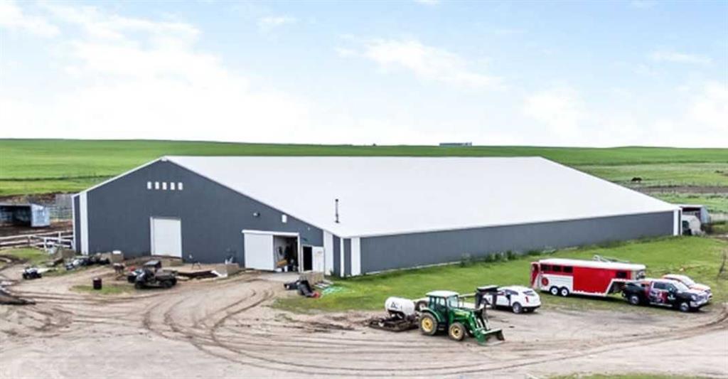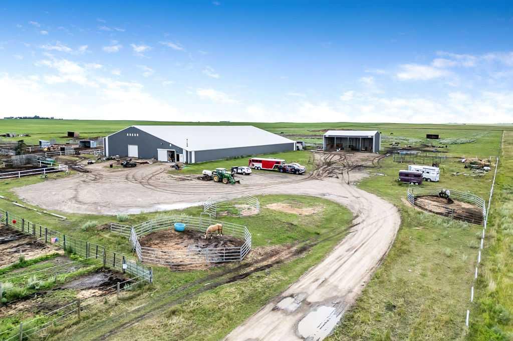 PRICE REDUCTION!! This property ticks all of the boxes for the serious HORSEPERSON! On this level 40 ACRE parcel you and your horses will find your own retreat from rain,wind, snow, misquitoes,heat and can ride 24 hours a day in the 180'x80' bright,heated INDOOR RIDING ARENA! Saddle up next door in the ATTACHED 12 STALL BARN ( 24'x80'- 9 with auto waterers) with a wash rack and separate tack room! For boarders there are 14 double wide individual tack lockers. On the nicer days enjoy the large OUTDOOR panelled ARENA ( 130'X240') or just turn your horse out to graze on the 30 + acres of pasture. Several individual turn out pens with shelters and shared waterers(5) and a 48'x60' HAY SHED ( built in 2015)complete this nicely located EQUINE FACILITY just 30 minutes from Okotoks! Other nice additions to this property are a 32' x48' quonset with concrete floor to park the RV or horse trailer and a 24'x26' double detached fully drywalled garage. The 1845ft2 4 BEDROOM,3 BATHROOM BUNGALOW is nicely laid out and is bright and flooded with SUNLIGHT form skylights and large west facing windows in the living room and is very accomodating for entertaining or a large family. The lower level is fully developed with a huge 4th bedroom,3 piece bath and a large recreation room with tons of storage! This property is a good opportunity for anyone interested in aquiring a full training facility at an affordable price and is willing to make their own further improvements to build equity and enjoy their passion for horses!