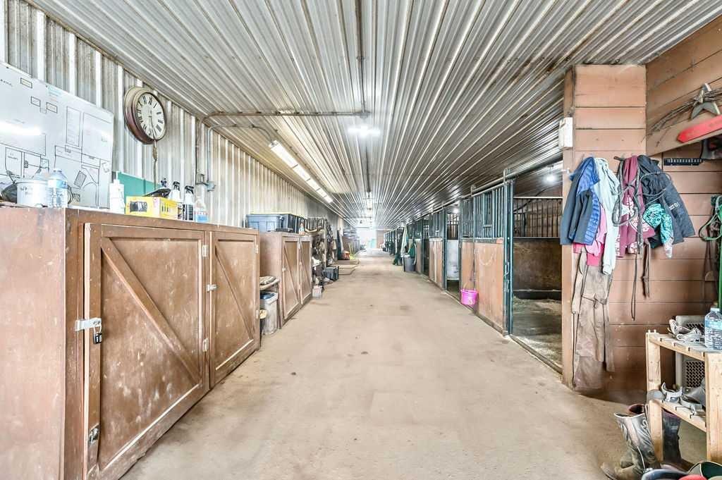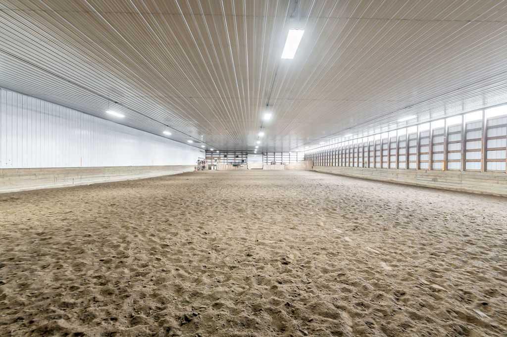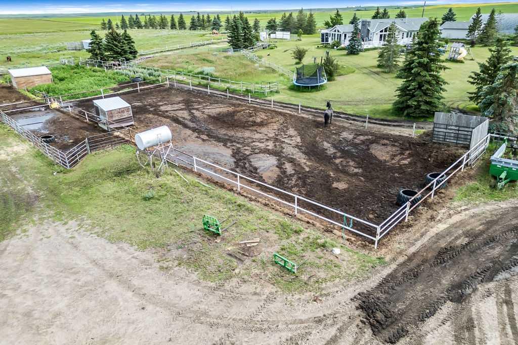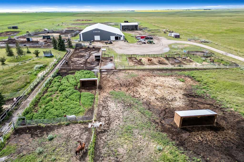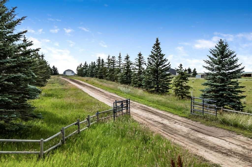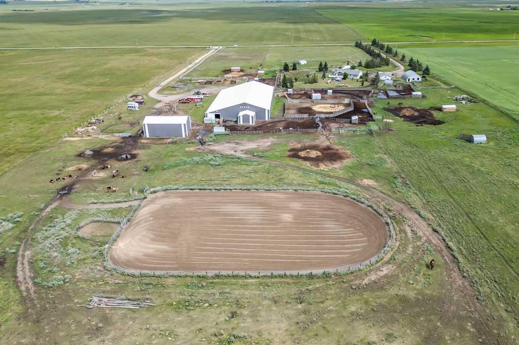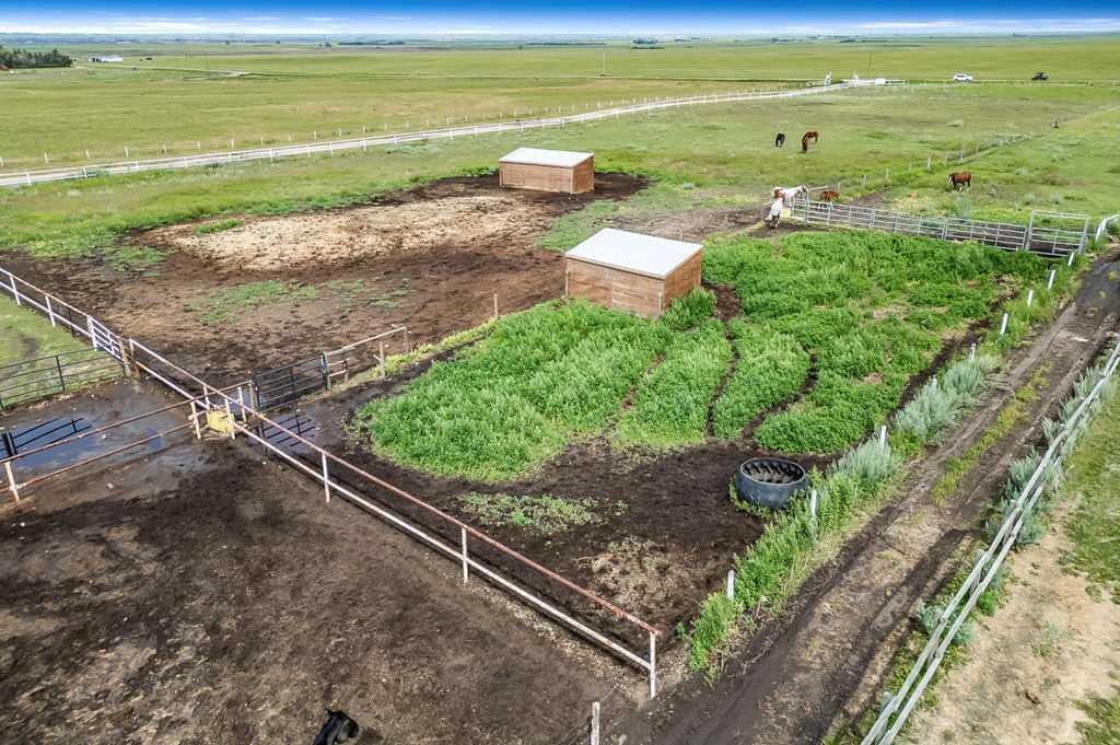 PRICE REDUCTION!! This property ticks all of the boxes for the serious HORSEPERSON! On this level 40 ACRE parcel you and your horses will find your own retreat from rain,wind, snow, misquitoes,heat and can ride 24 hours a day in the 180'x80' bright,heated INDOOR RIDING ARENA! Saddle up next door in the ATTACHED 12 STALL BARN ( 24'x80'- 9 with auto waterers) with a wash rack and separate tack room! For boarders there are 14 double wide individual tack lockers. On the nicer days enjoy the large OUTDOOR panelled ARENA ( 130'X240') or just turn your horse out to graze on the 30 + acres of pasture. Several individual turn out pens with shelters and shared waterers(5) and a 48'x60' HAY SHED ( built in 2015)complete this nicely located EQUINE FACILITY just 30 minutes from Okotoks! Other nice additions to this property are a 32' x48' quonset with concrete floor to park the RV or horse trailer and a 24'x26' double detached fully drywalled garage. The 1845ft2 4 BEDROOM,3 BATHROOM BUNGALOW is nicely laid out and is bright and flooded with SUNLIGHT form skylights and large west facing windows in the living room and is very accomodating for entertaining or a large family. The lower level is fully developed with a huge 4th bedroom,3 piece bath and a large recreation room with tons of storage! This property is a good opportunity for anyone interested in aquiring a full training facility at an affordable price and is willing to make their own further improvements to build equity and enjoy their passion for horses!
