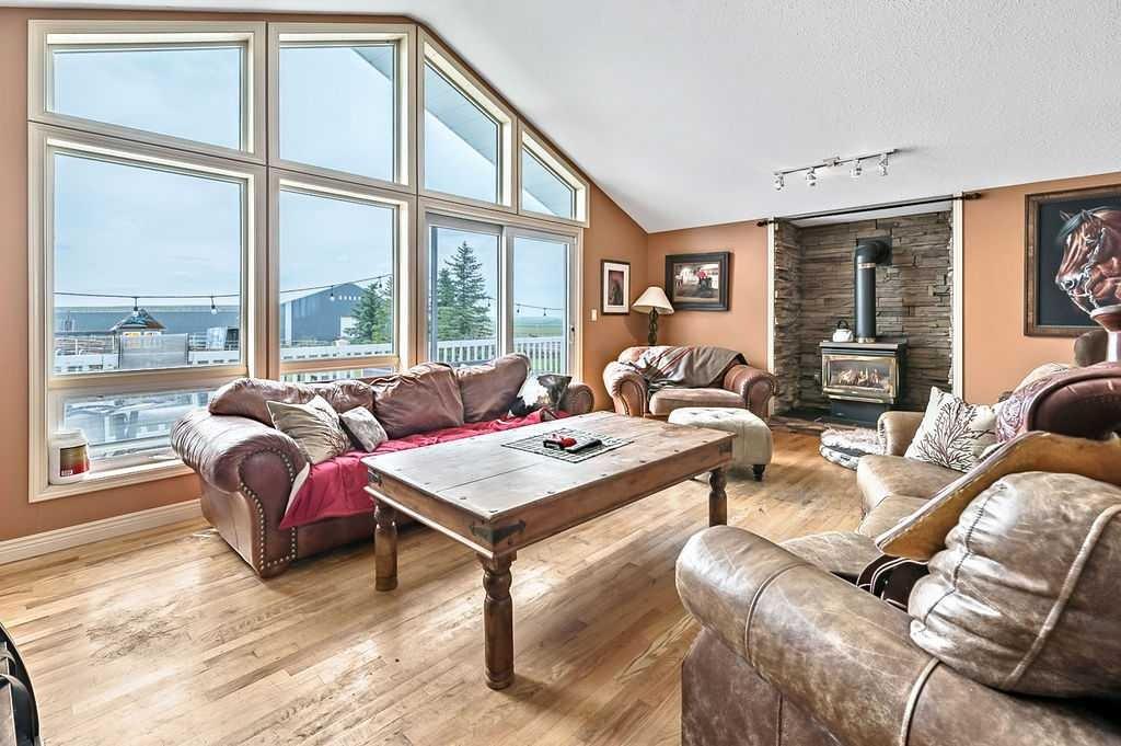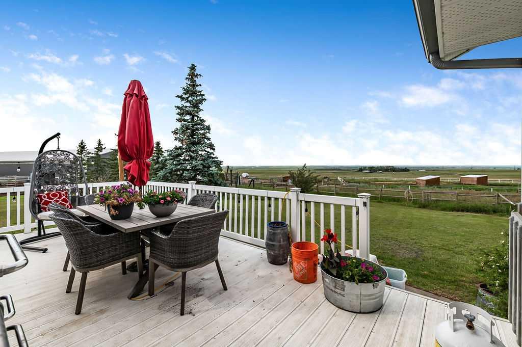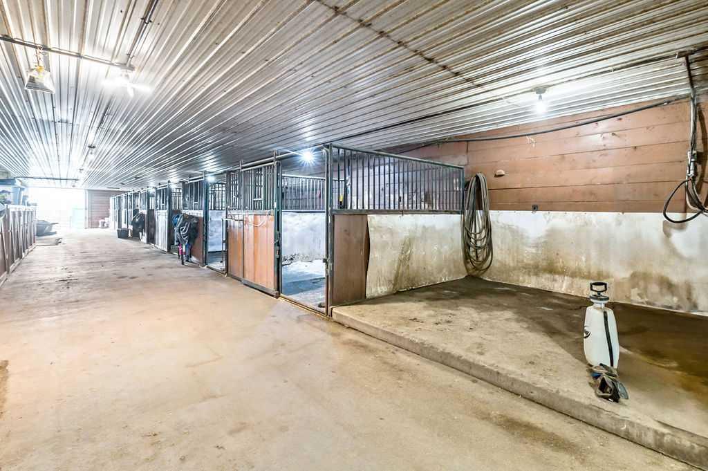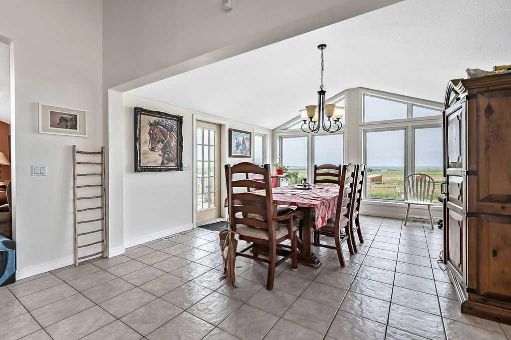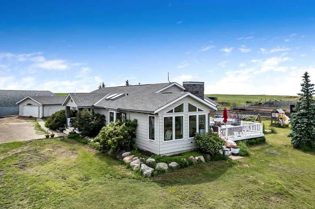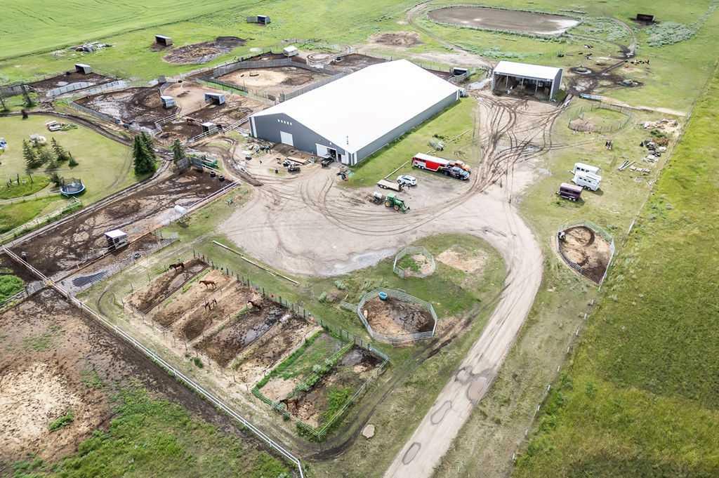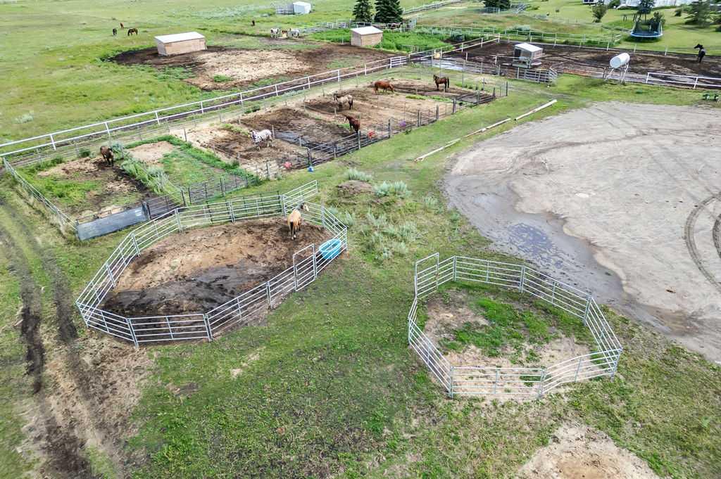 PRICE REDUCTION!! This property ticks all of the boxes for the serious HORSEPERSON! On this level 40 ACRE parcel you and your horses will find your own retreat from rain,wind, snow, misquitoes,heat and can ride 24 hours a day in the 180'x80' bright,heated INDOOR RIDING ARENA! Saddle up next door in the ATTACHED 12 STALL BARN ( 24'x80'- 9 with auto waterers) with a wash rack and separate tack room! For boarders there are 14 double wide individual tack lockers. On the nicer days enjoy the large OUTDOOR panelled ARENA ( 130'X240') or just turn your horse out to graze on the 30 + acres of pasture. Several individual turn out pens with shelters and shared waterers(5) and a 48'x60' HAY SHED ( built in 2015)complete this nicely located EQUINE FACILITY just 30 minutes from Okotoks! Other nice additions to this property are a 32' x48' quonset with concrete floor to park the RV or horse trailer and a 24'x26' double detached fully drywalled garage. The 1845ft2 4 BEDROOM,3 BATHROOM BUNGALOW is nicely laid out and is bright and flooded with SUNLIGHT form skylights and large west facing windows in the living room and is very accomodating for entertaining or a large family. The lower level is fully developed with a huge 4th bedroom,3 piece bath and a large recreation room with tons of storage! This property is a good opportunity for anyone interested in aquiring a full training facility at an affordable price and is willing to make their own further improvements to build equity and enjoy their passion for horses!